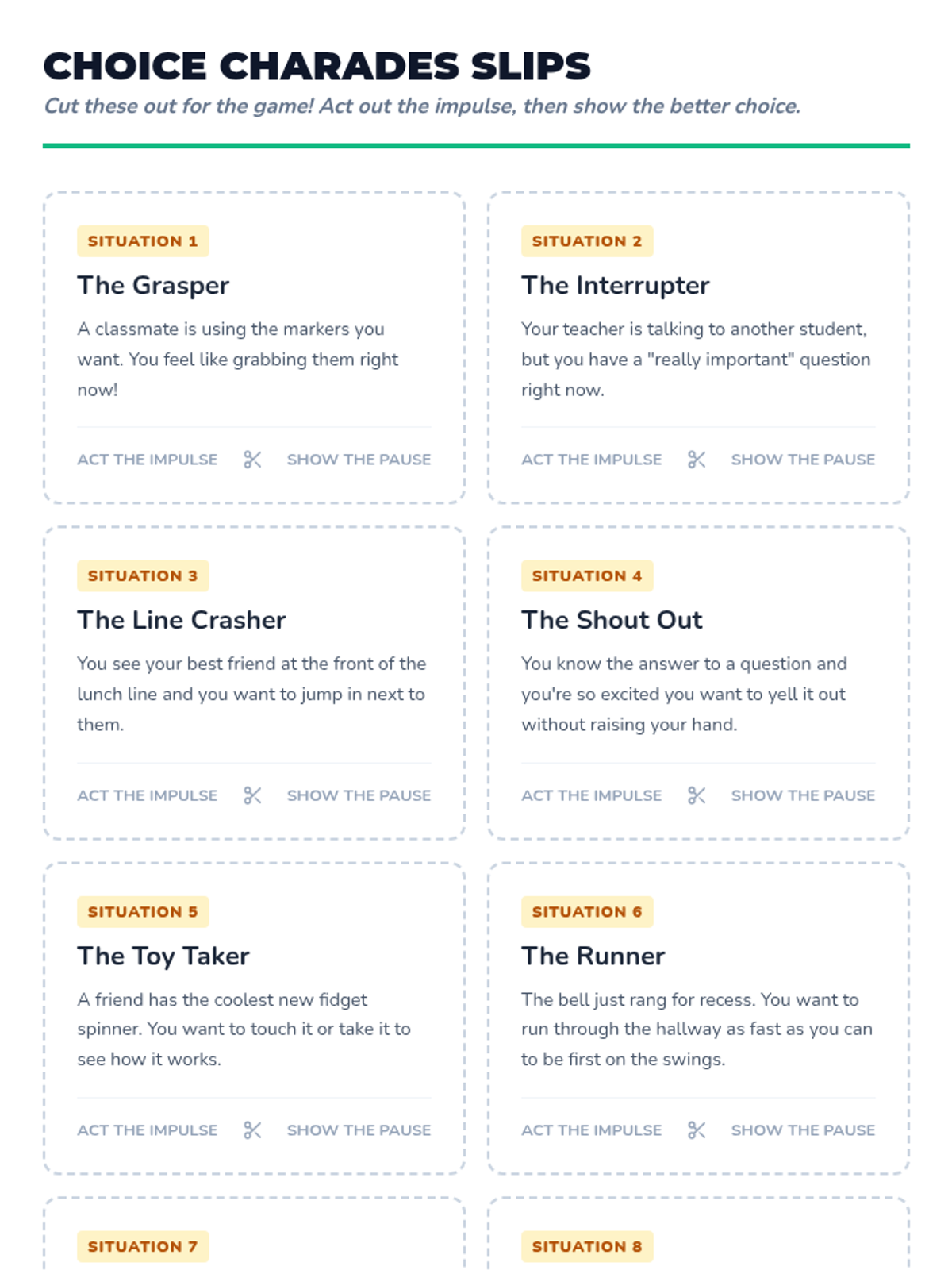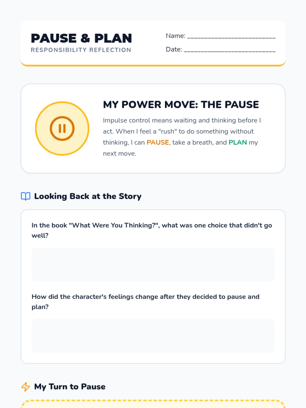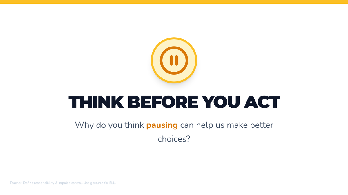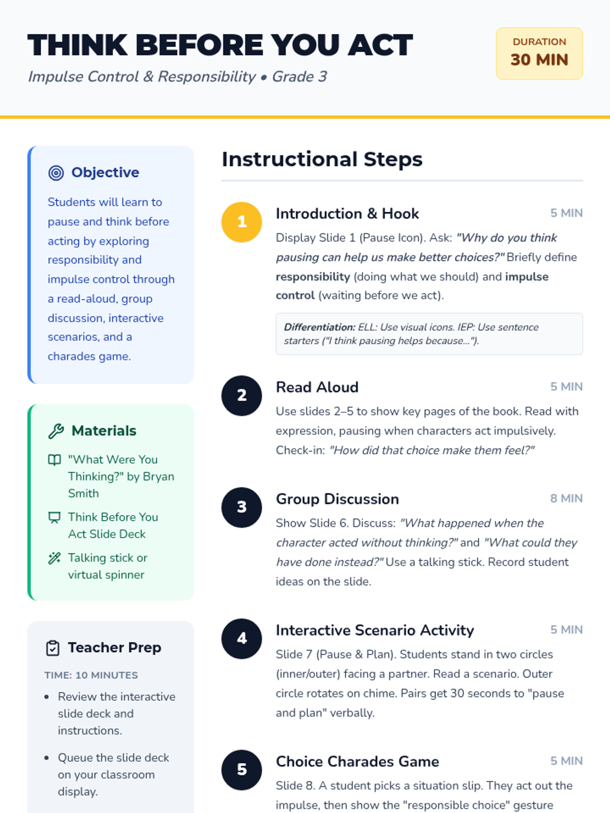A 30-minute social-emotional learning lesson for third graders focused on responsibility and impulse control using the book 'What Were You Thinking?' by Bryan Smith. Students will practice pausing and planning through interactive discussions, movement activities, and a charades game.