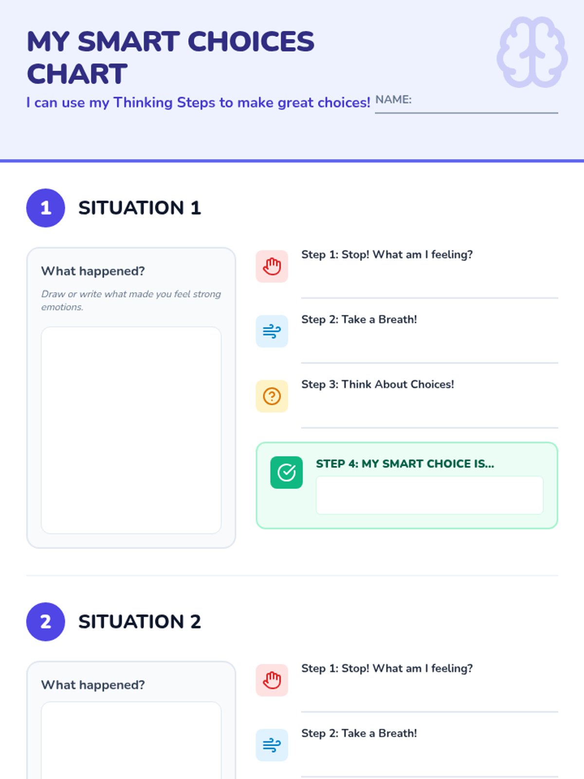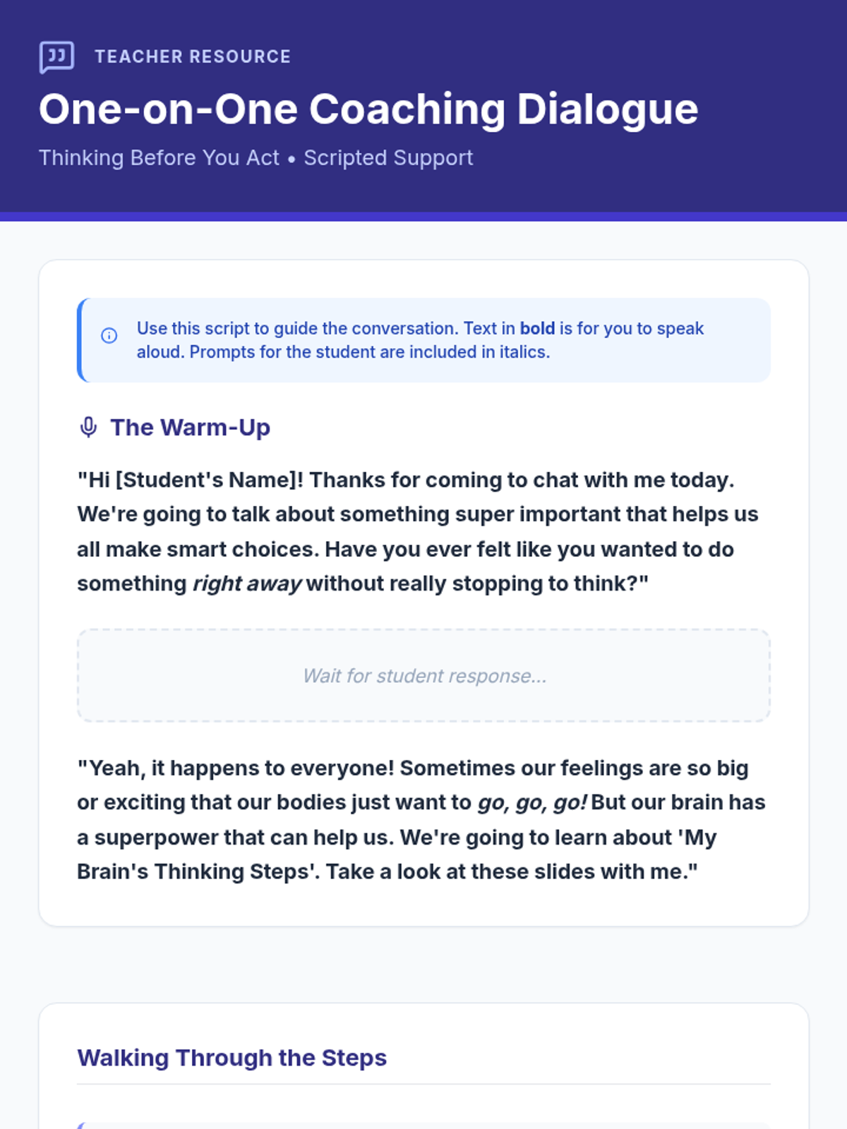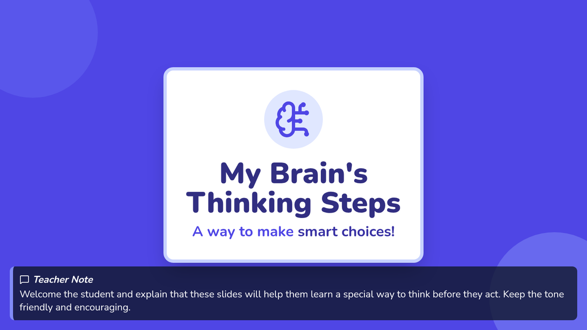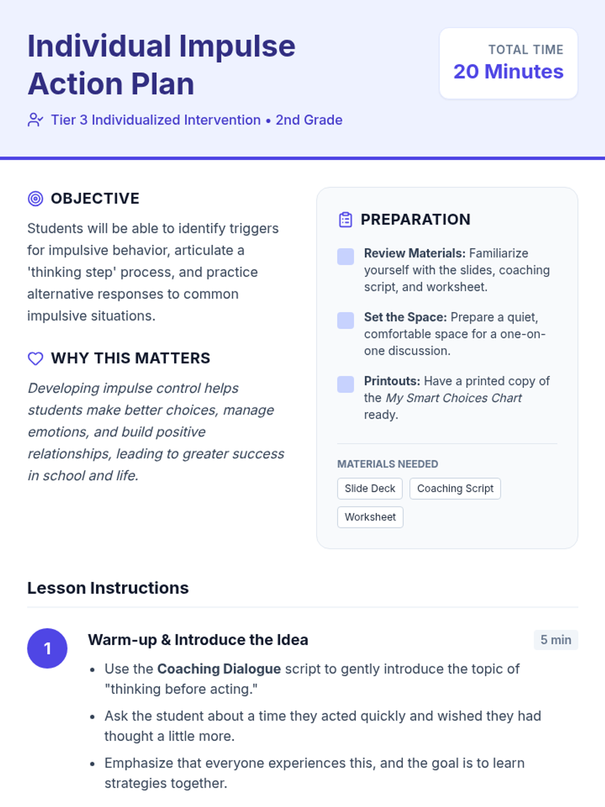 An individualized Tier 3 lesson designed for 2nd-grade students to develop impulse control through a guided 4-step thinking process. The lesson includes a coaching script, visual slides, and a personalized action chart to help students navigate big feelings and make smart choices.