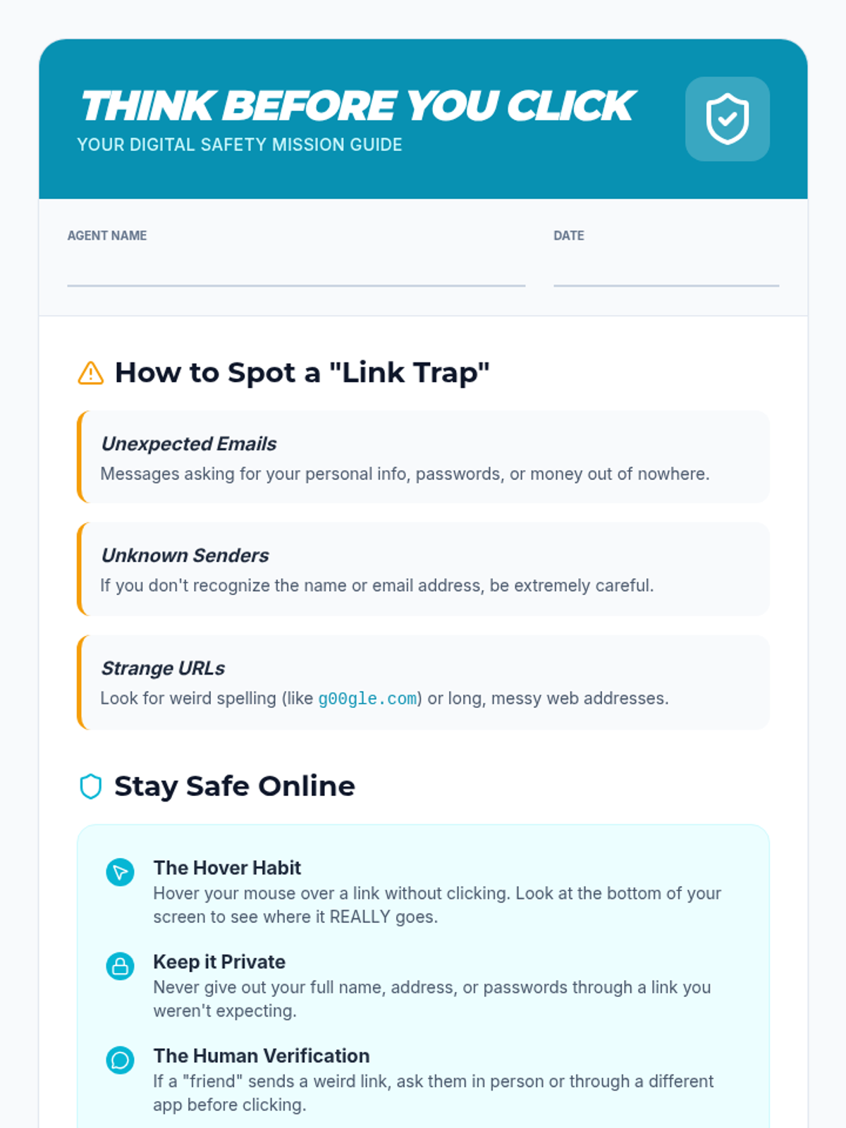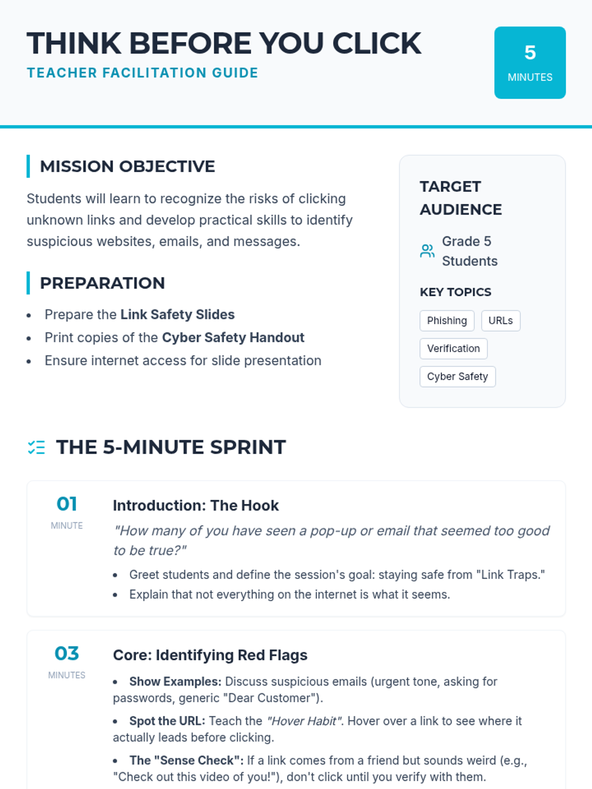 A quick 5-minute lesson for Grade 5 students on digital safety, focusing on recognizing and avoiding suspicious links and phishing attempts.