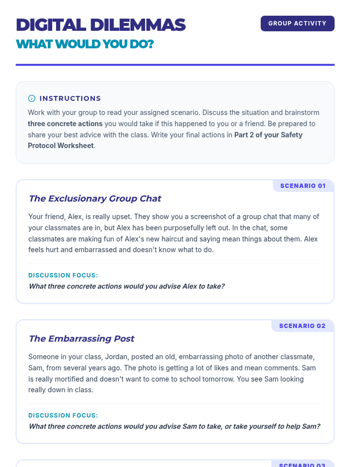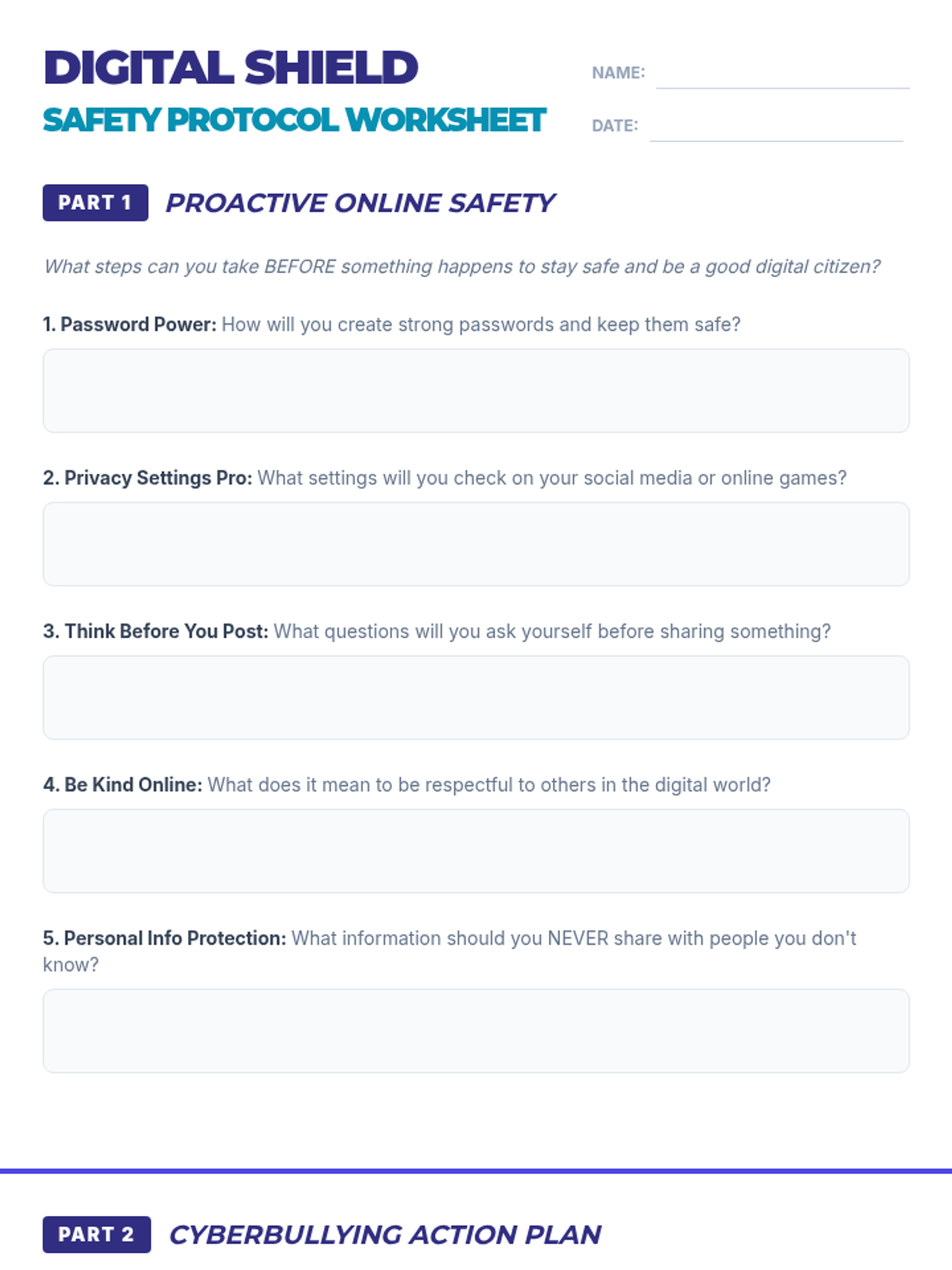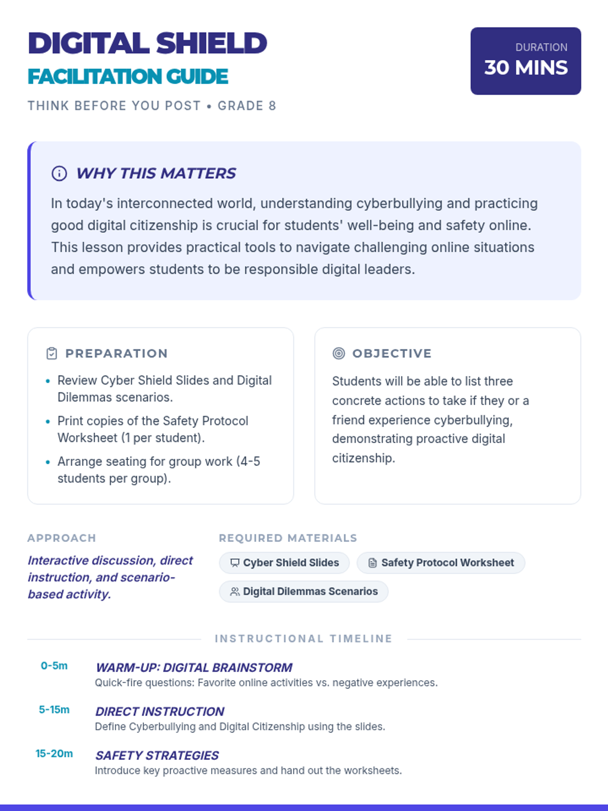 This lesson empowers 8th-grade students to navigate the digital world safely and kindly. They will learn to identify cyberbullying, understand digital citizenship, and develop practical strategies for online safety. This single 30-minute session will equip them with essential life skills for responsible online interactions.
