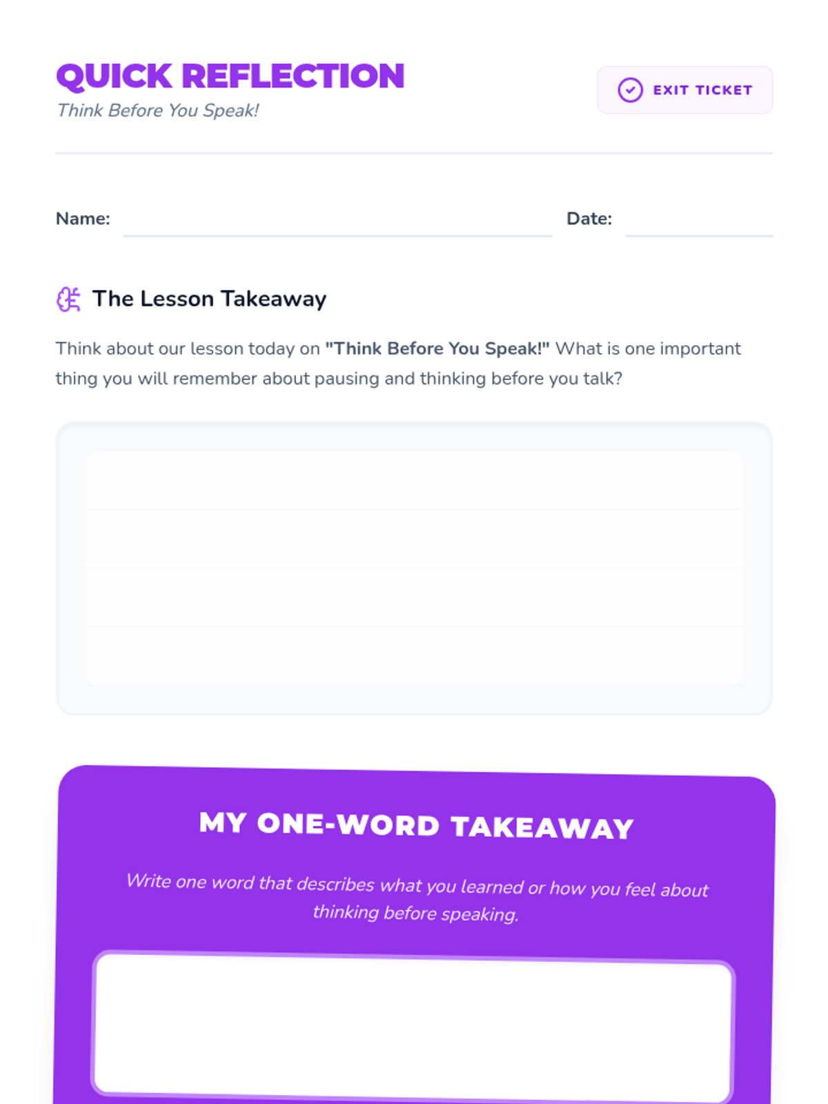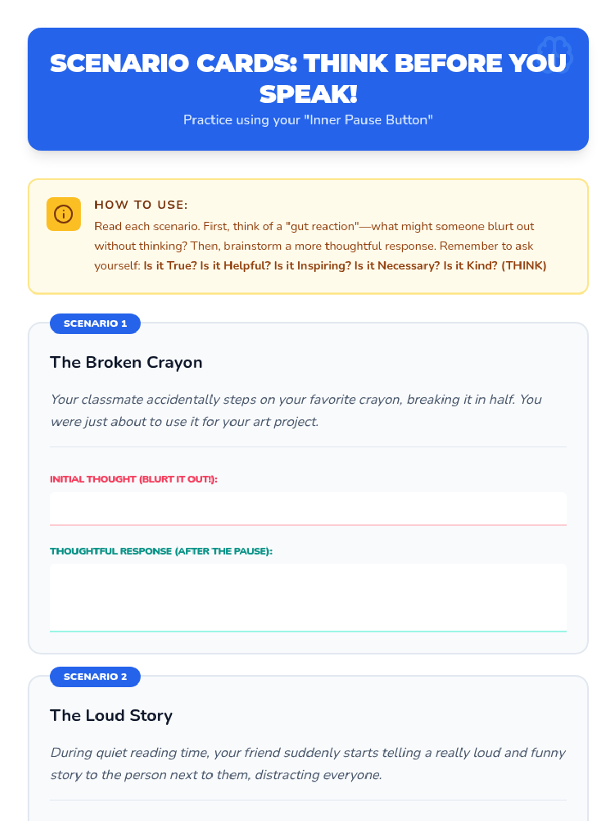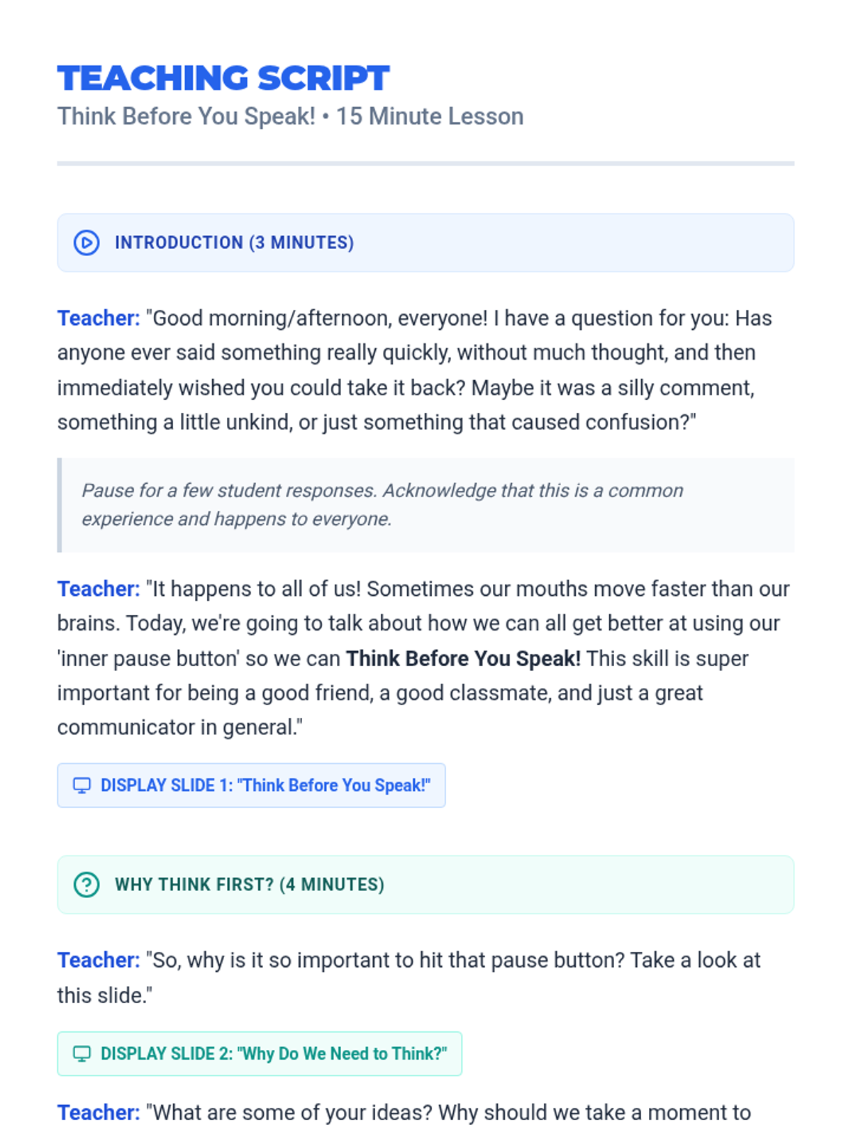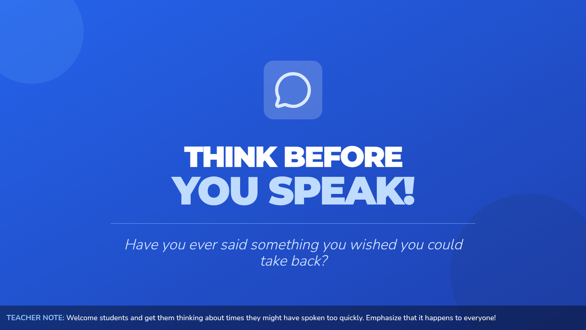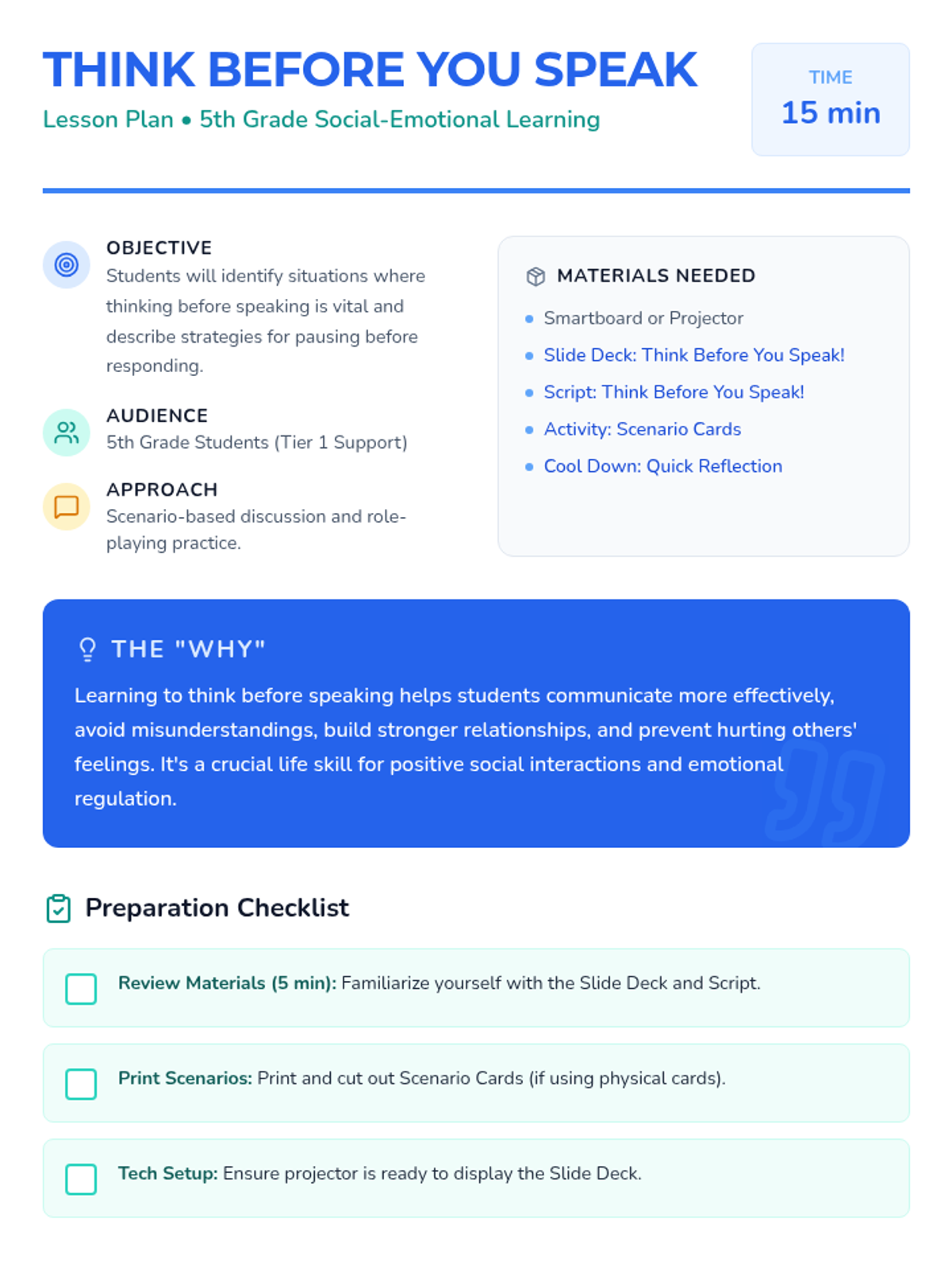 A 15-minute social-emotional learning lesson for 5th graders focused on the 'THINK' strategy to promote mindful communication and empathy.