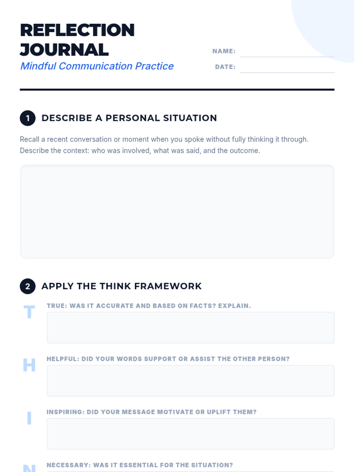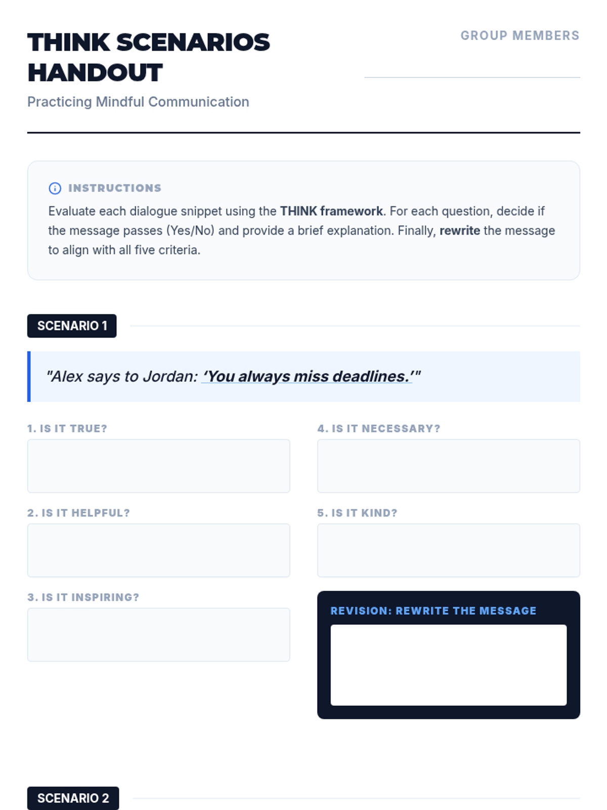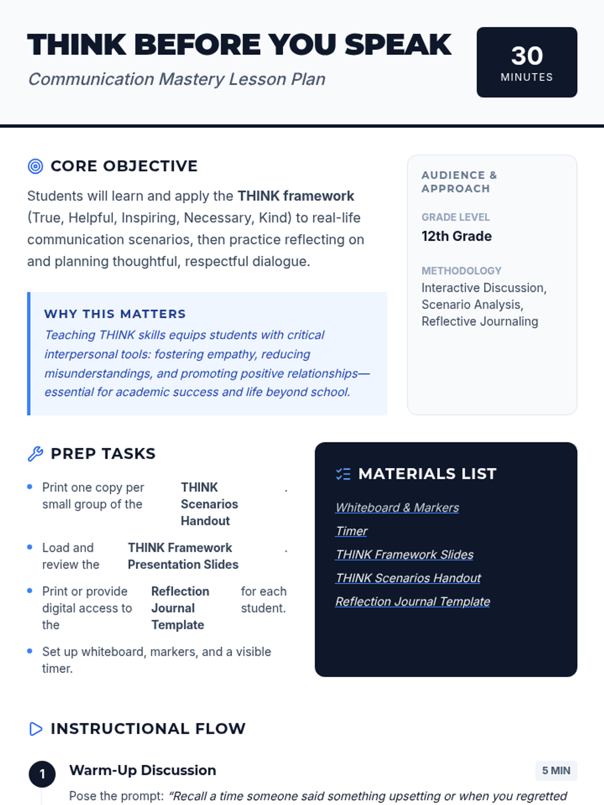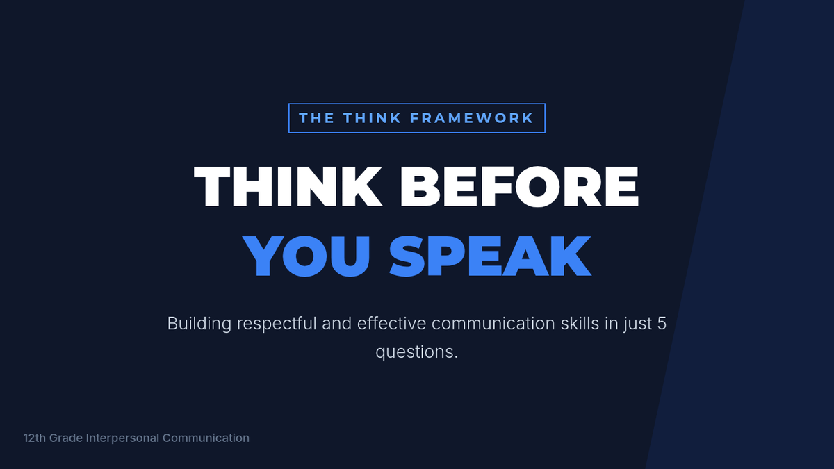 This 30-minute lesson introduces 12th-grade students to the THINK framework (True, Helpful, Inspiring, Necessary, Kind) to improve interpersonal communication and emotional intelligence. Students engage with the framework through direct instruction, collaborative scenario analysis, and personal reflection.