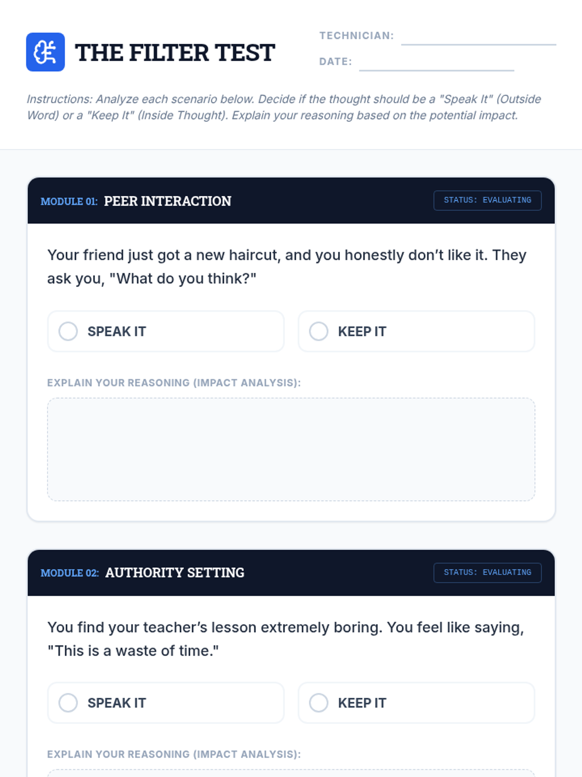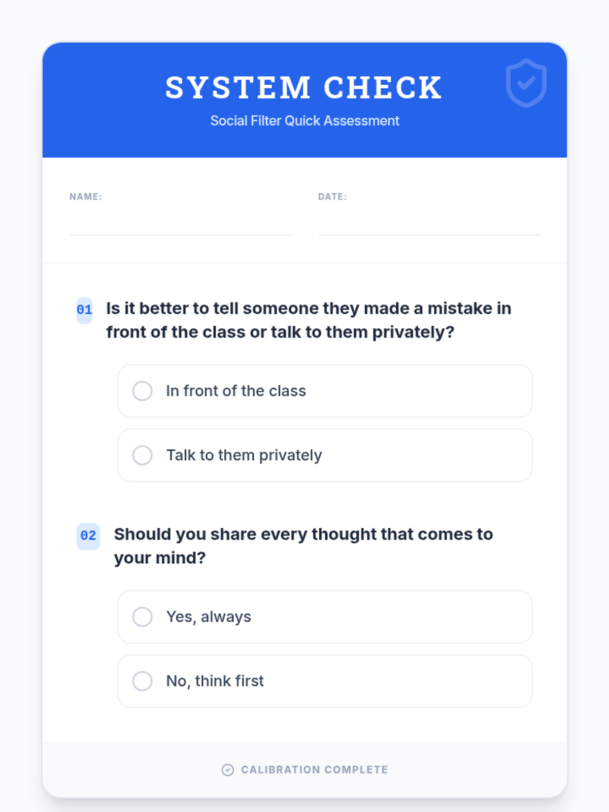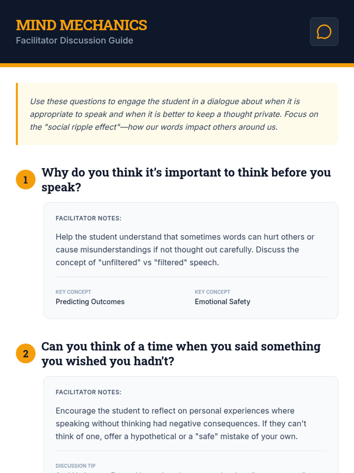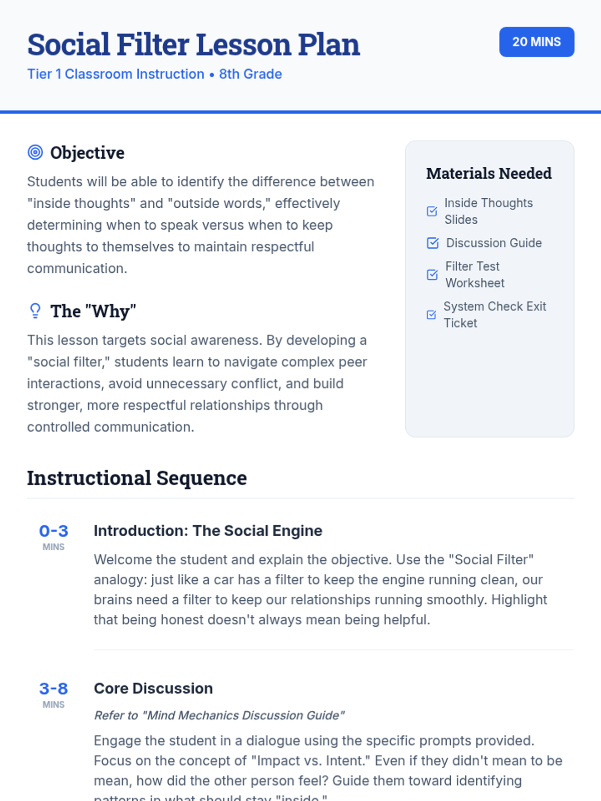 This lesson helps students understand the importance of thinking before speaking and teaches them to differentiate between appropriate and inappropriate thoughts to say out loud. This is essential for developing social awareness and respectful communication skills.