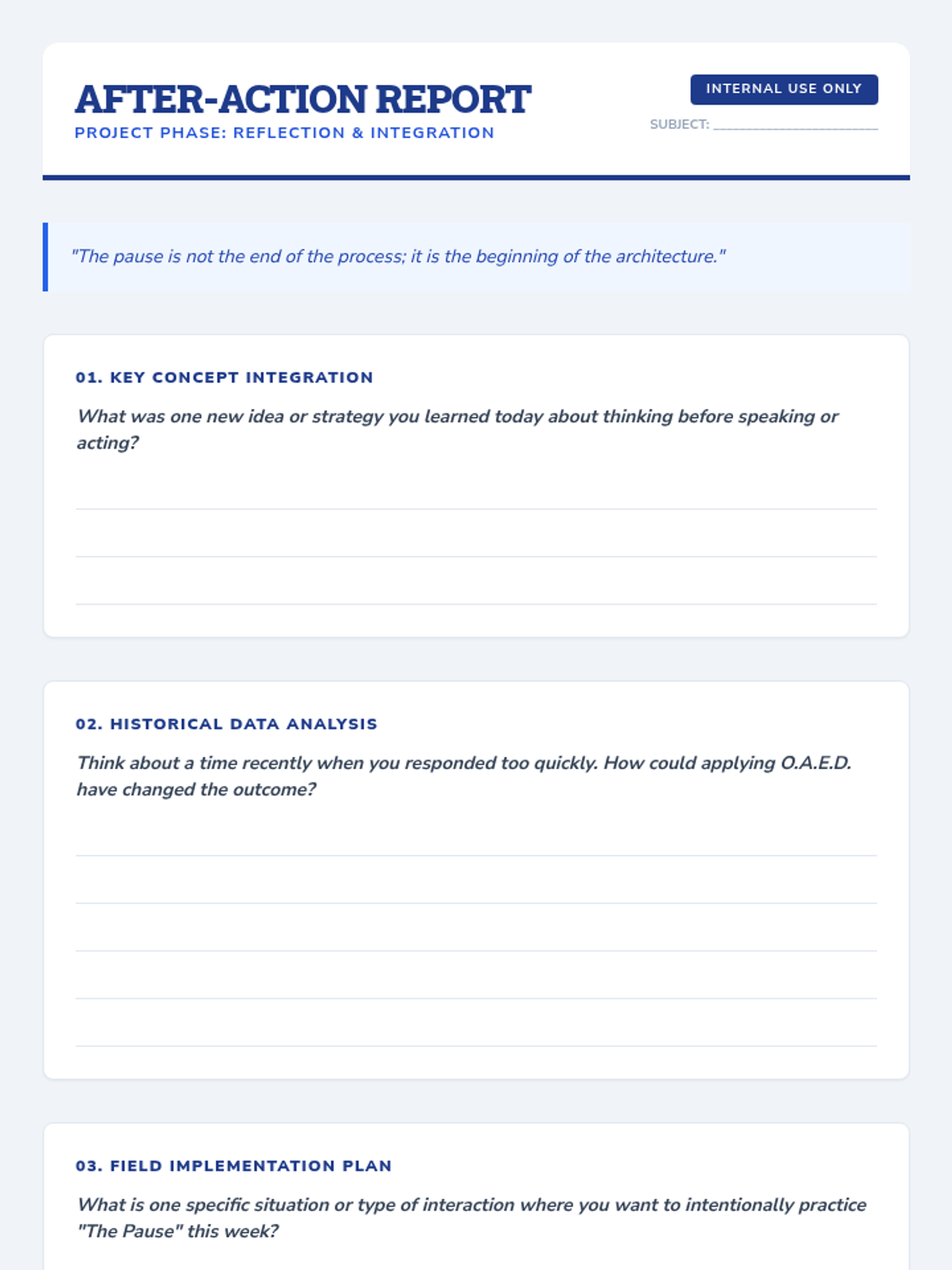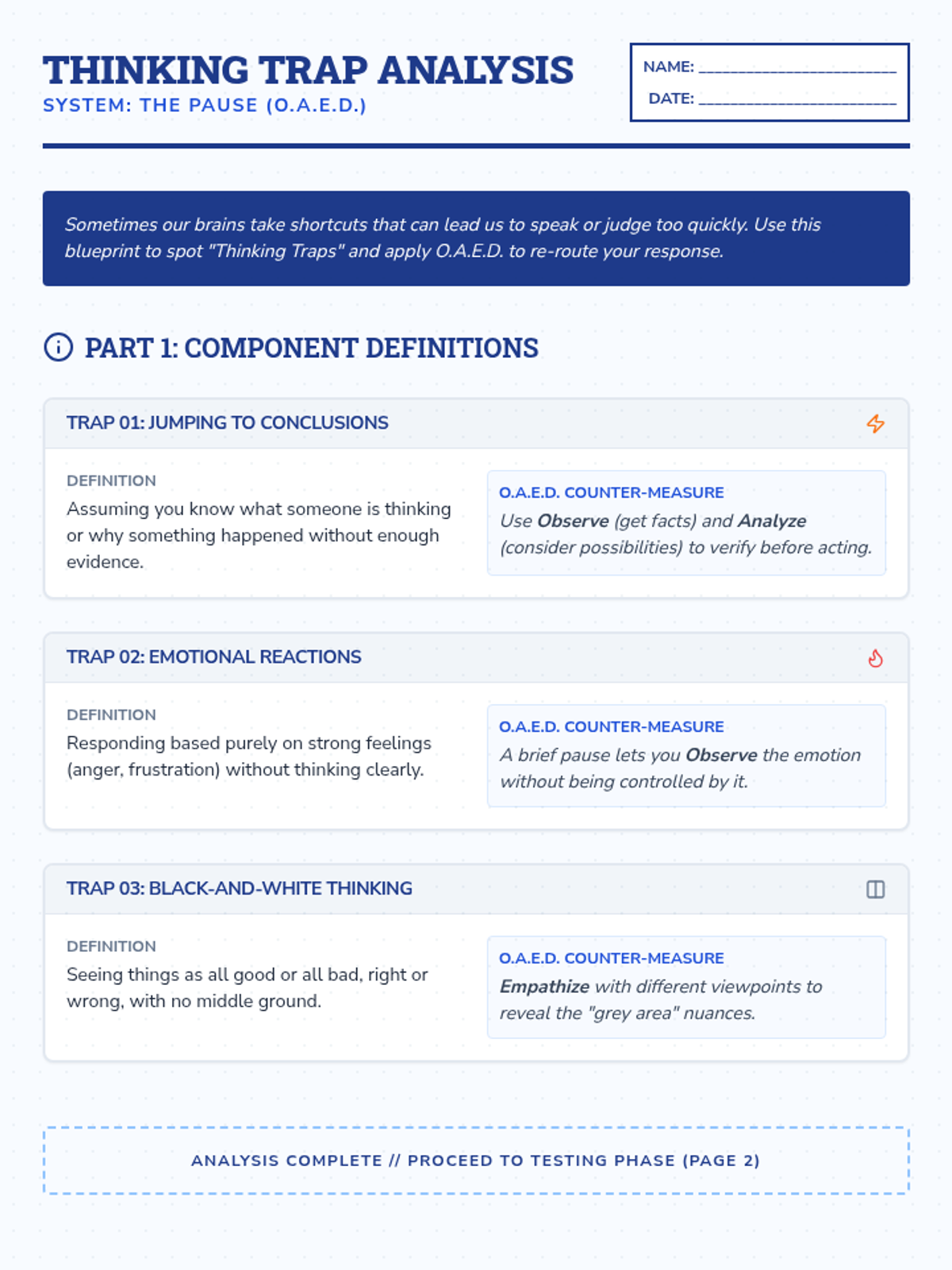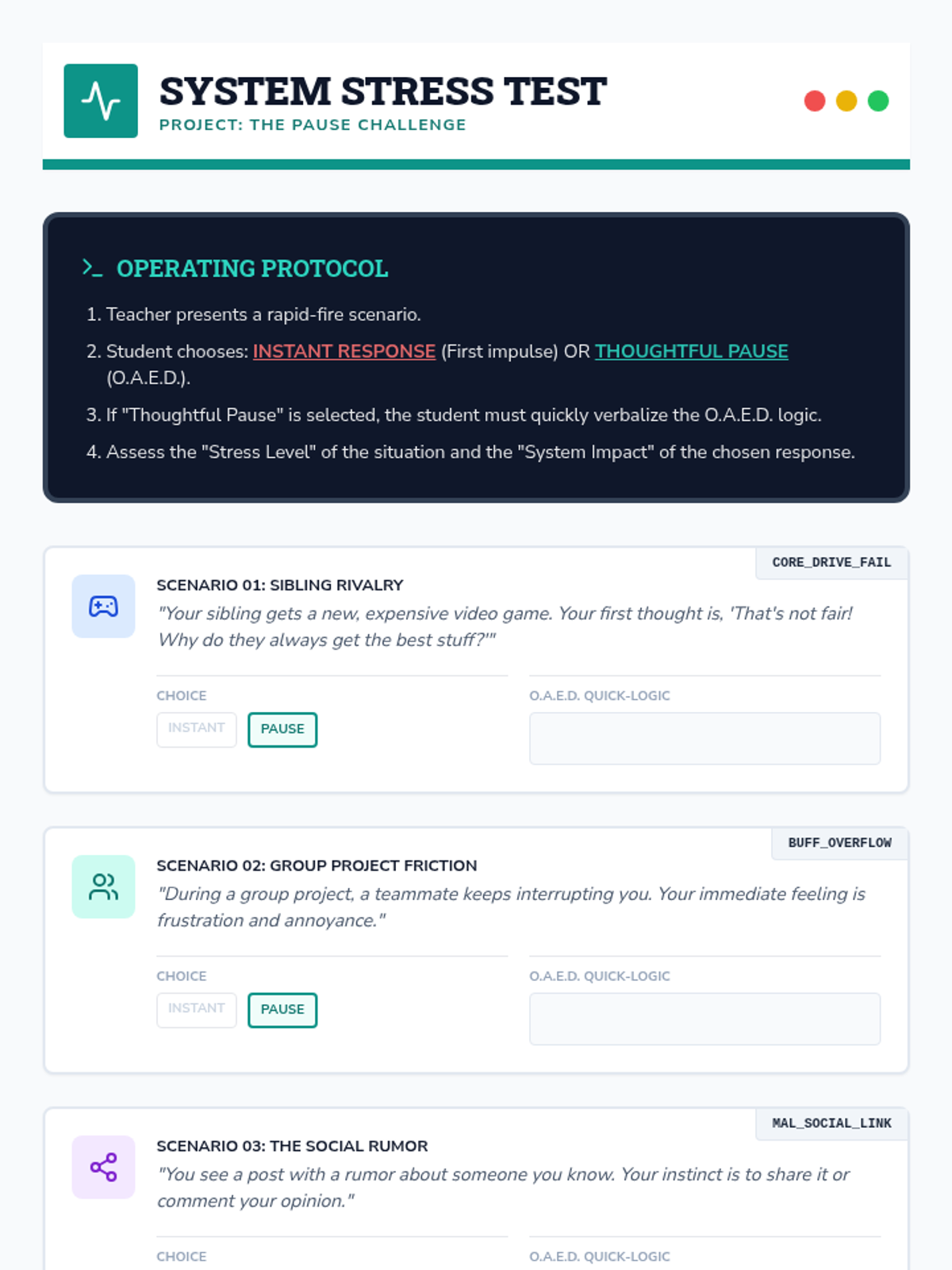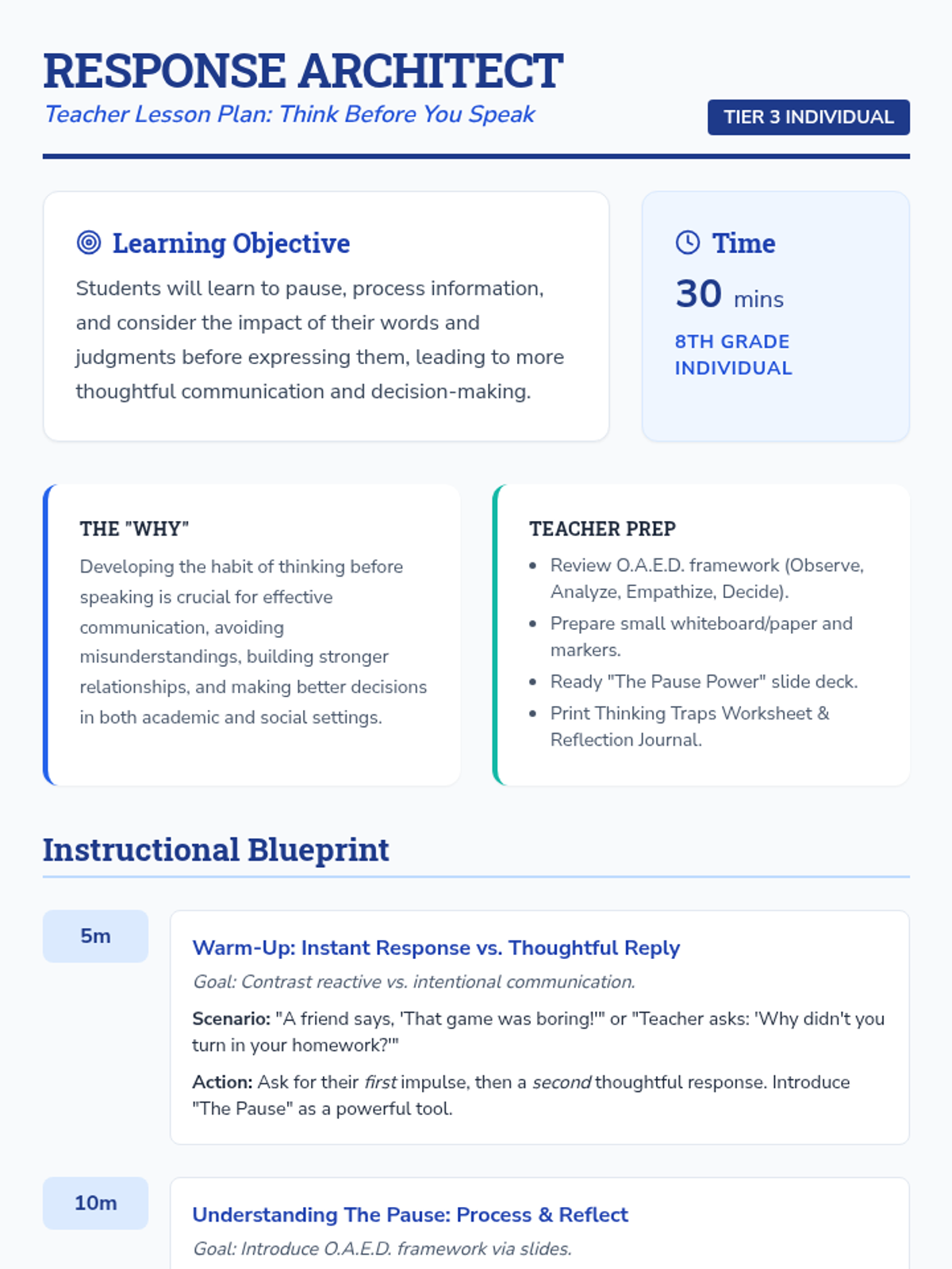 A 30-minute individualized lesson for 8th-grade students focused on mastering 'The Pause'—the critical moment of reflection between stimulus and response. Students learn the O.A.E.D. (Observe, Analyze, Empathize, Decide) framework to avoid thinking traps and make more intentional choices.