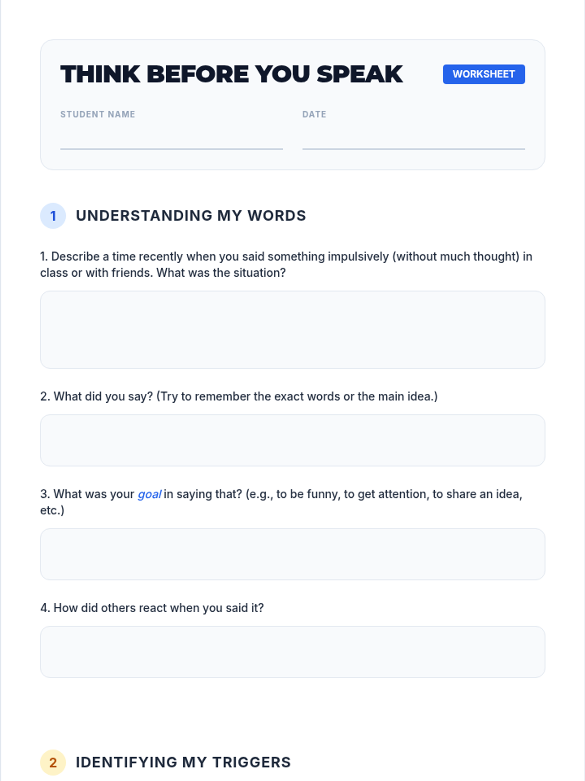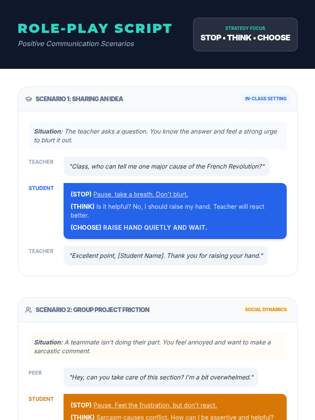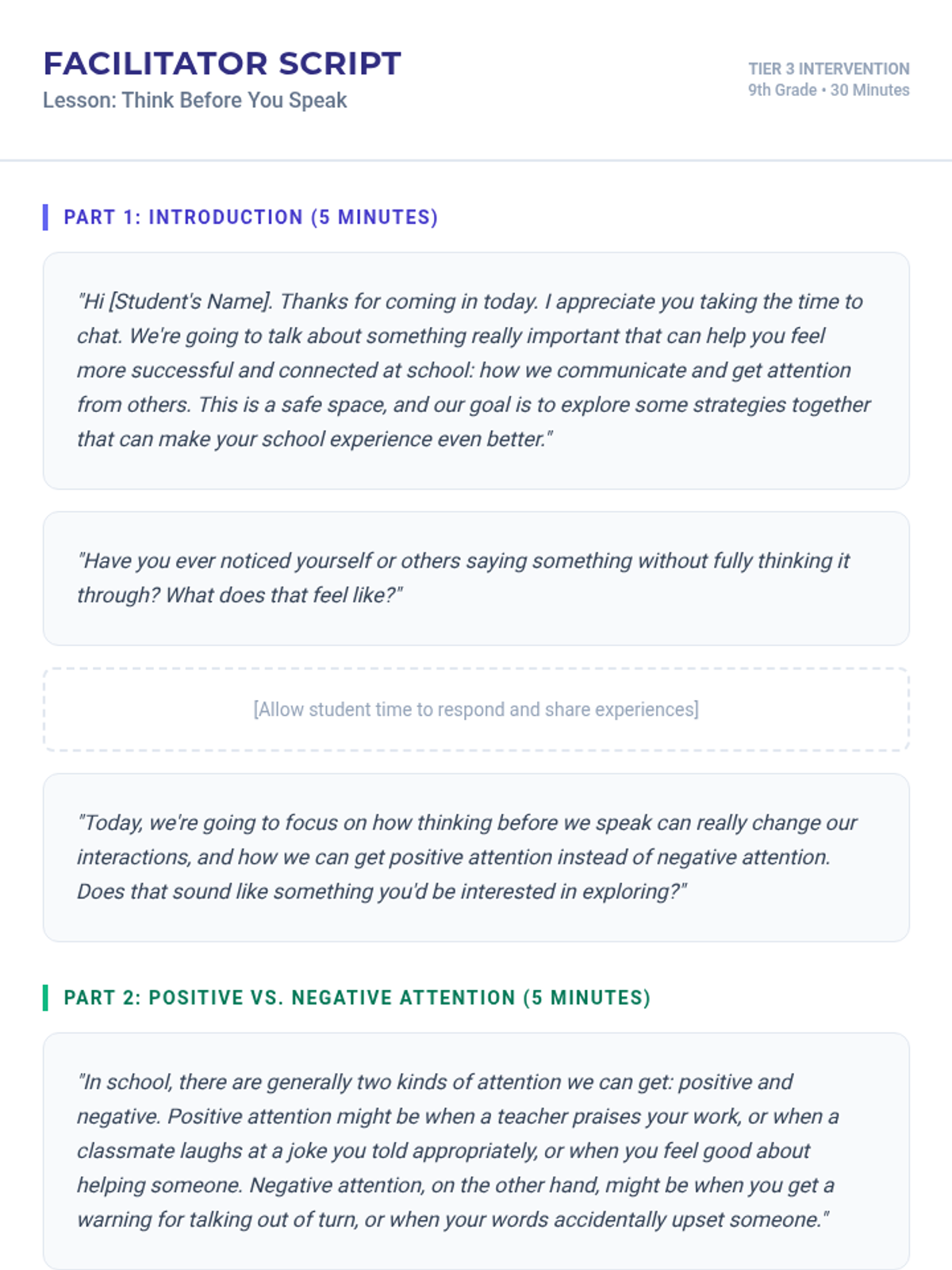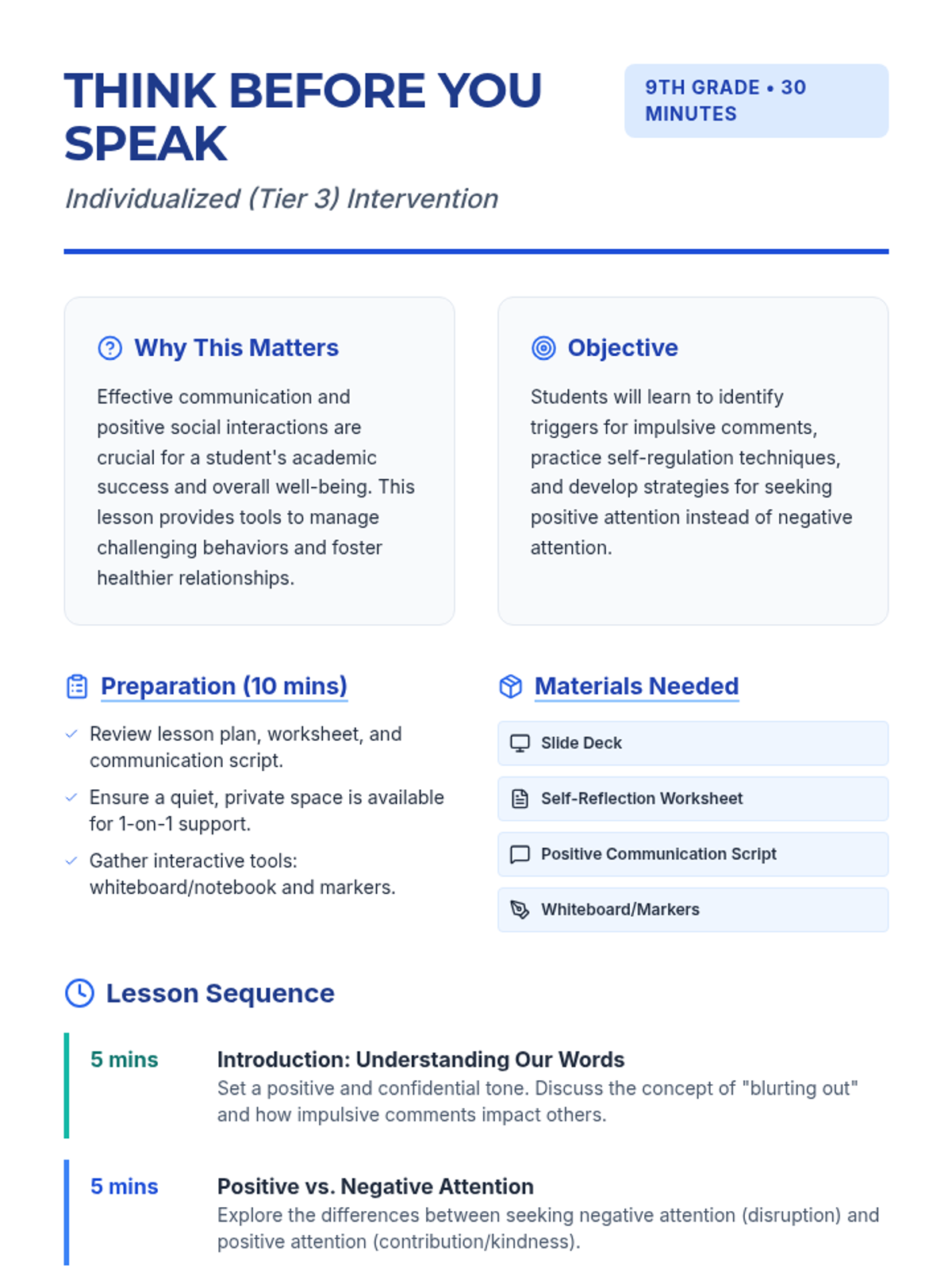 A 30-minute individualized Tier 3 intervention for 9th-grade students to manage impulsive verbal outbursts and shift from seeking negative attention to positive attention through the 'STOP, THINK, CHOOSE' strategy.