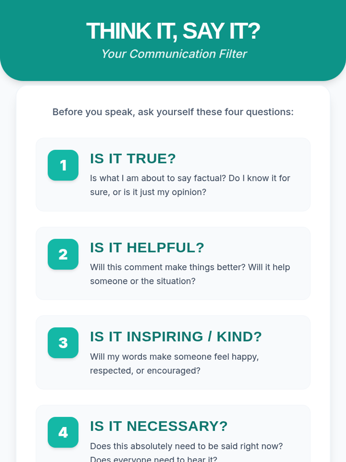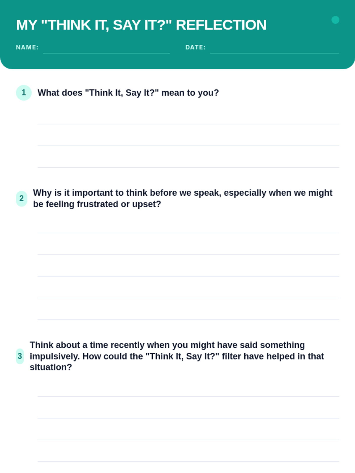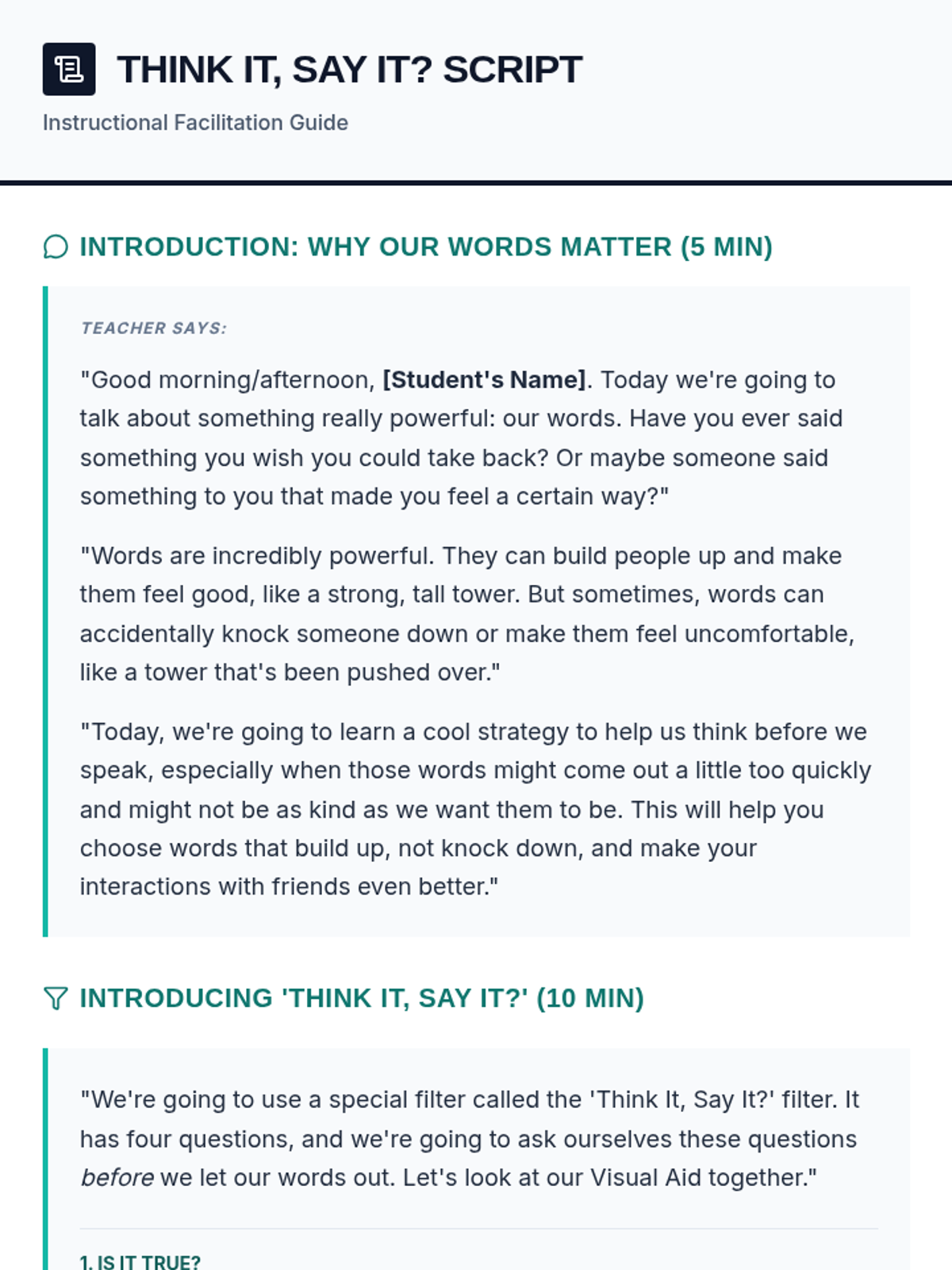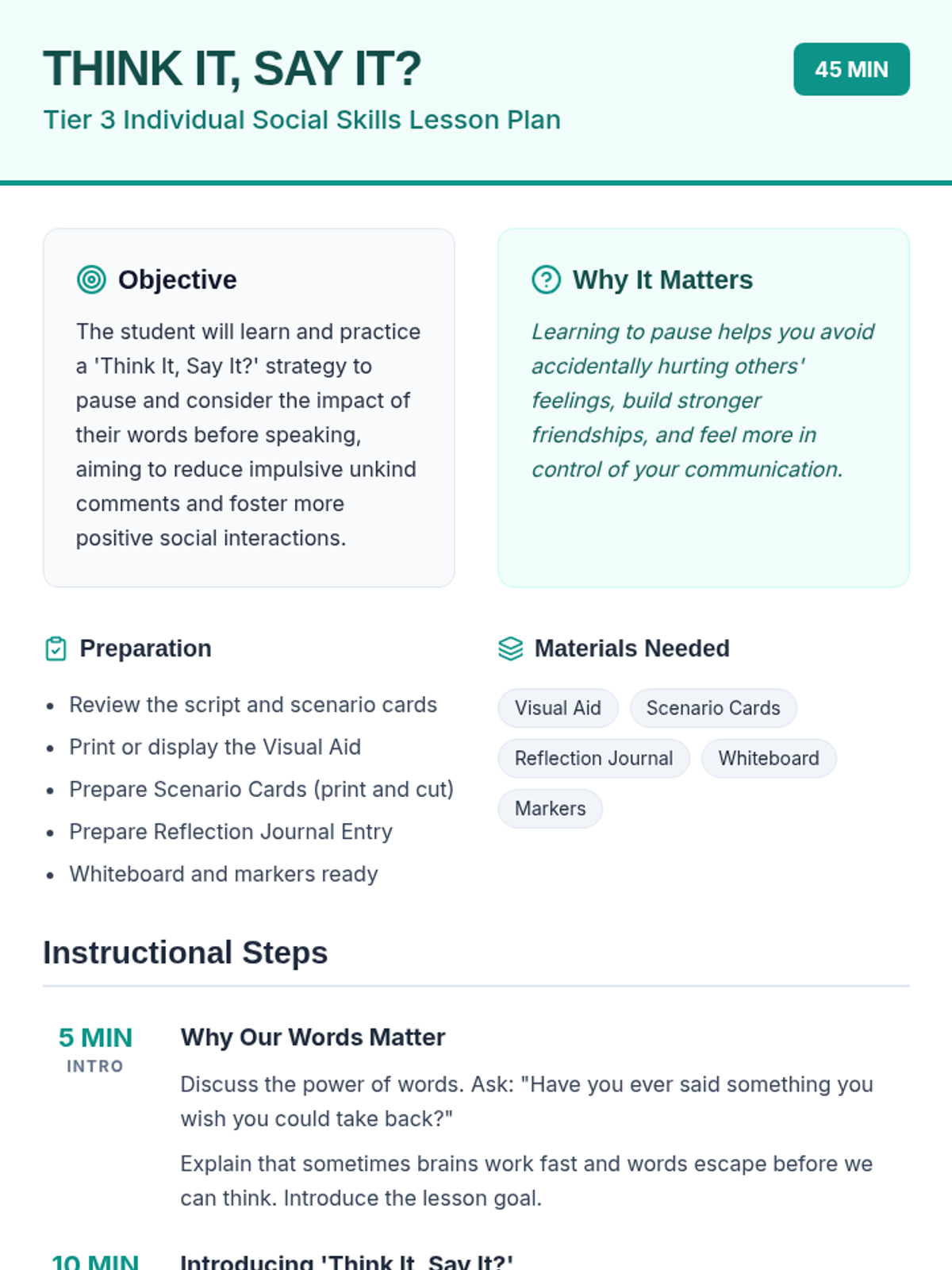 A 45-minute Tier 3 individual lesson for a 6th-grade student with autism focusing on self-regulation strategies to reduce impulsive, unkind communication by using the 'Think It, Say It?' filter.