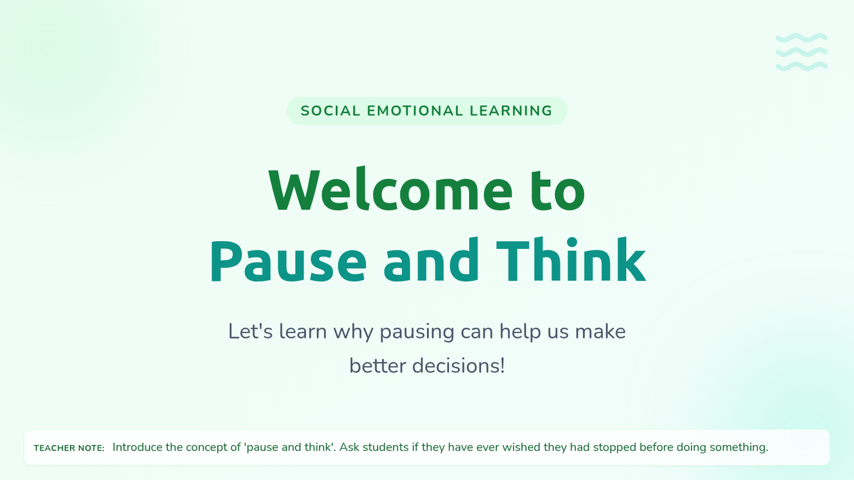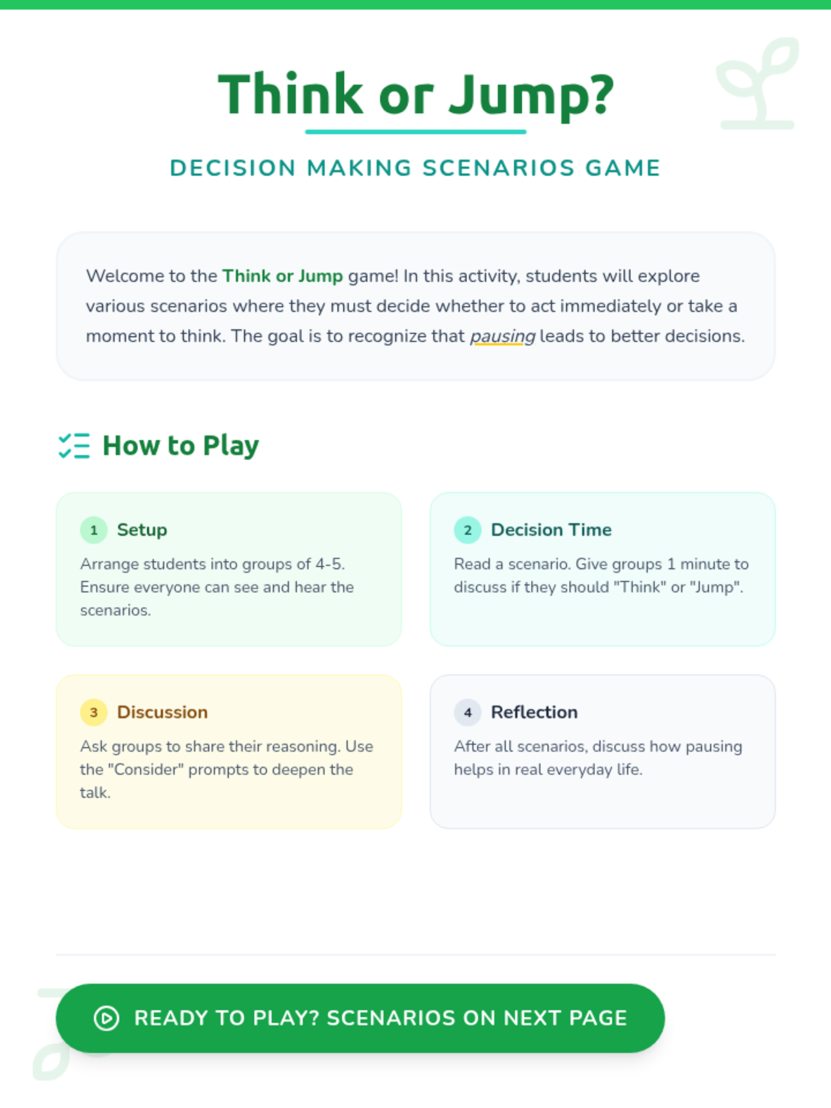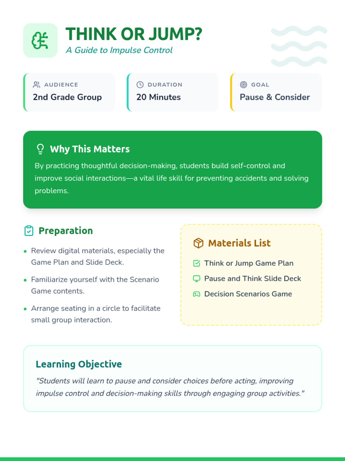 A small-group lesson for 2nd graders to develop impulse control. Students explore the concept of pausing before acting through interactive scenarios and a themed 'Lily Pad' game, learning to weigh options before making a 'leap'.