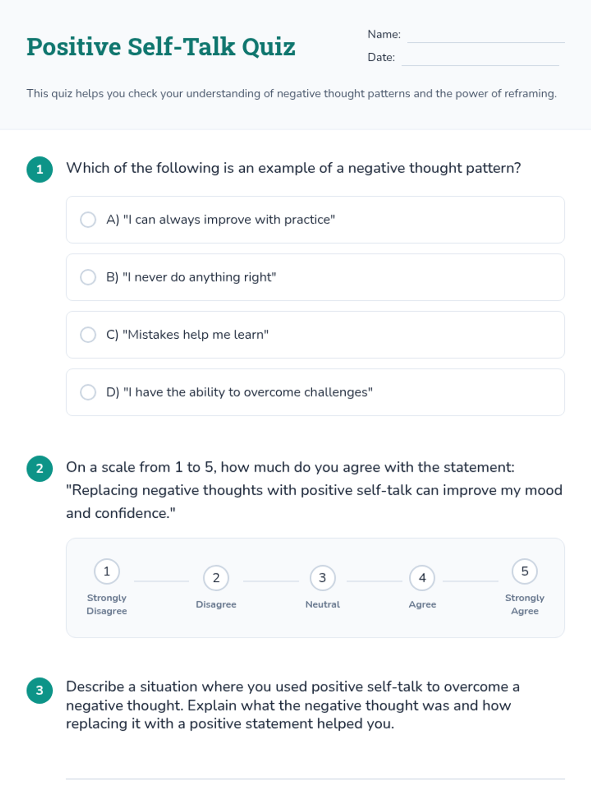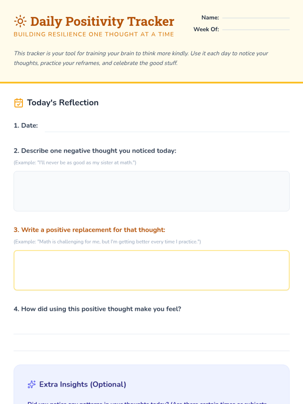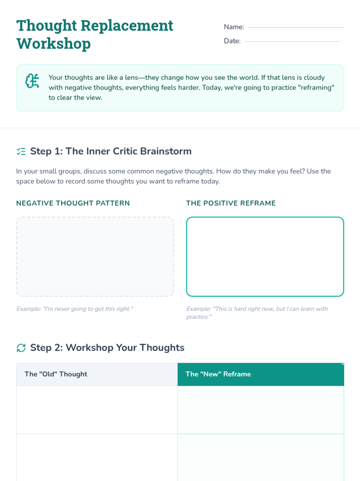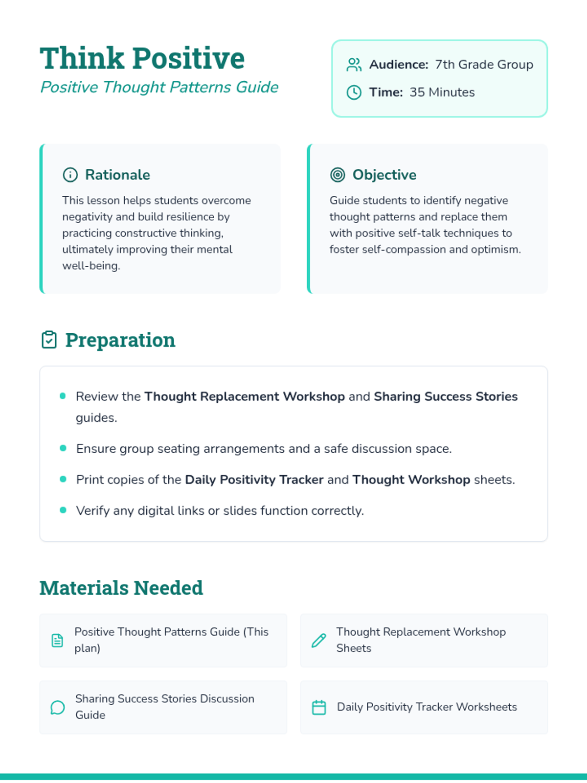 A Tier 2 group lesson for 7th graders focused on identifying negative thought patterns and practicing positive replacement techniques to build resilience and self-compassion.