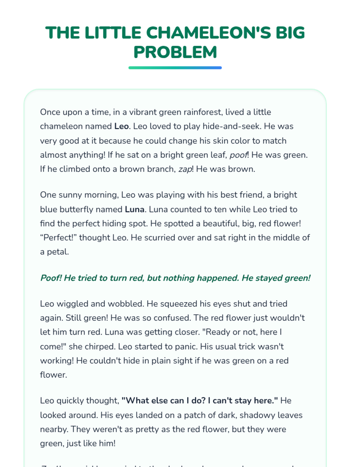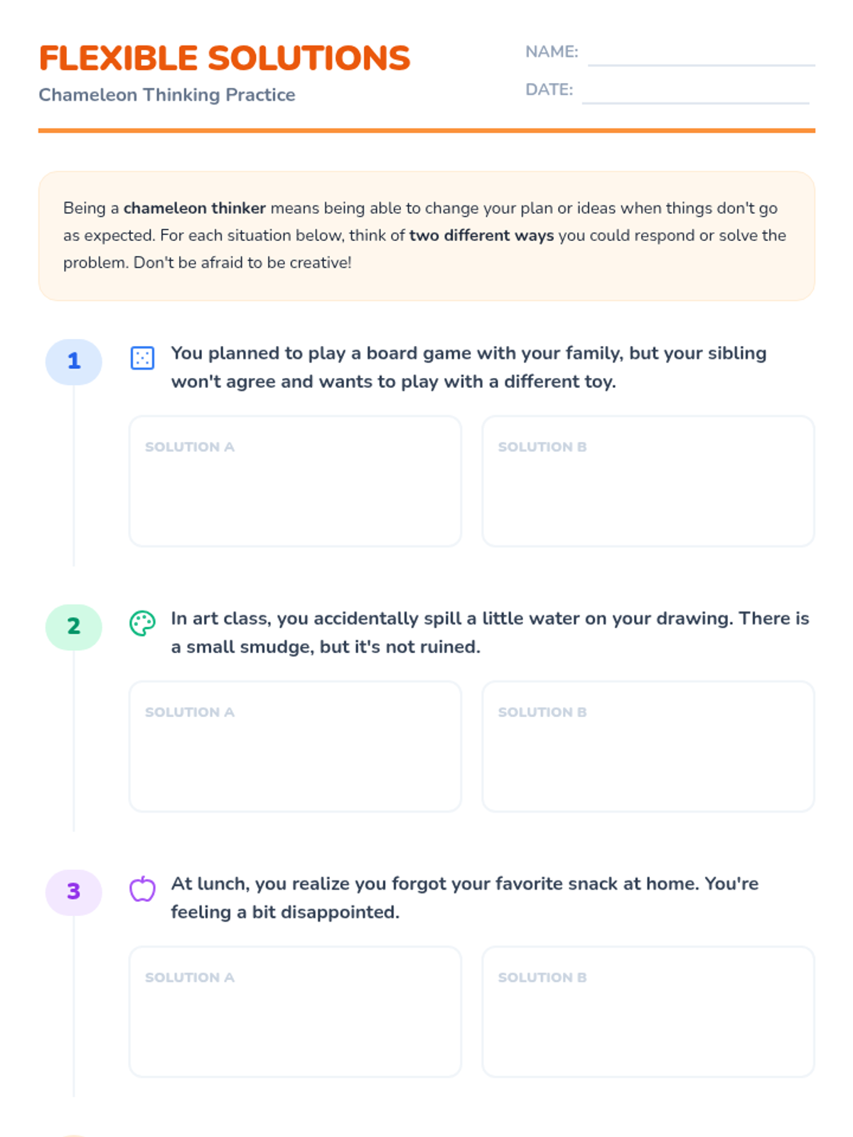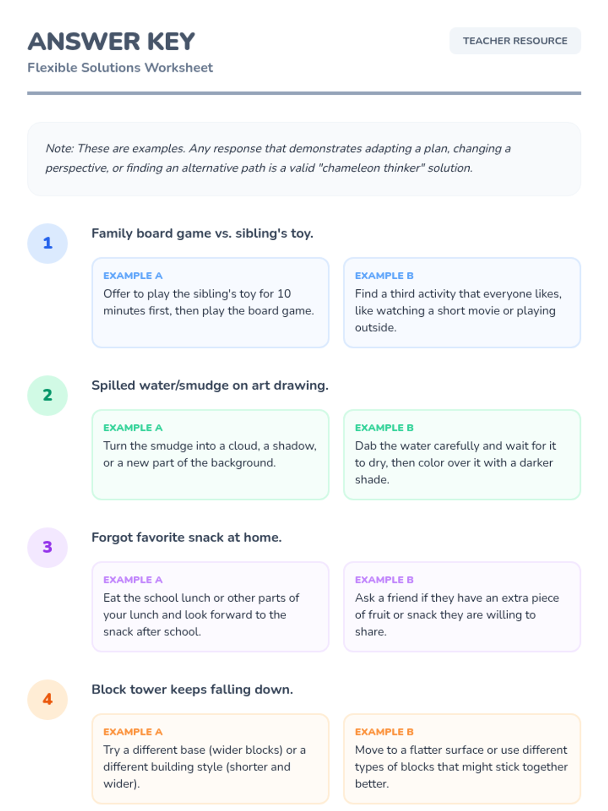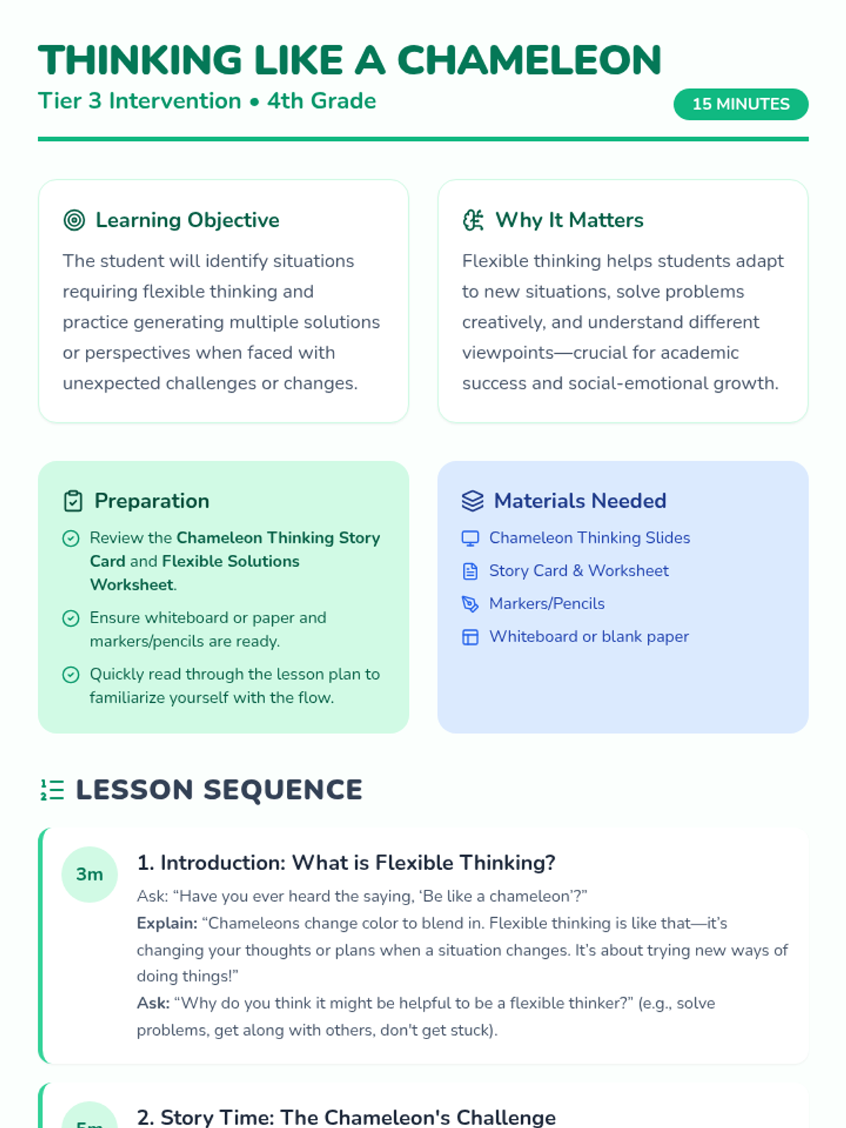 This 15-minute Tier 3 lesson helps a 4th-grade student develop flexible thinking skills by exploring how to adapt their thoughts and actions in different situations. It encourages students to see challenges from multiple perspectives through the story of Leo the Chameleon.