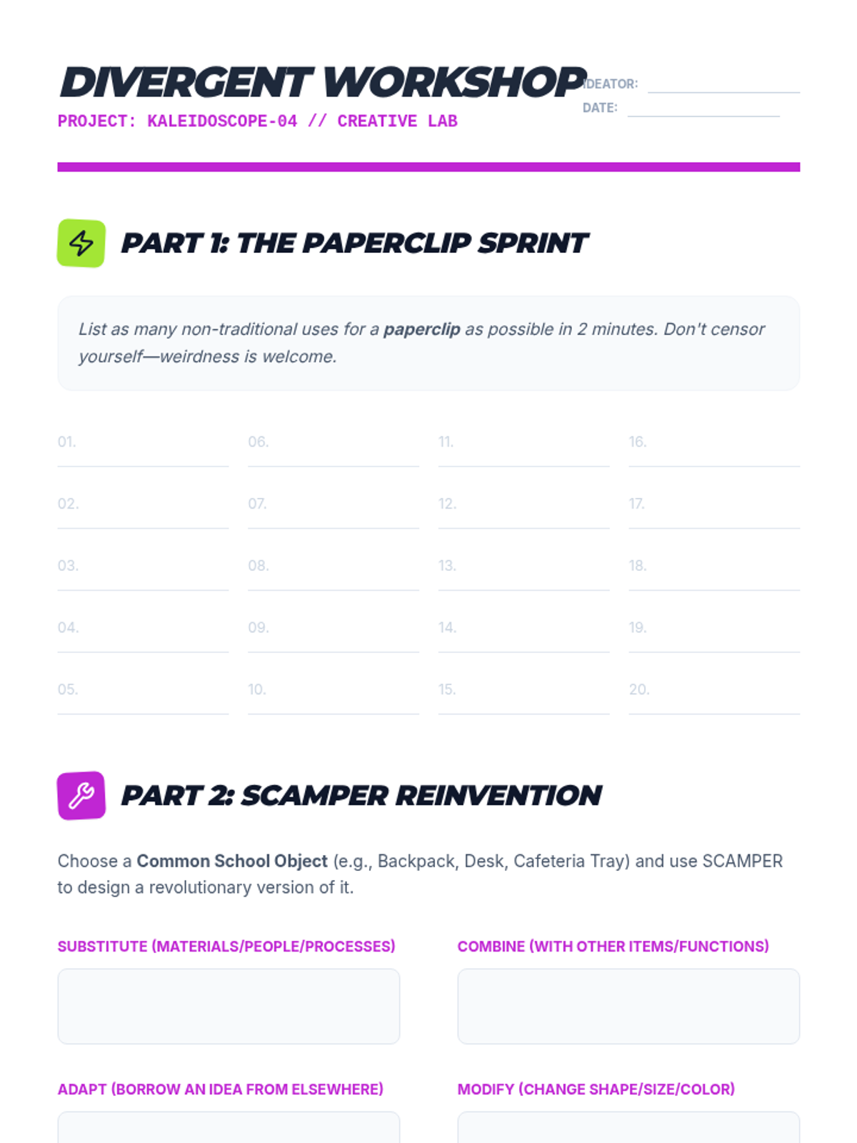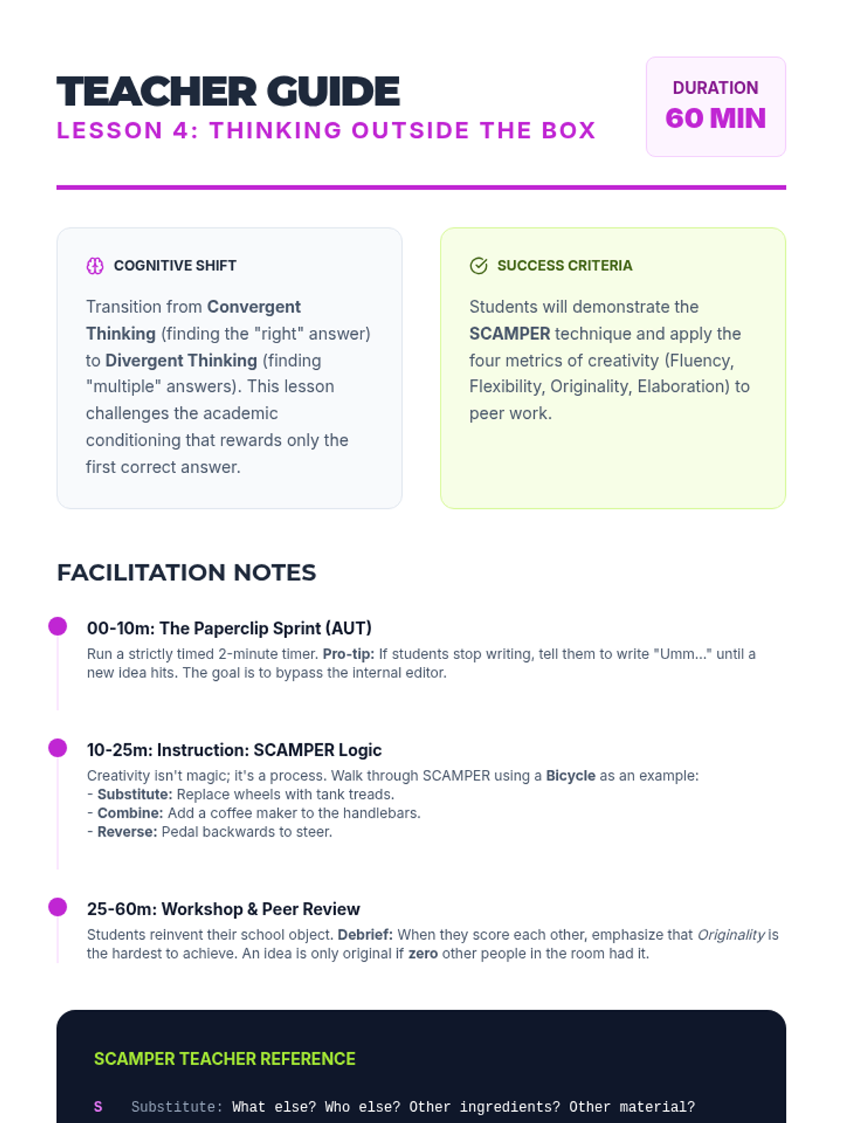 Moving away from single-solution problems, this lesson focuses on divergent thinking and techniques like SCAMPER to generate unique solutions.