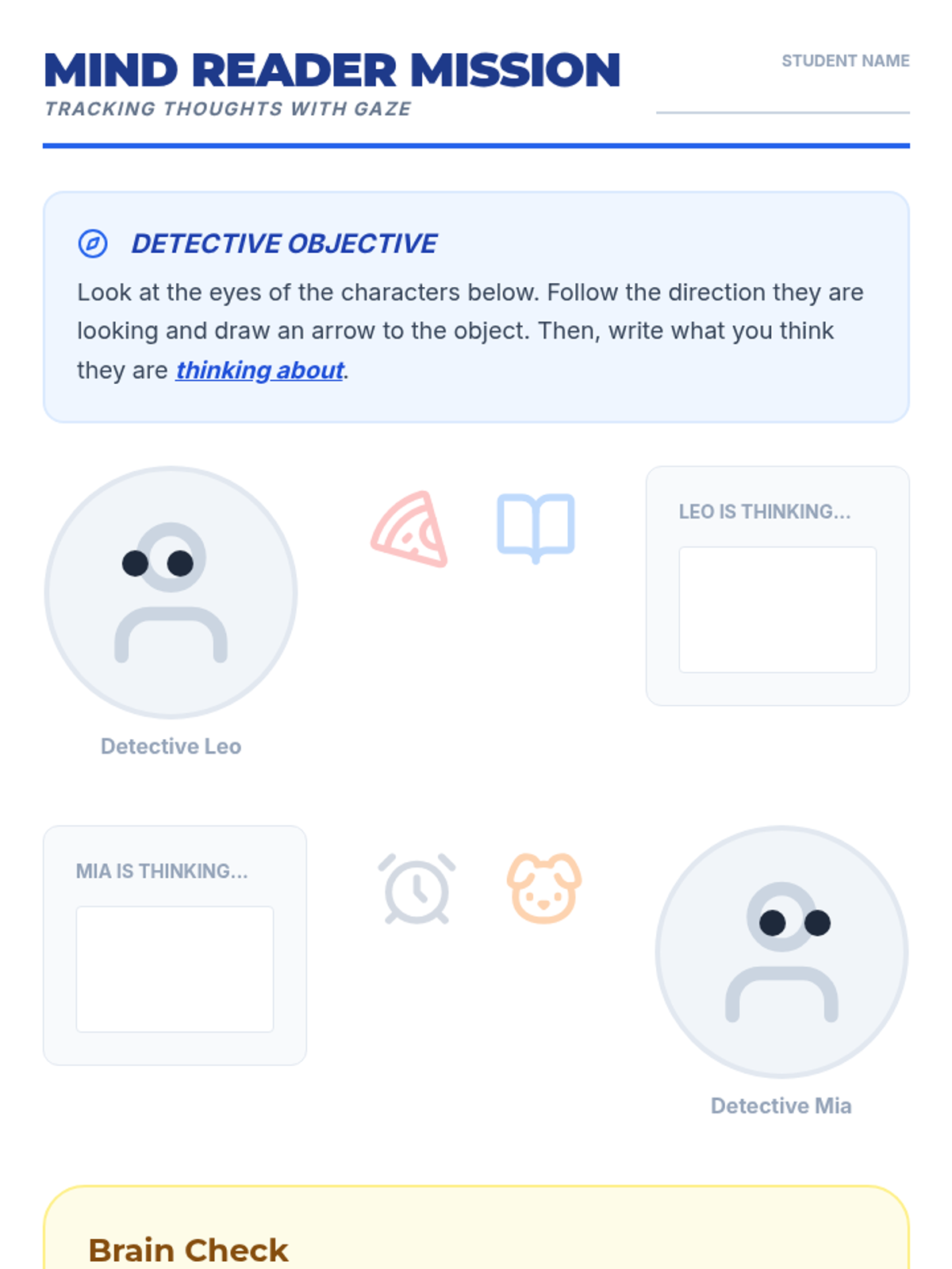 A game-based lesson where students learn to follow another person's gaze to understand their thoughts, interests, and shared attention cues.
