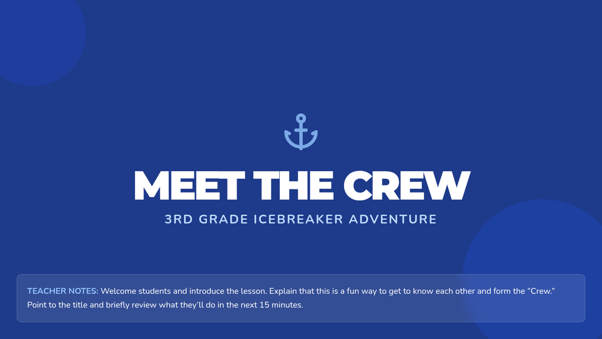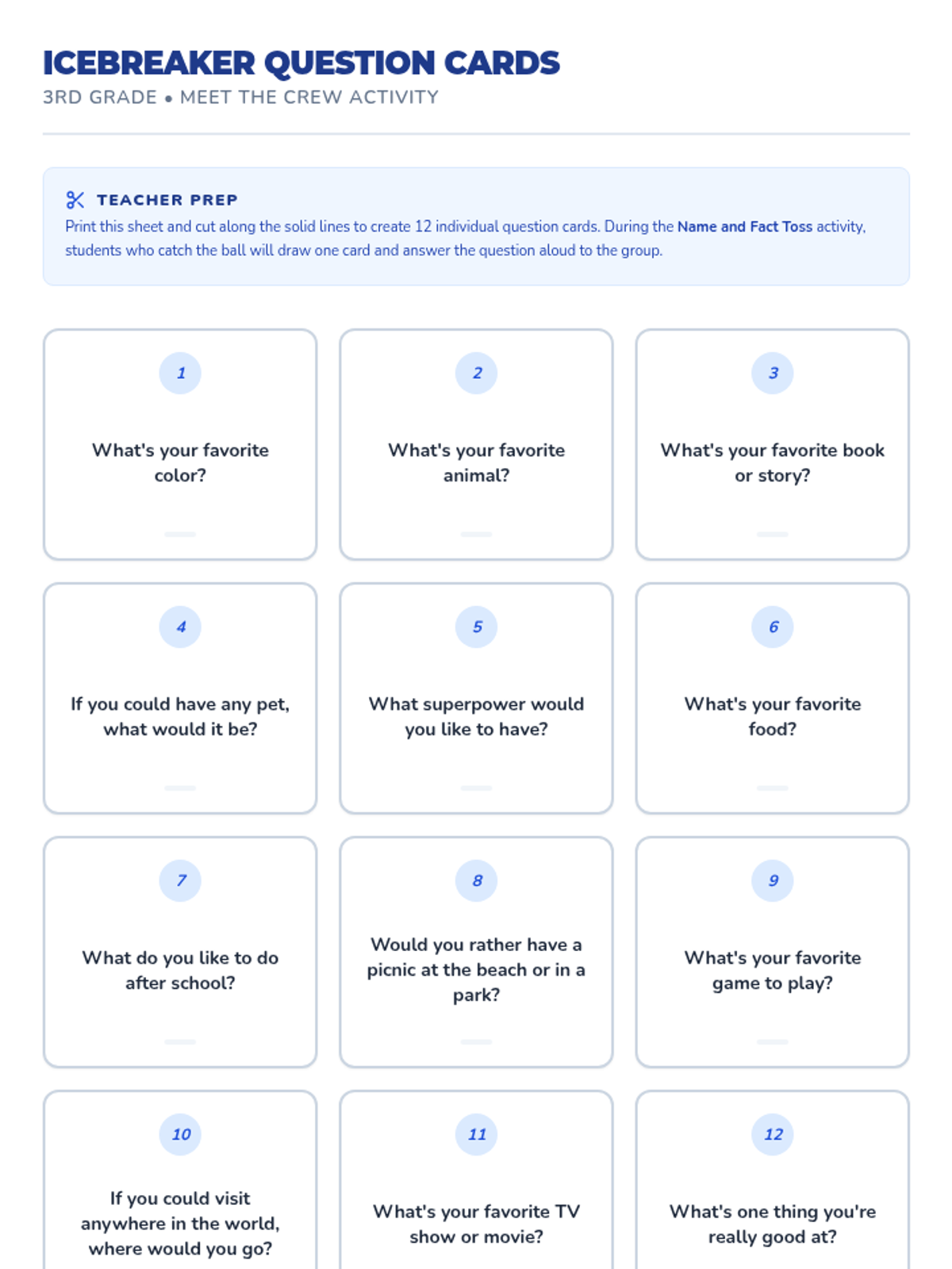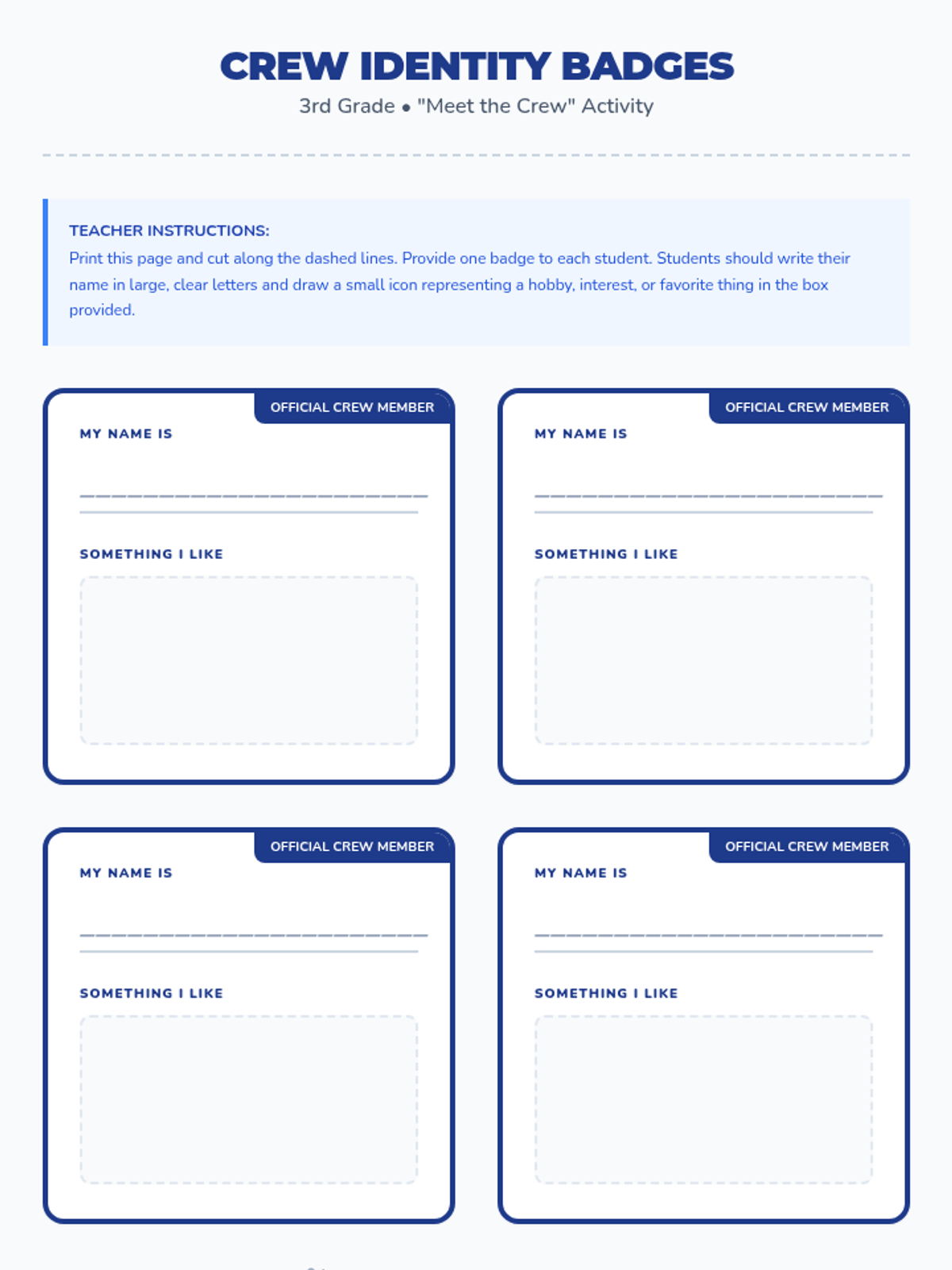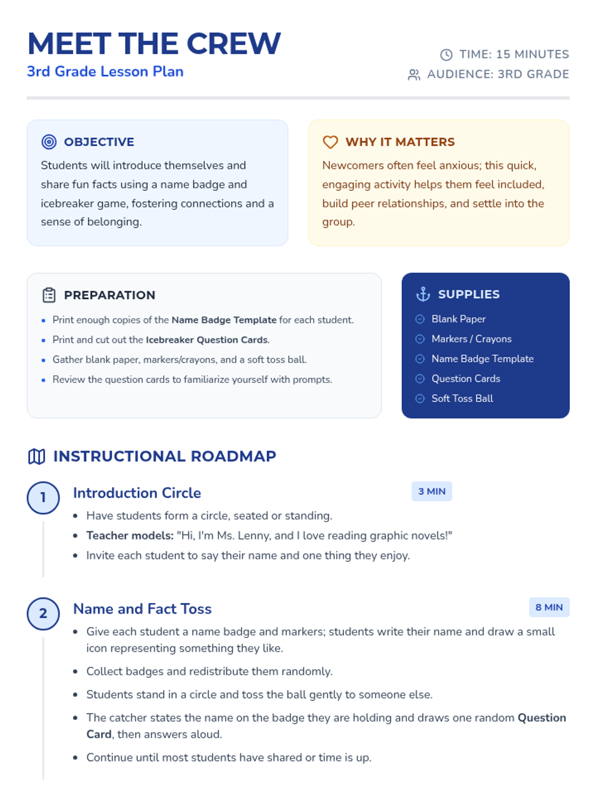 A fun 15-minute introductory lesson for 3rd graders to build connections and comfort in their small group through interactive games and name badges.