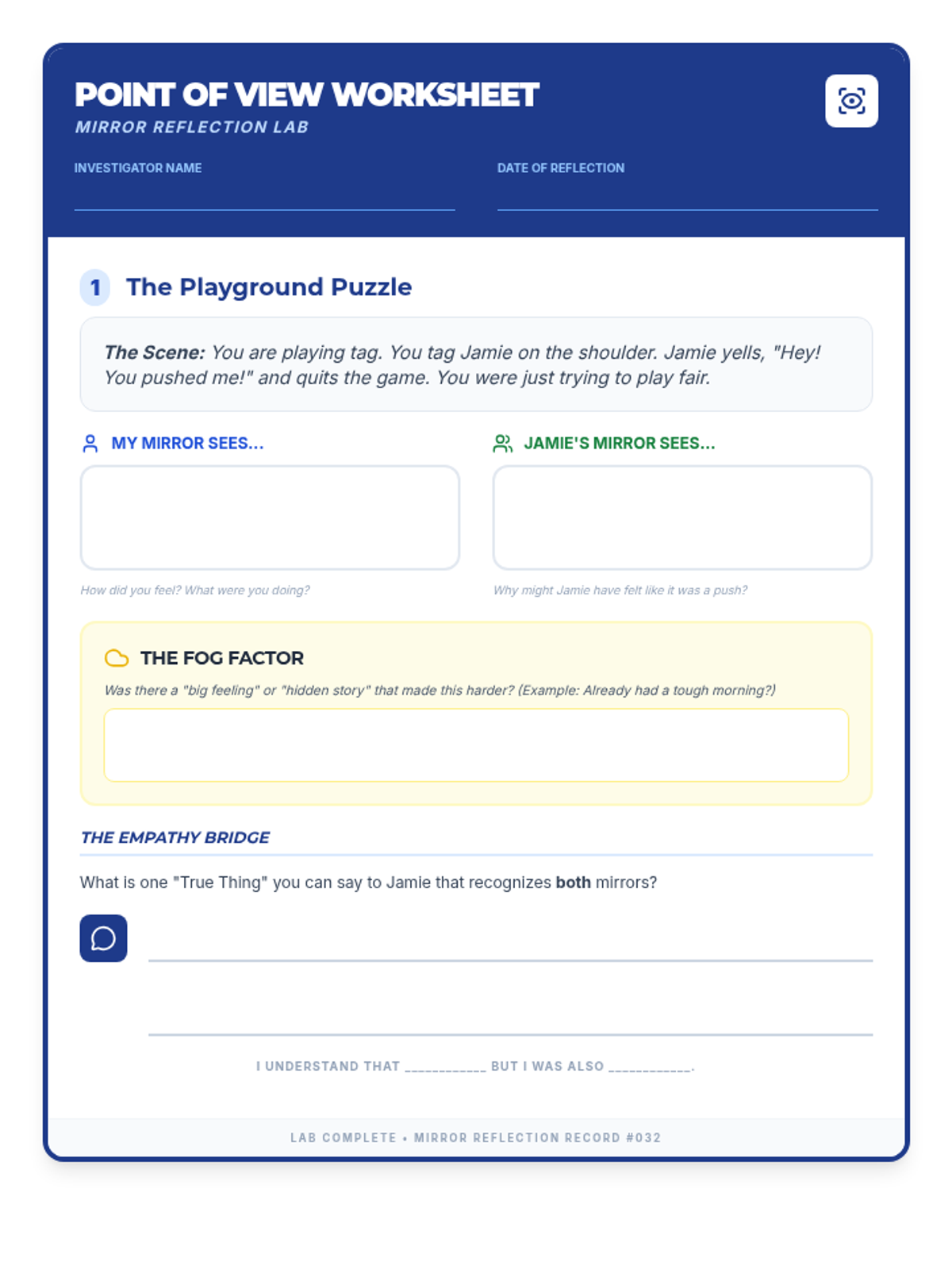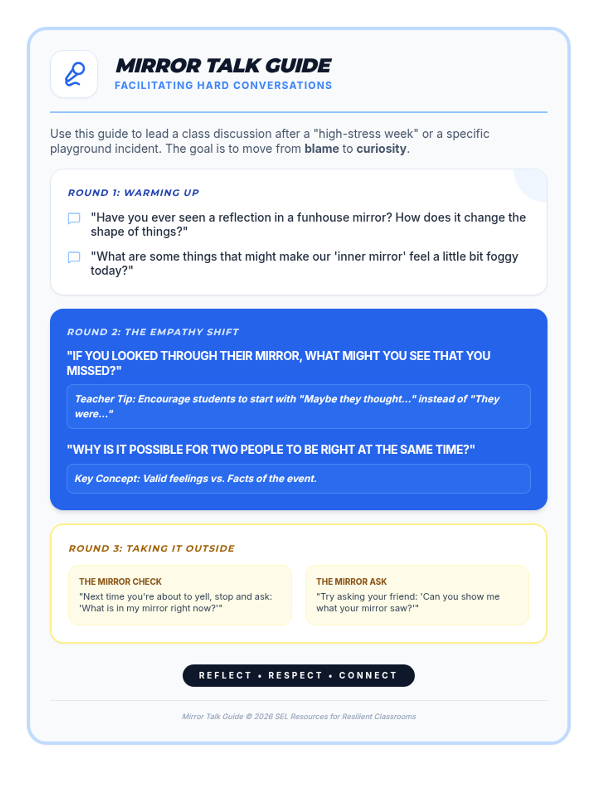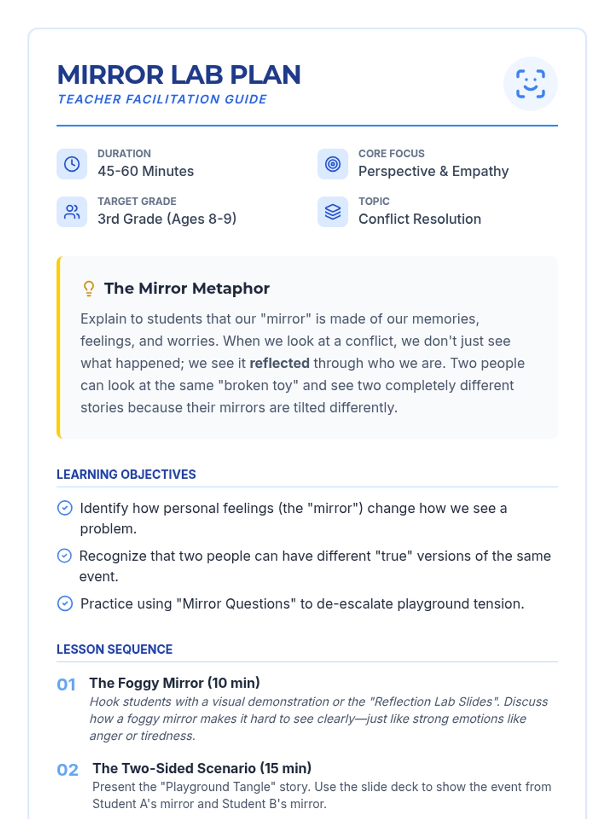 A Social-Emotional Learning lesson for 3rd graders exploring how personal experiences and emotions act as 'mirrors' that shape their perspective on conflicts. Students practice identifying multiple valid viewpoints to build empathy and resolve playground disagreements.