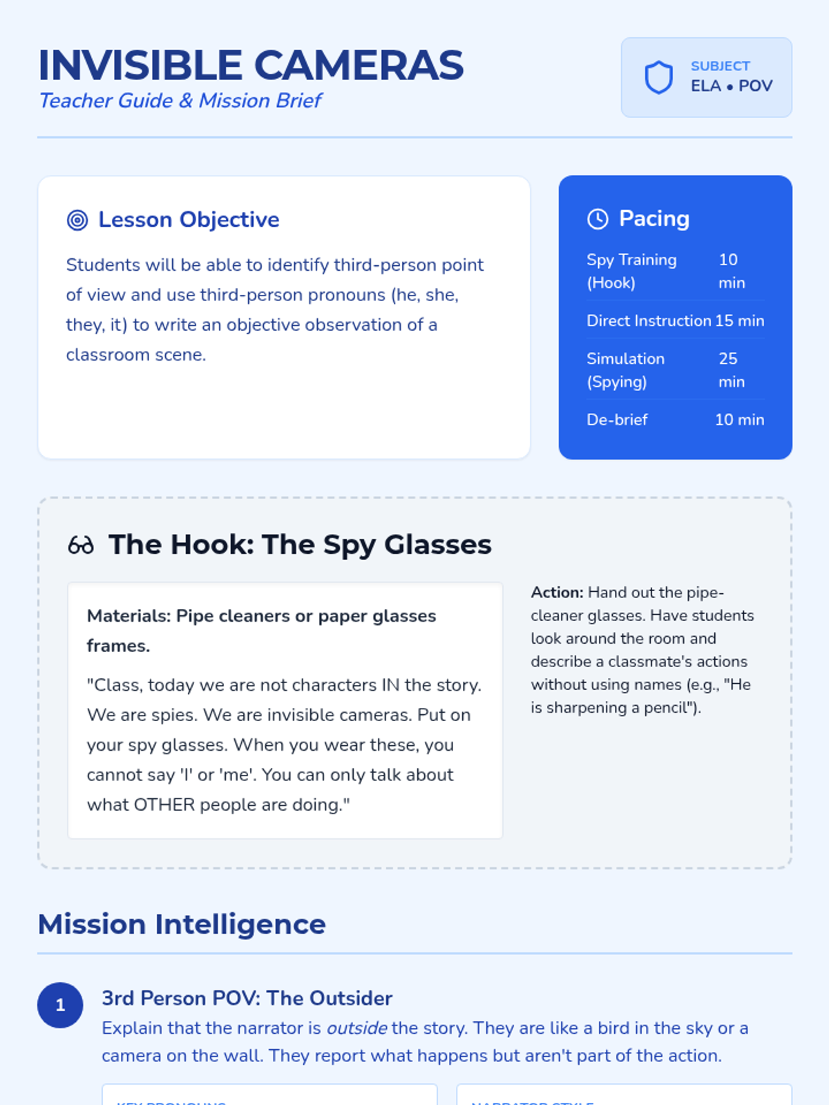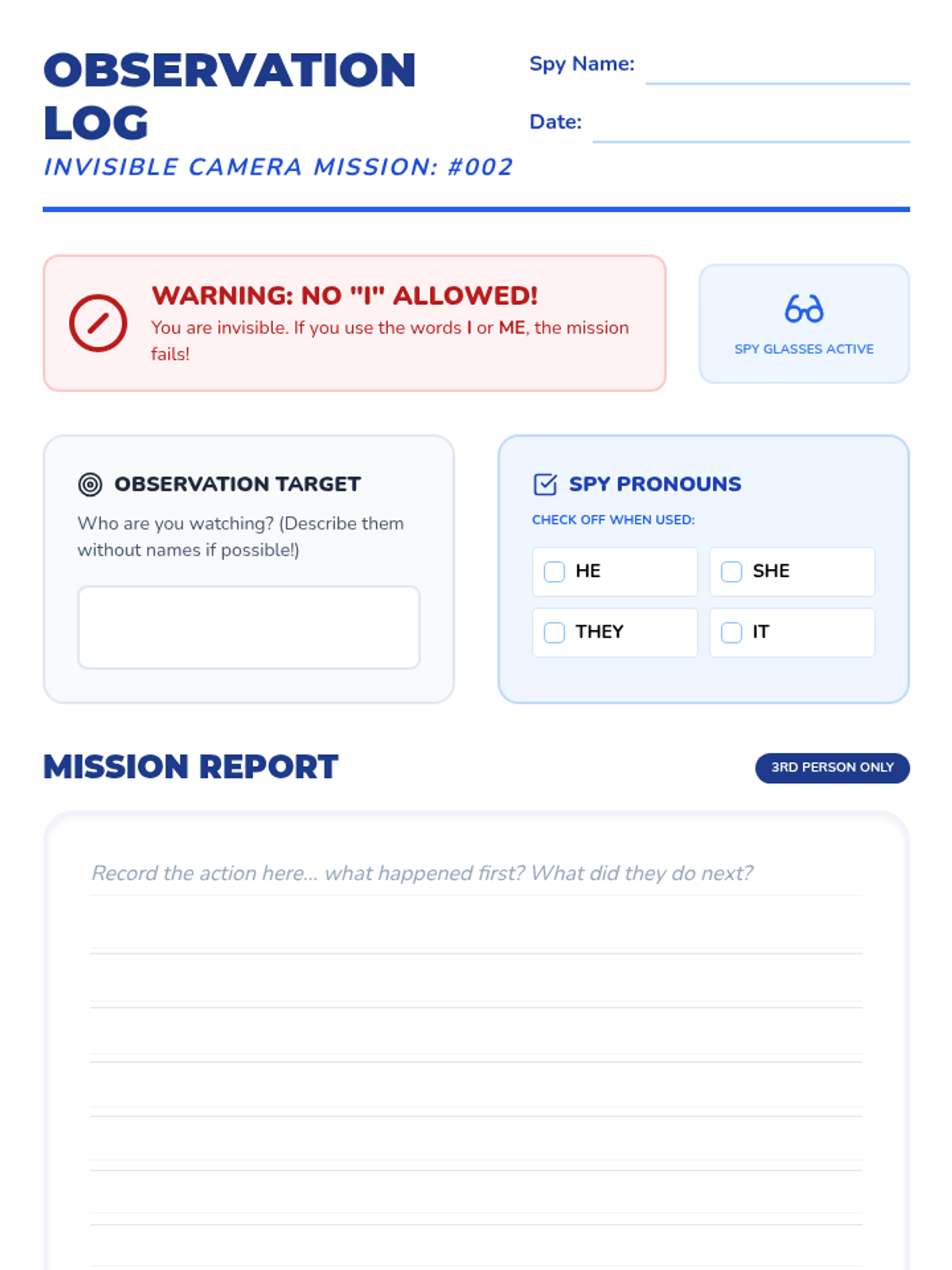 Students practice objective third-person narration by acting as 'invisible cameras' and observing classroom scenes using he, she, and they.