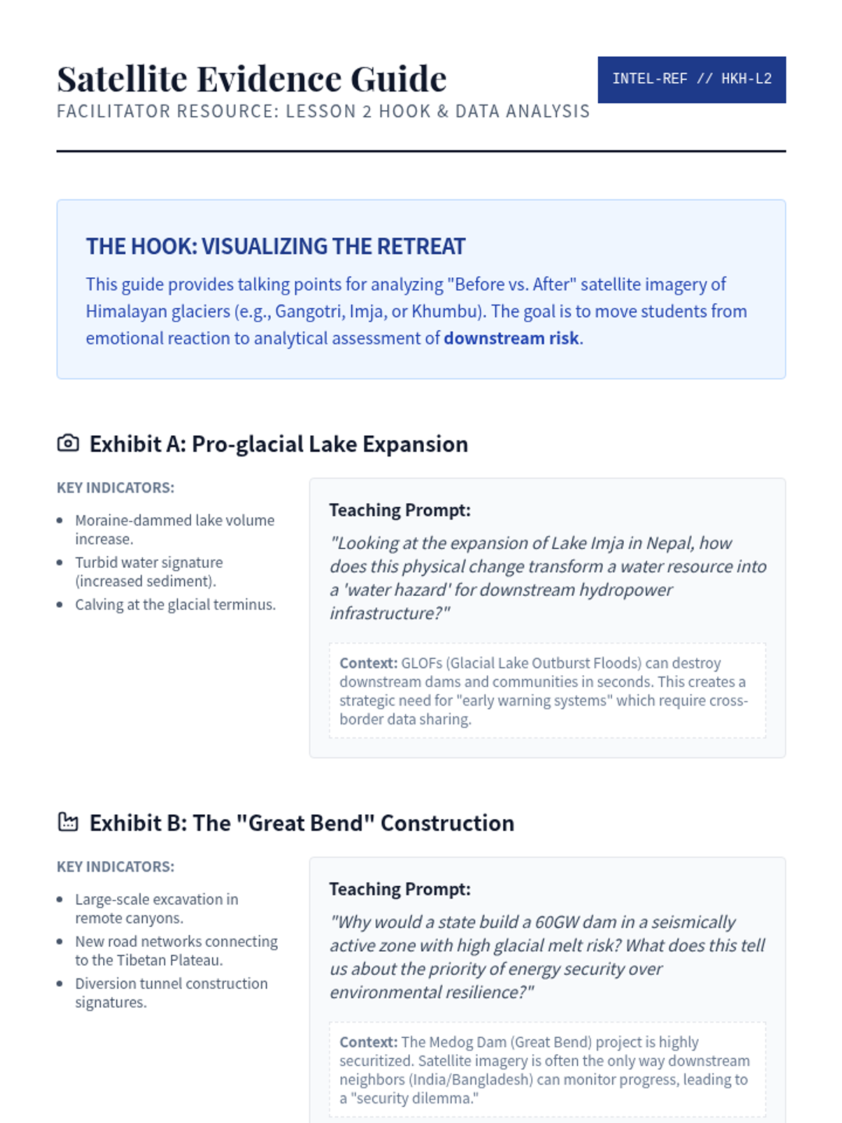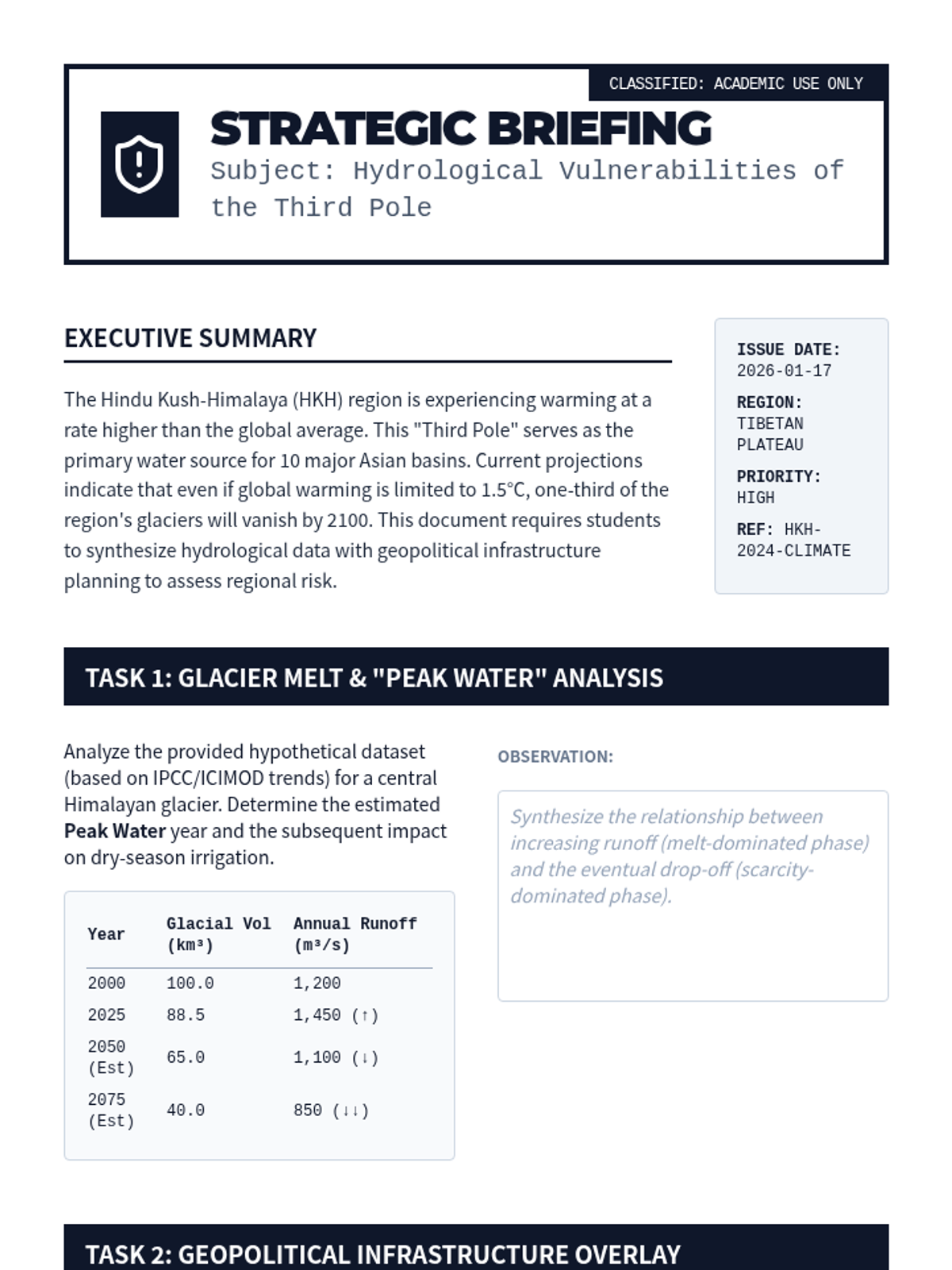 This lesson focuses on the Tibetan Plateau as the 'water tower' of Asia, examining the intersection of climate change data regarding glacial retreat and the strategic interests of China and India. Students evaluate scientific reports on hydrological changes and correlate them with state-level infrastructure planning.