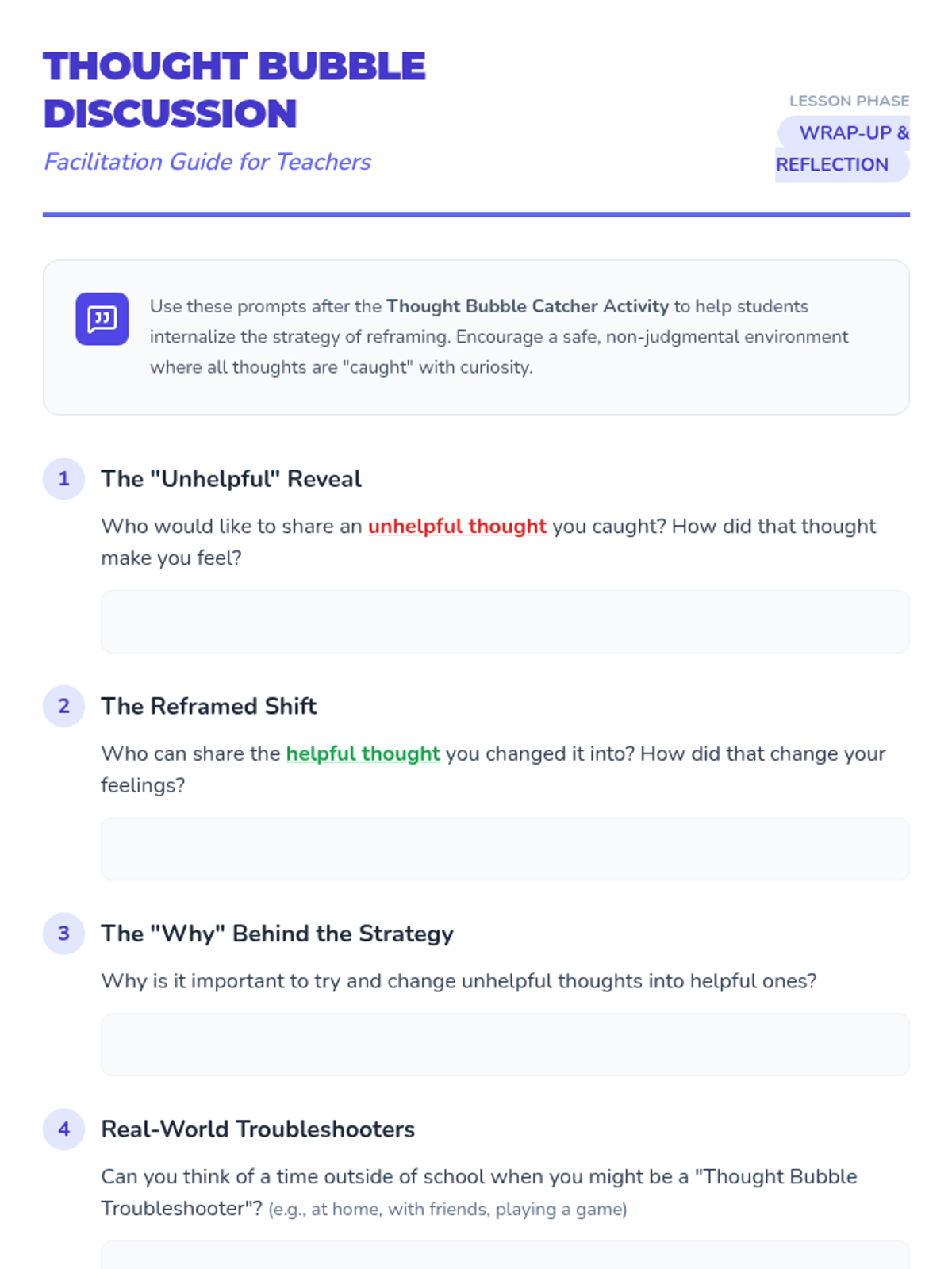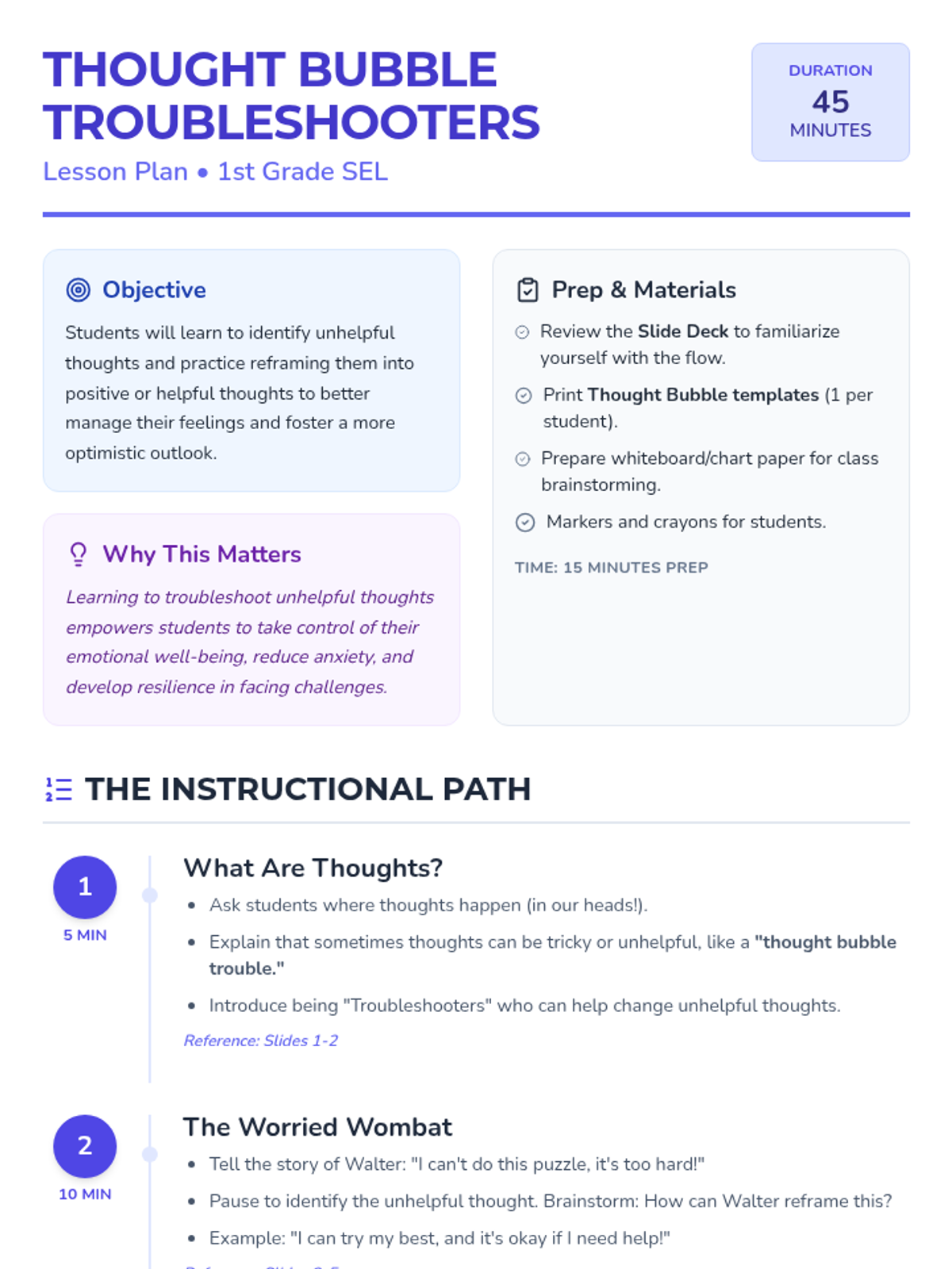 A social-emotional learning lesson for 1st graders that introduces the concept of cognitive reframing through a 'Troubleshooter' metaphor and the story of Walter the Worried Wombat.