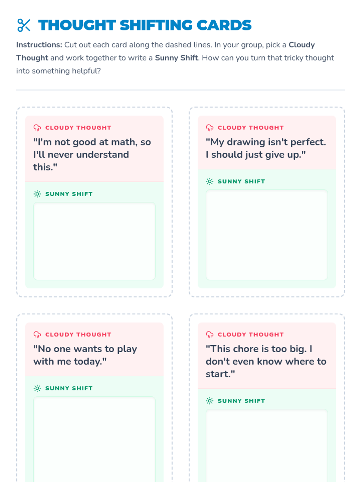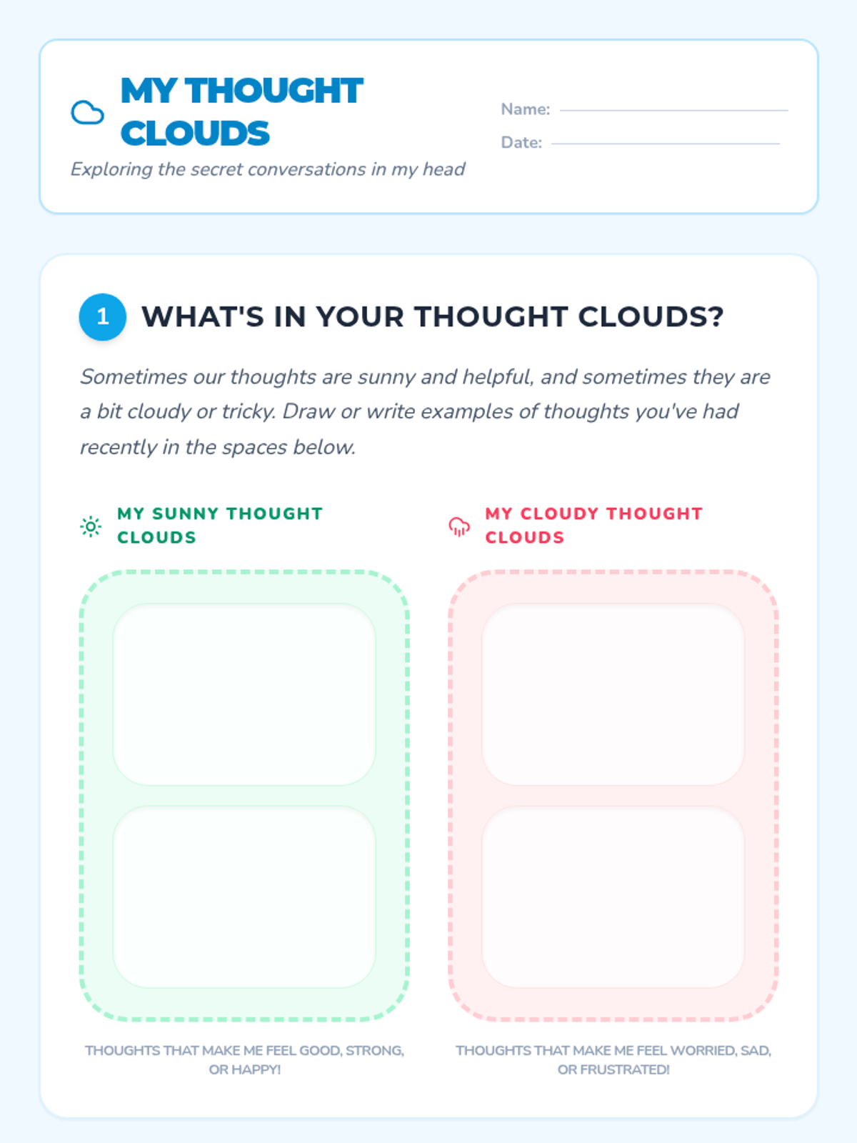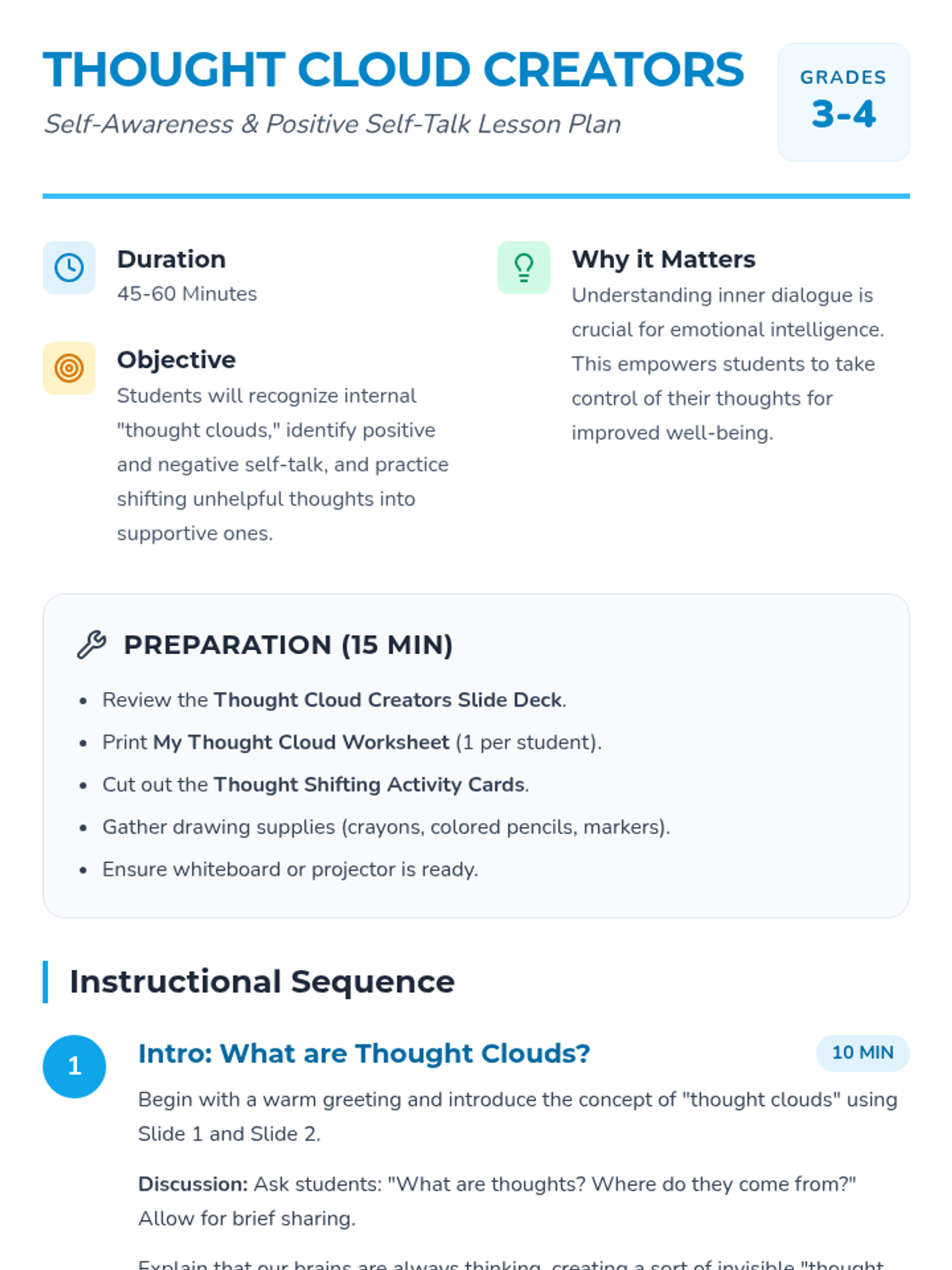 For Grades 3-4, this lesson helps students recognize and understand their 'thought clouds' – the internal conversations and ideas they have. Through reflective drawing and guided discussion, students learn to identify positive and negative self-talk and practice shifting unhelpful thoughts into more supportive ones.