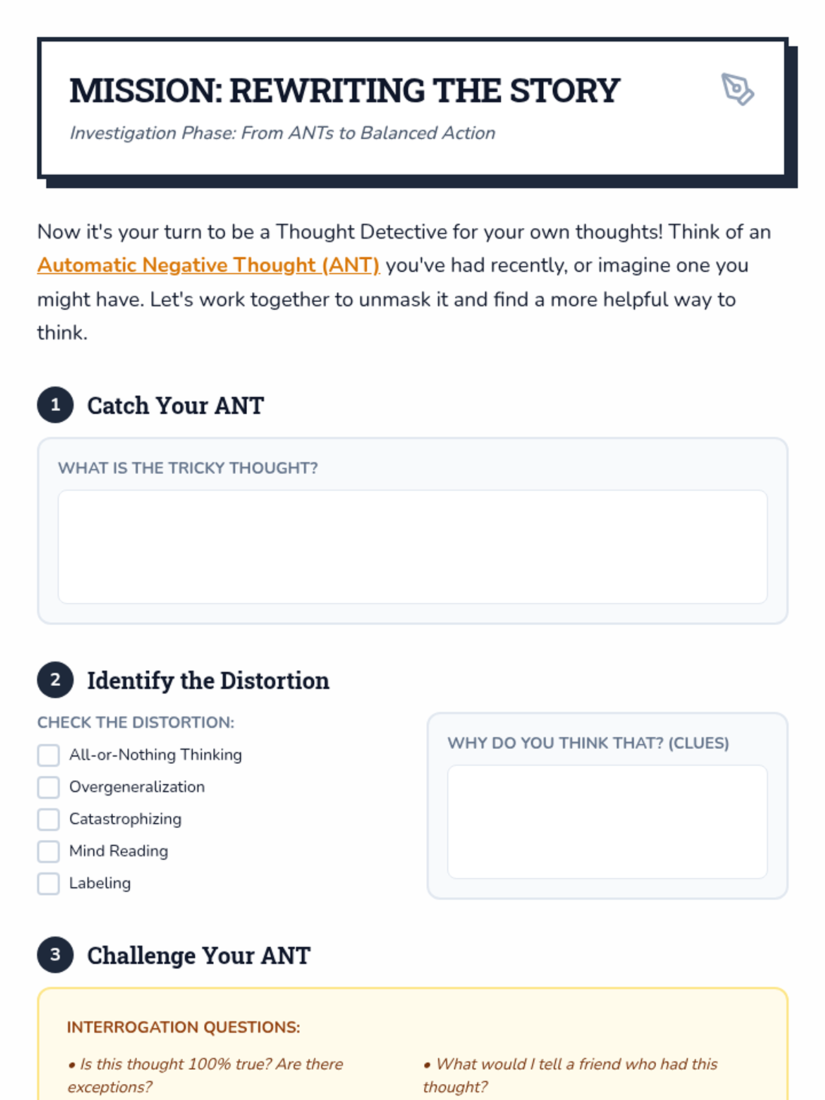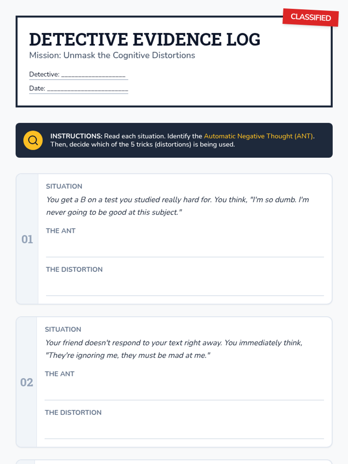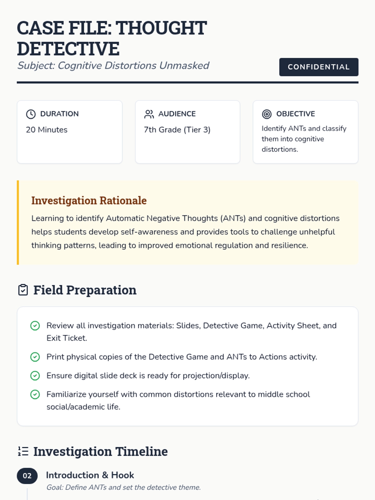 A 20-minute Tier 3 intervention for 7th graders to identify and classify Automatic Negative Thoughts (ANTs) using cognitive distortion categories. Students learn to become 'Thought Detectives' to challenge unhelpful thinking patterns.