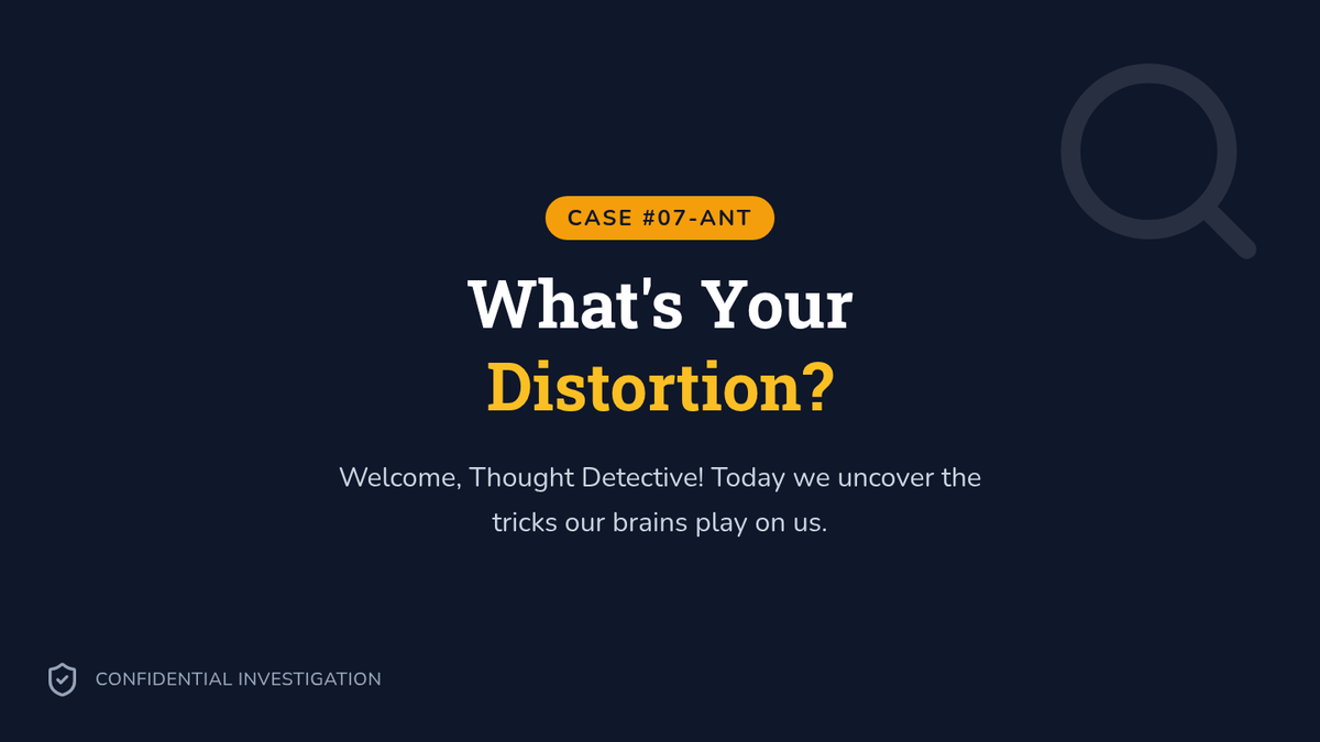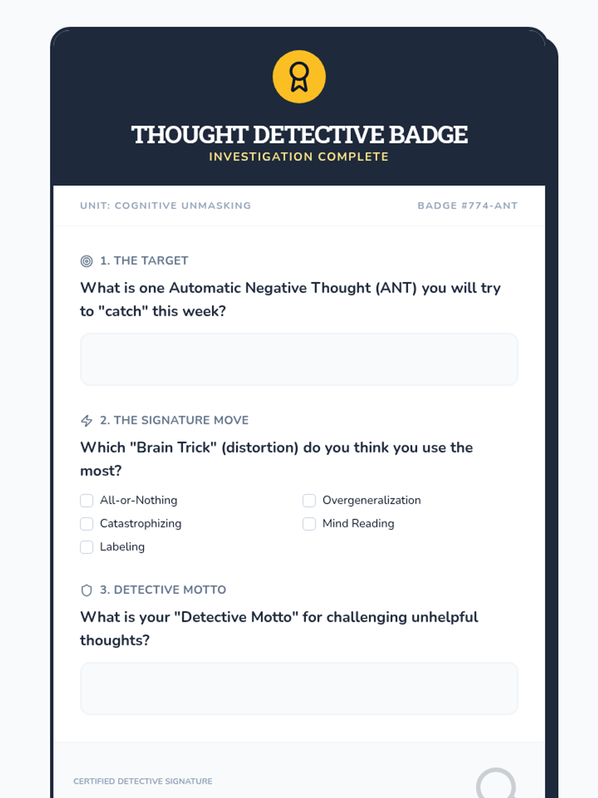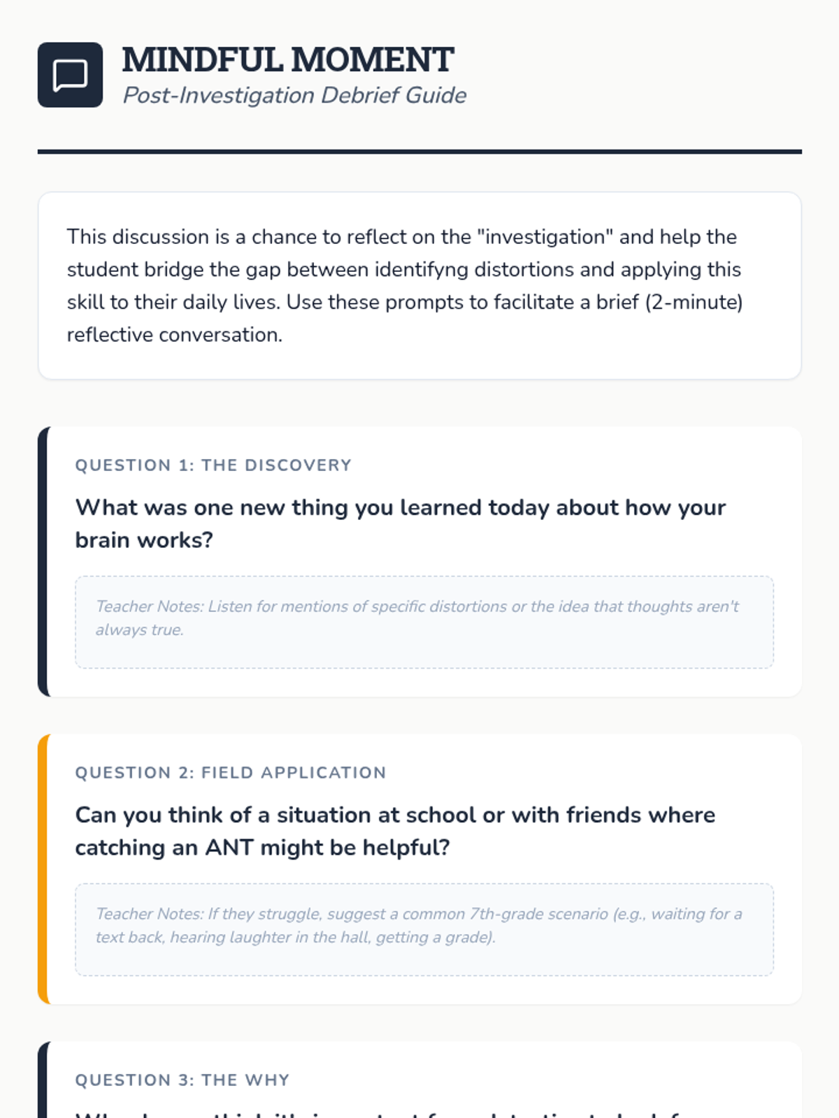 A 20-minute Tier 3 intervention for 7th graders to identify and classify Automatic Negative Thoughts (ANTs) using cognitive distortion categories. Students learn to become 'Thought Detectives' to challenge unhelpful thinking patterns.