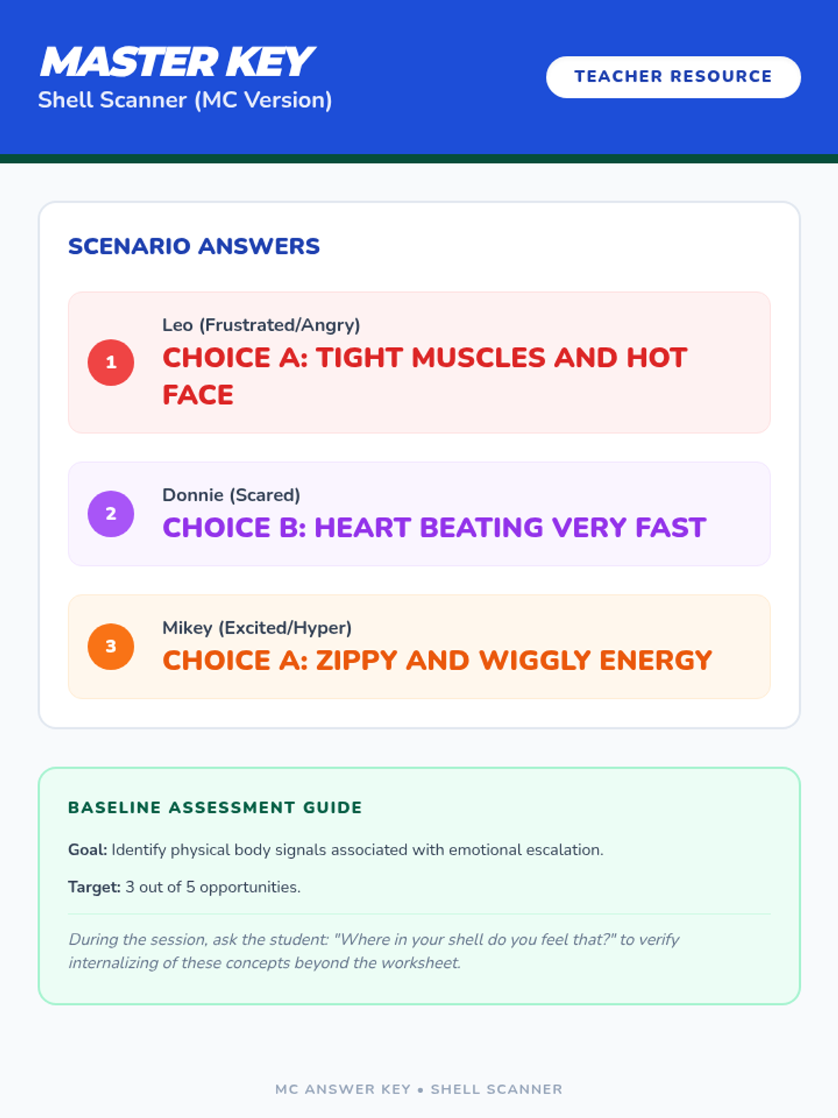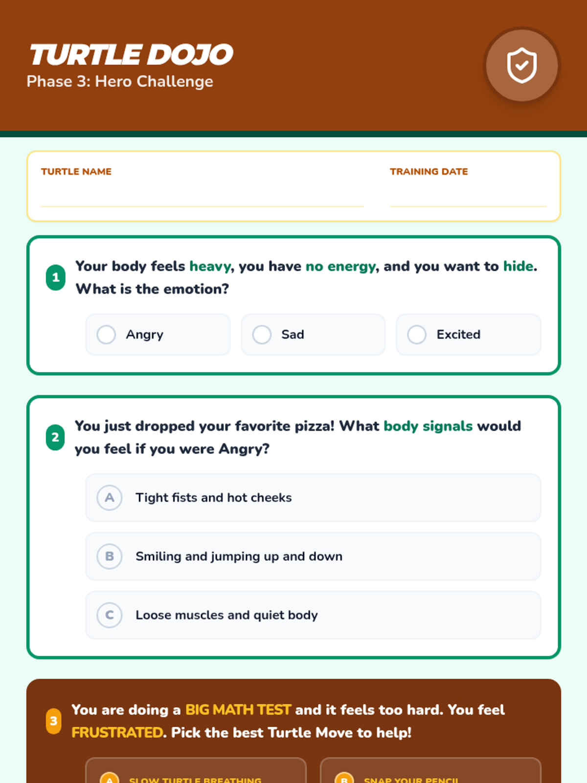 A series of baseline assessment worksheets themed around turtle power to help a second-grade student identify body signals, label emotions, and select regulation strategies.