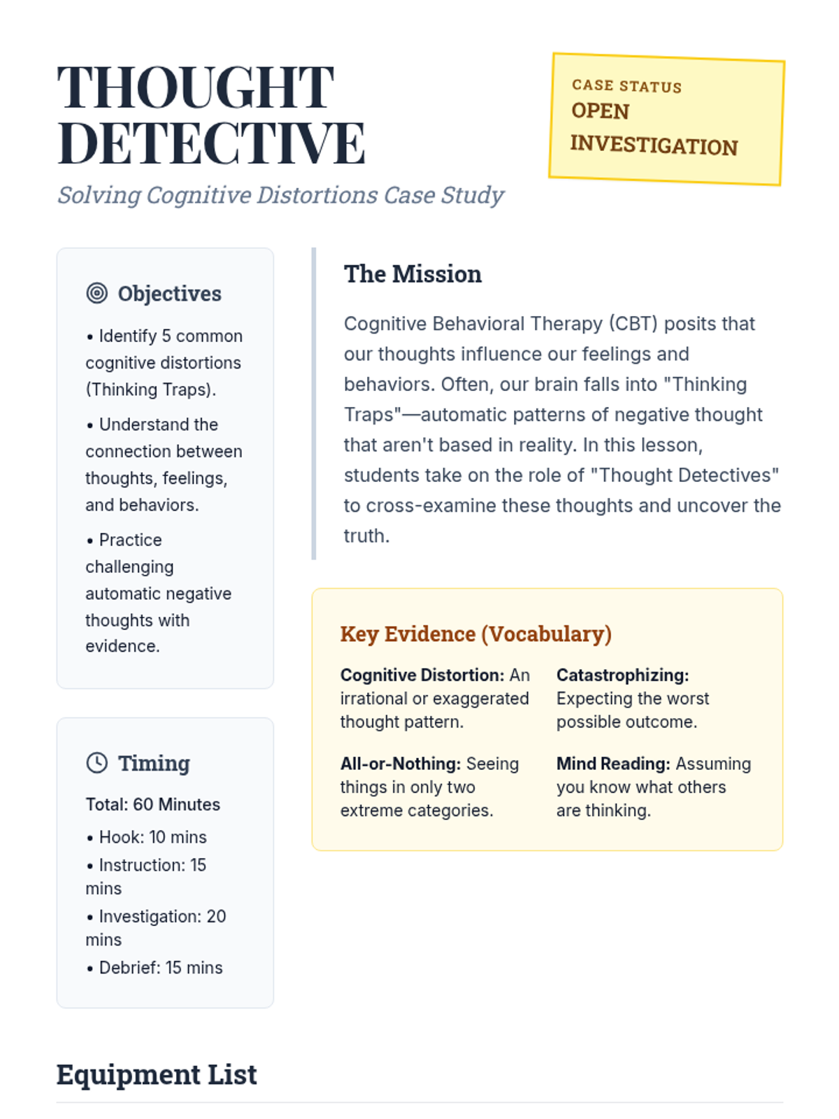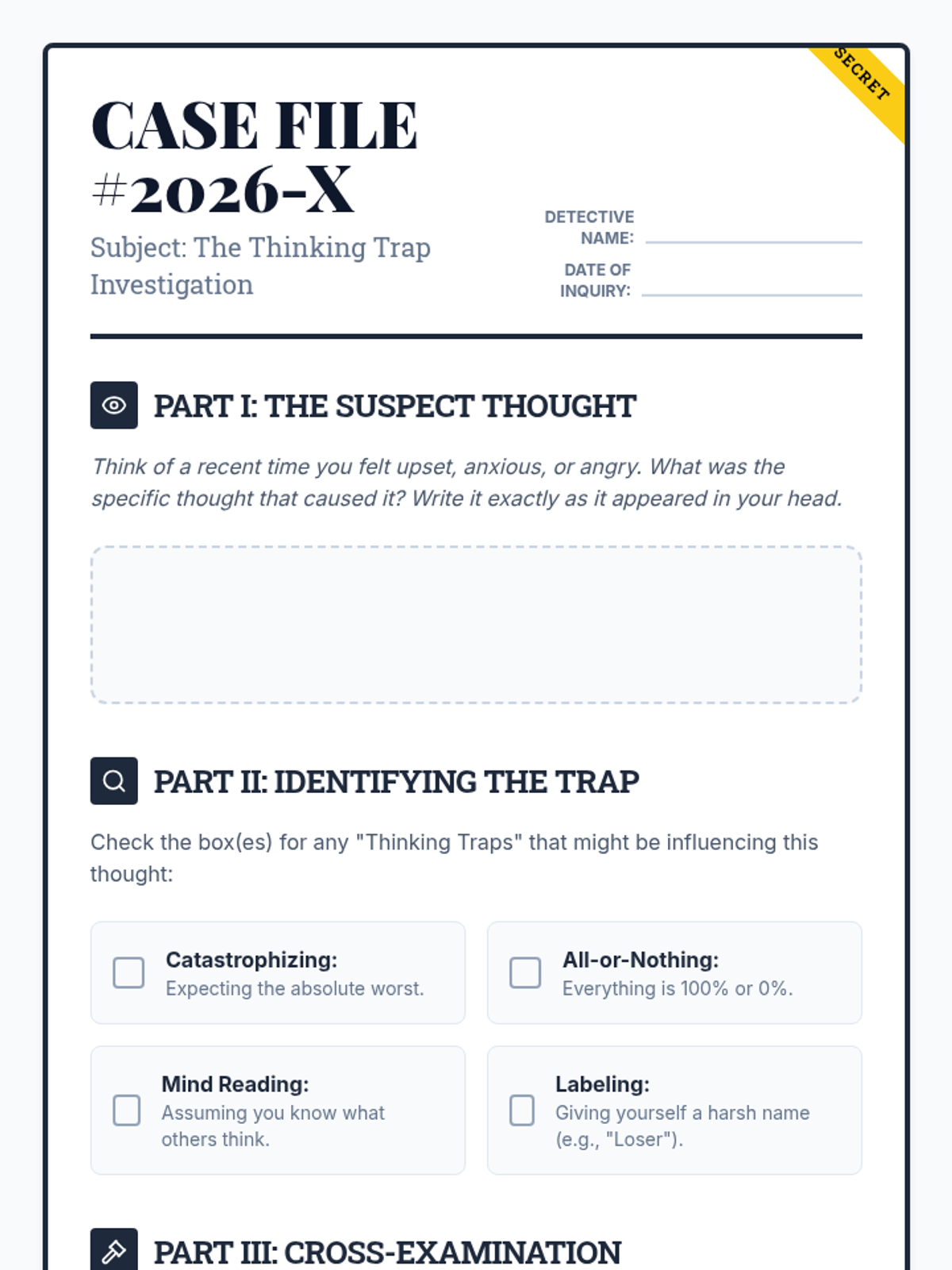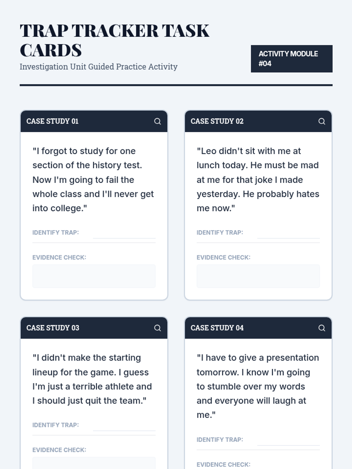 Students become mental detectives to track down and debunk cognitive distortions. They'll learn to identify common 'thinking traps' and use evidence-based questioning to find more balanced perspectives.