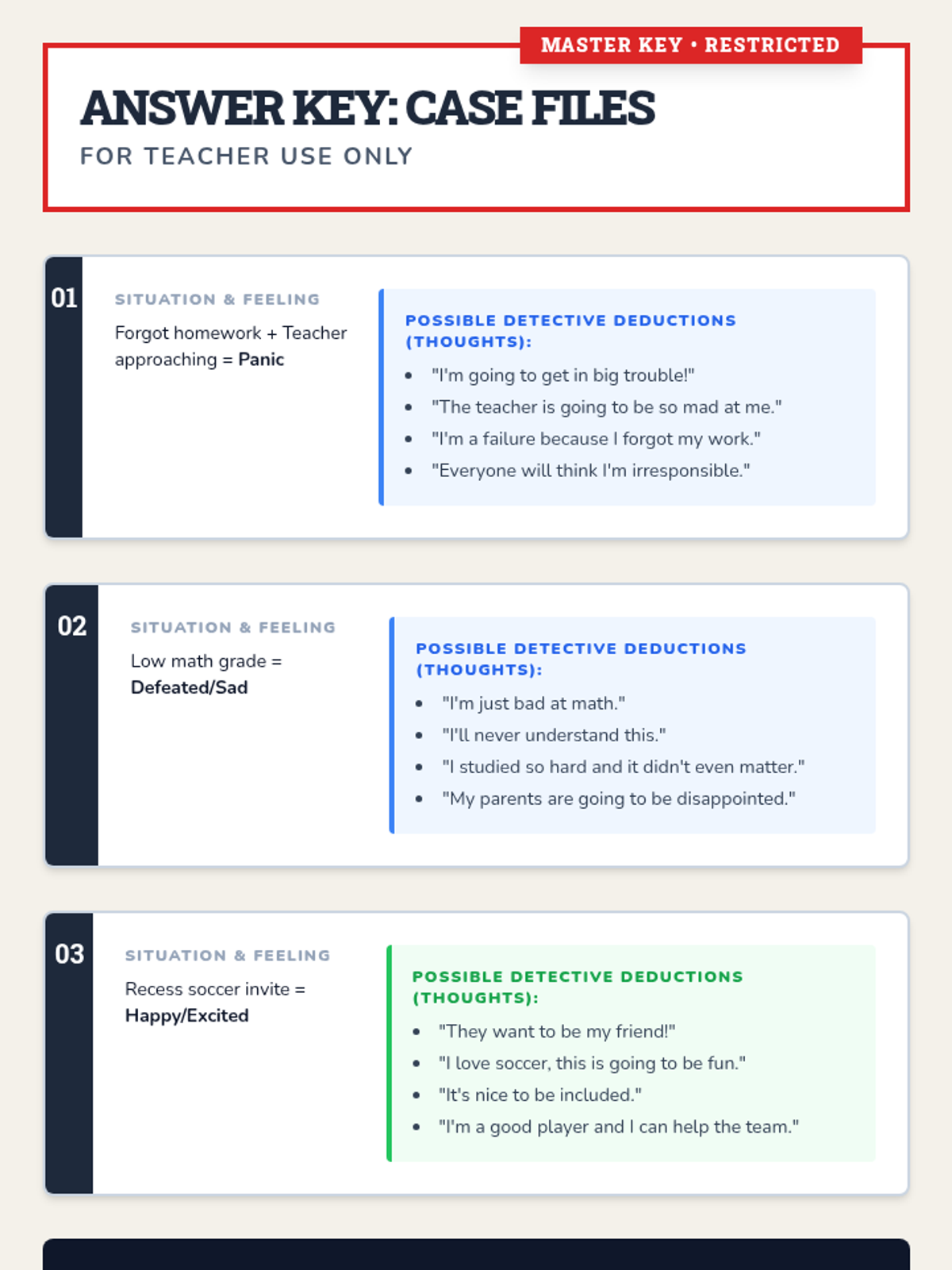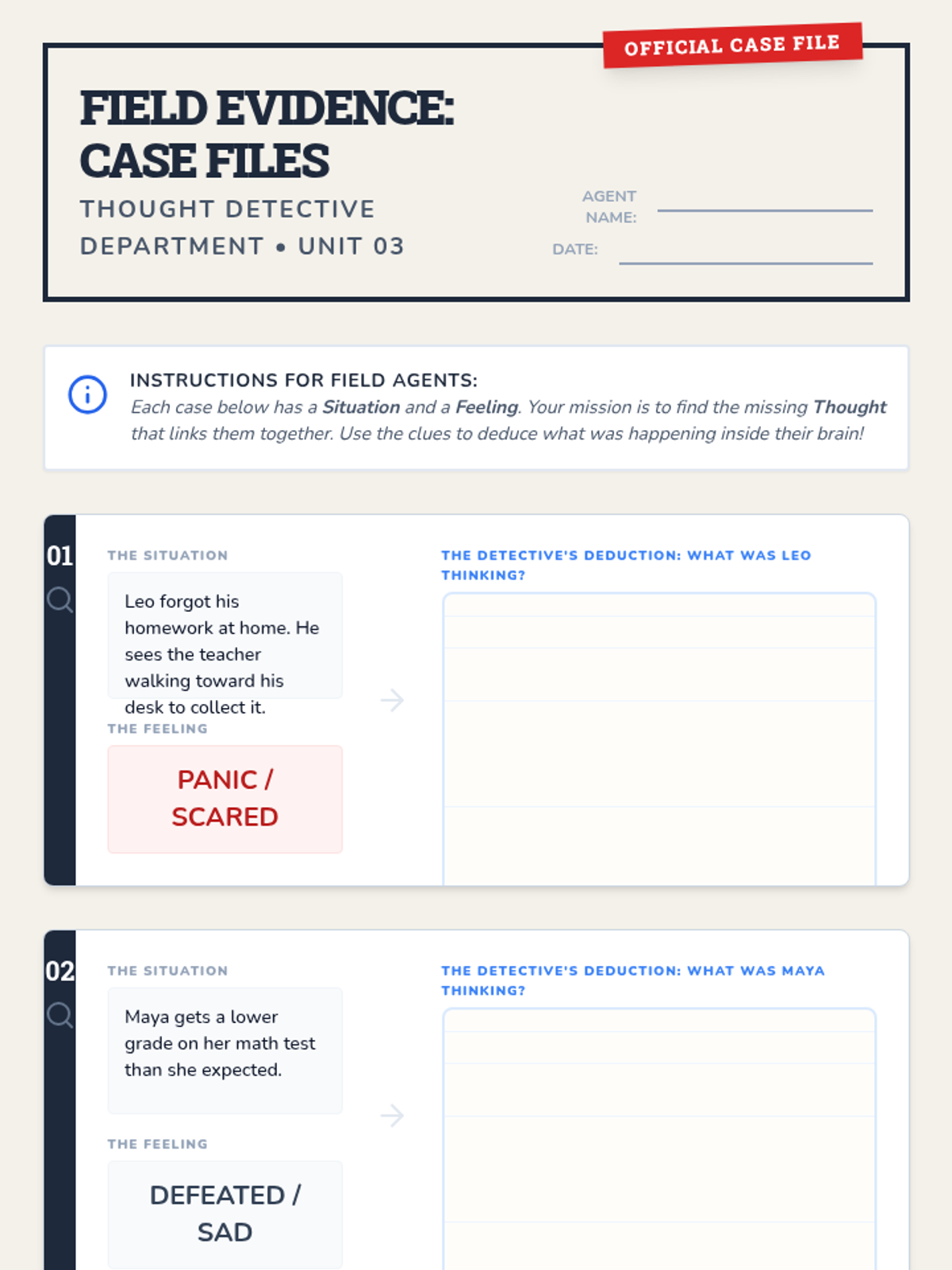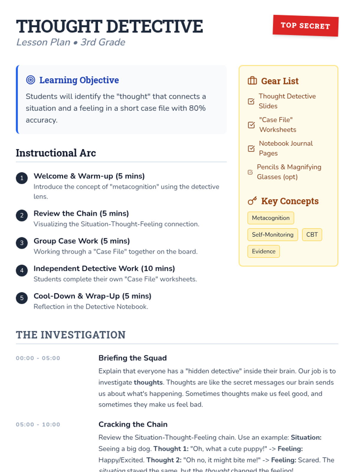 A 30-minute 3rd-grade lesson focusing on metacognition by teaching students to identify the 'thought' that connects a situation and a feeling. Students act as 'Thought Detectives' to solve psychological mysteries.