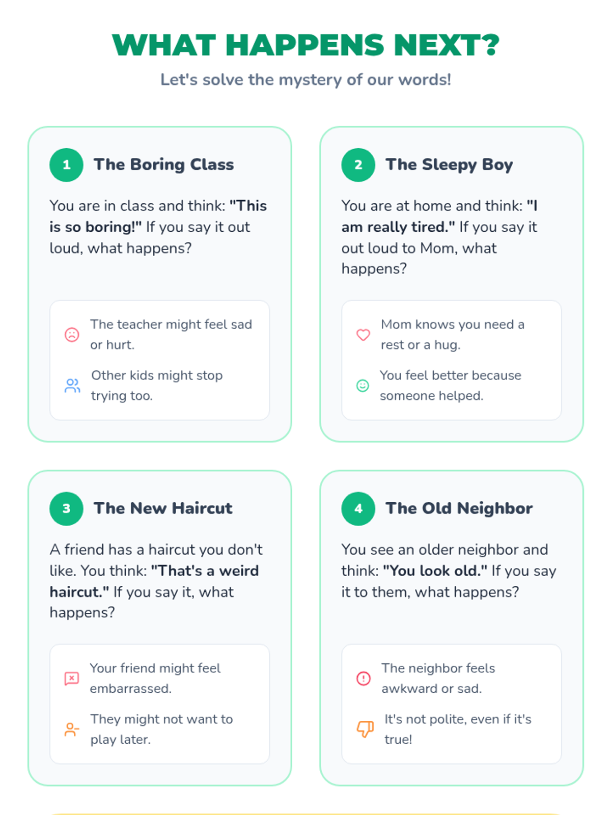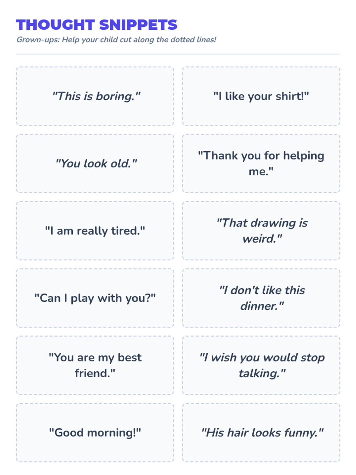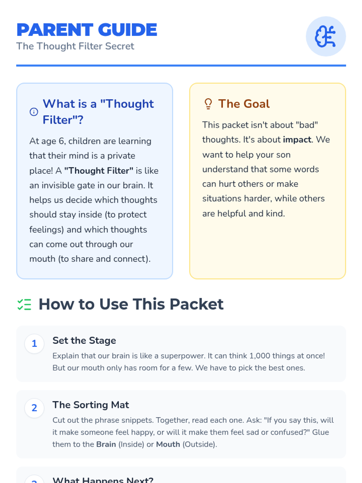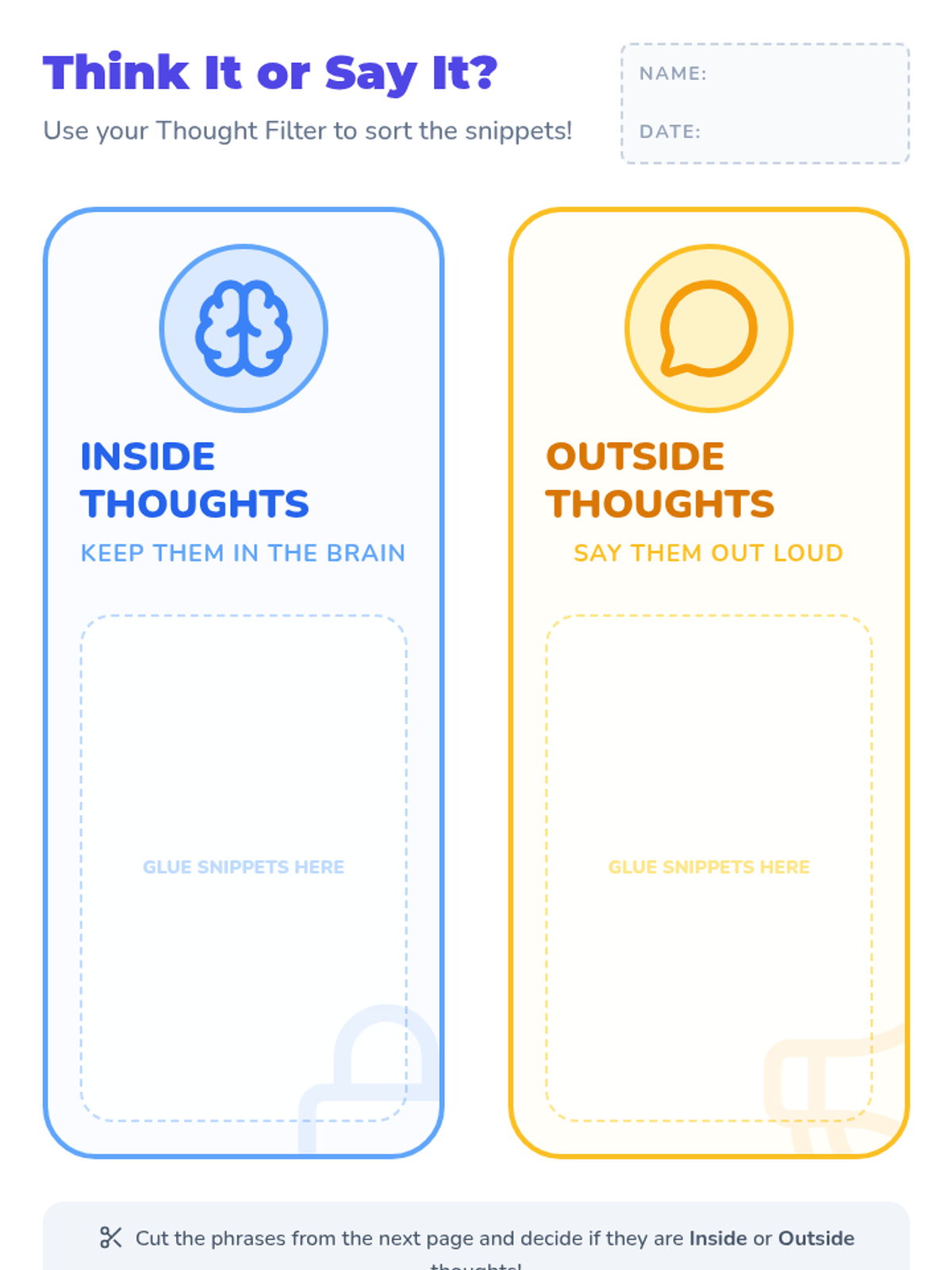 A home-based activity packet designed for a 6-year-old and their parent to explore the difference between "Inside Thoughts" (thoughts we keep to ourselves) and "Outside Thoughts" (thoughts we say out loud). The lesson focuses on social-emotional learning through hands-on sorting and consequence-based reasoning.