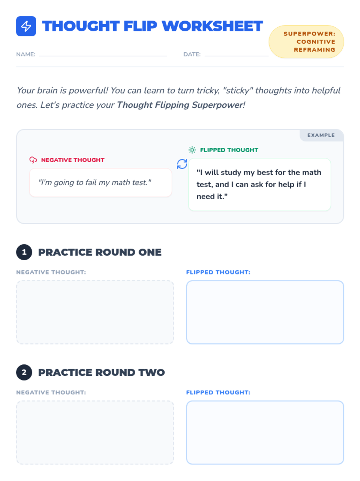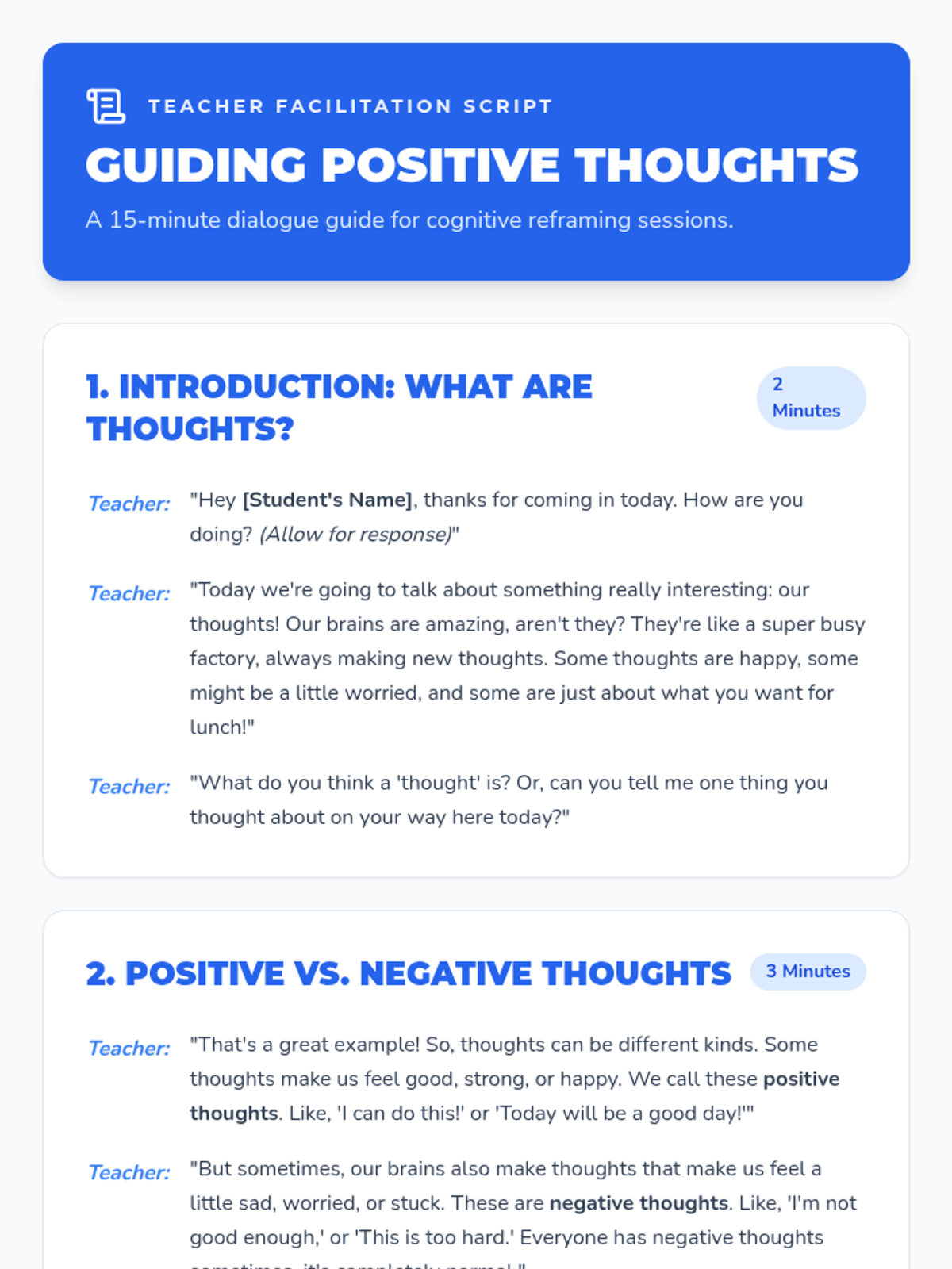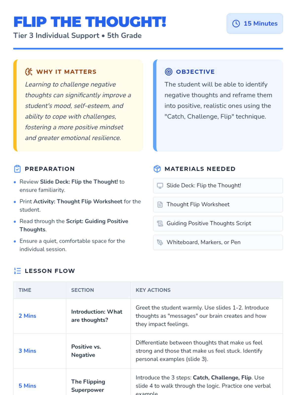 This 15-minute individual Tier 3 lesson for a 5th-grade student focuses on identifying negative thoughts and using cognitive reframing to transform them into positive, empowering ones. Students will learn the three-step 'Catch, Challenge, Flip' technique to build resilience and self-esteem.