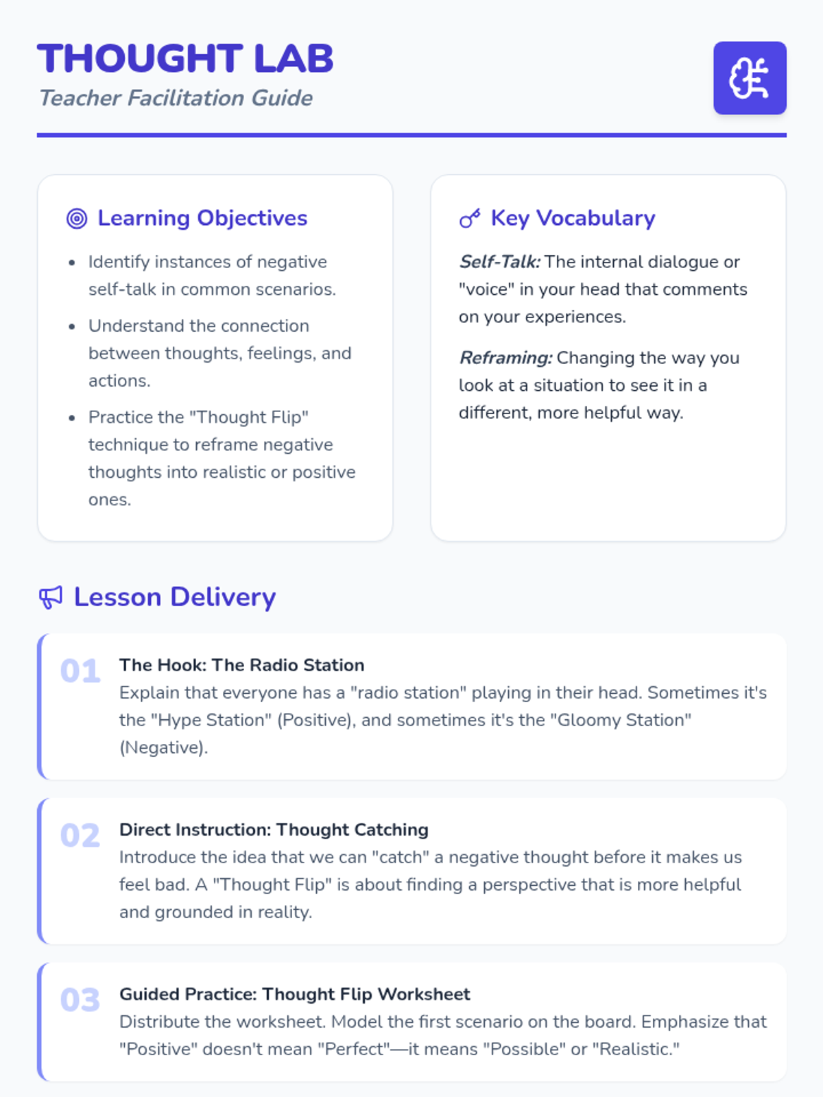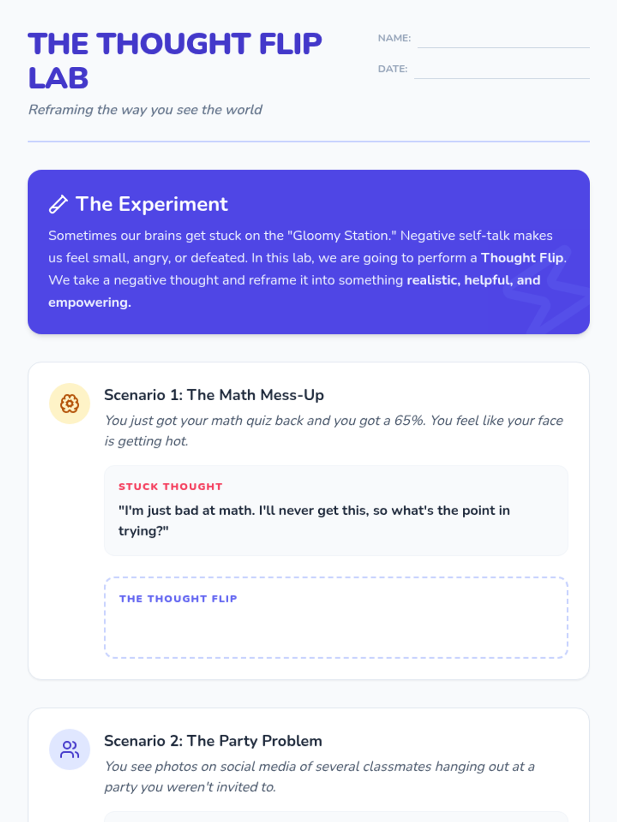 This lesson introduces students to the concept of negative self-talk and provides practical tools for reframing thoughts into more positive or realistic perspectives through a series of relatable scenarios.