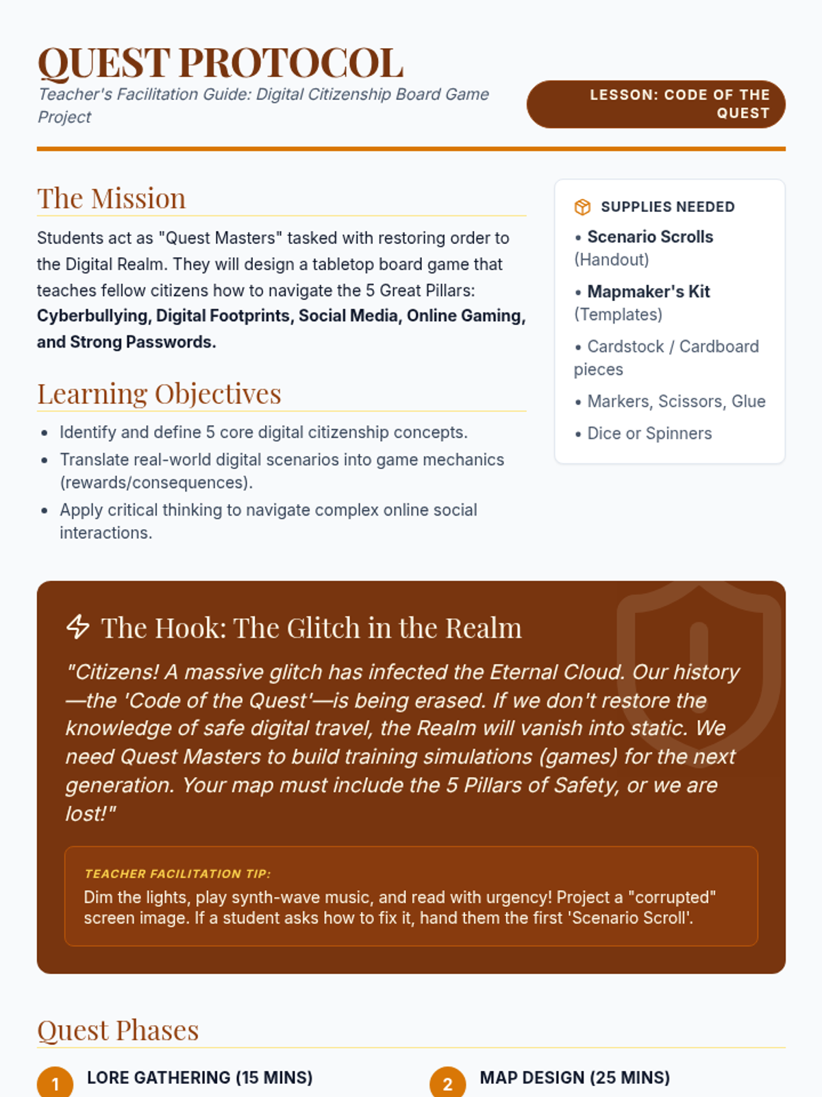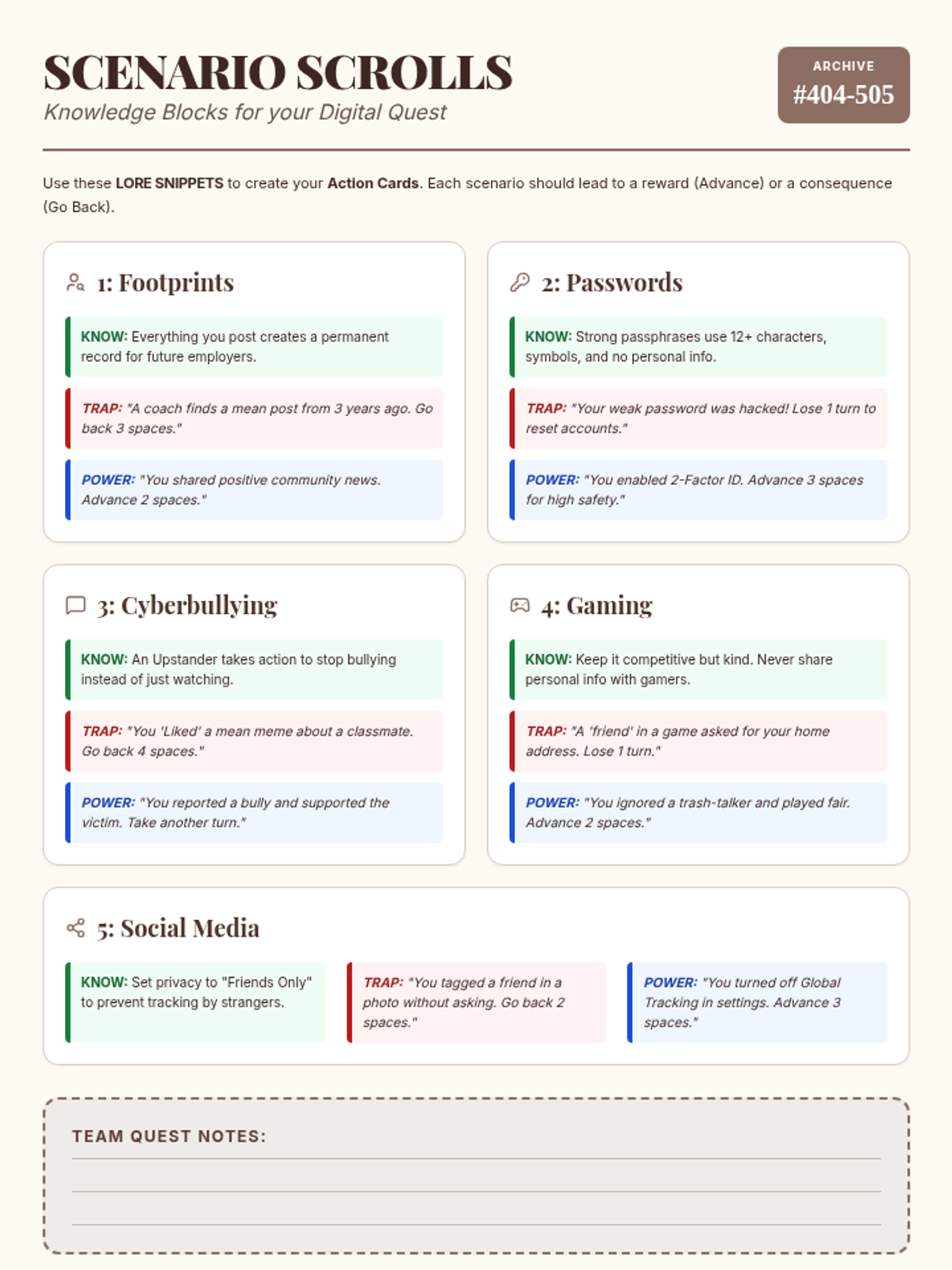 A hands-on lesson where students design and build a board game to master digital citizenship. Through a quest-themed hook and scenario-building activities, they explore cyberbullying, digital footprints, and online safety.