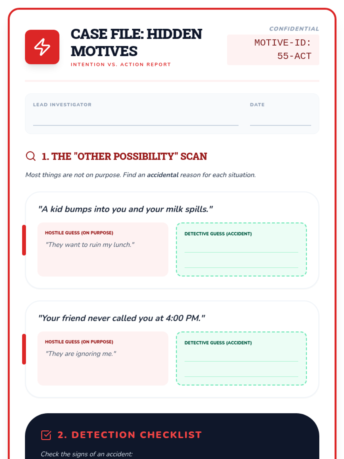 Distinguishing between what people do (actions) and why they do it (intentions). Helps students avoid jumping to negative conclusions by considering "accidental" vs. "on purpose."