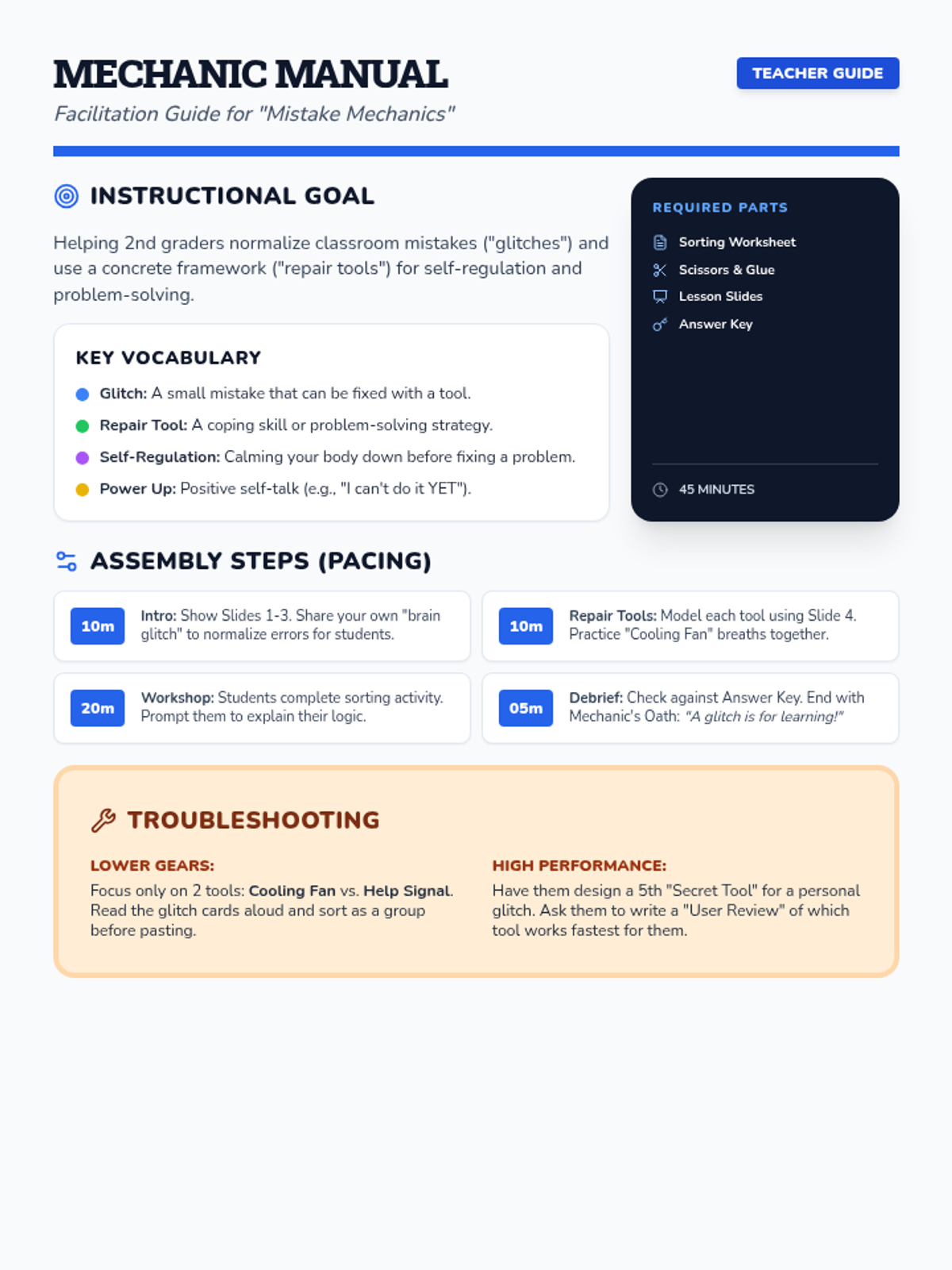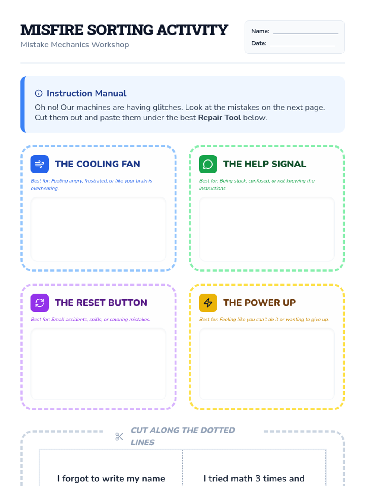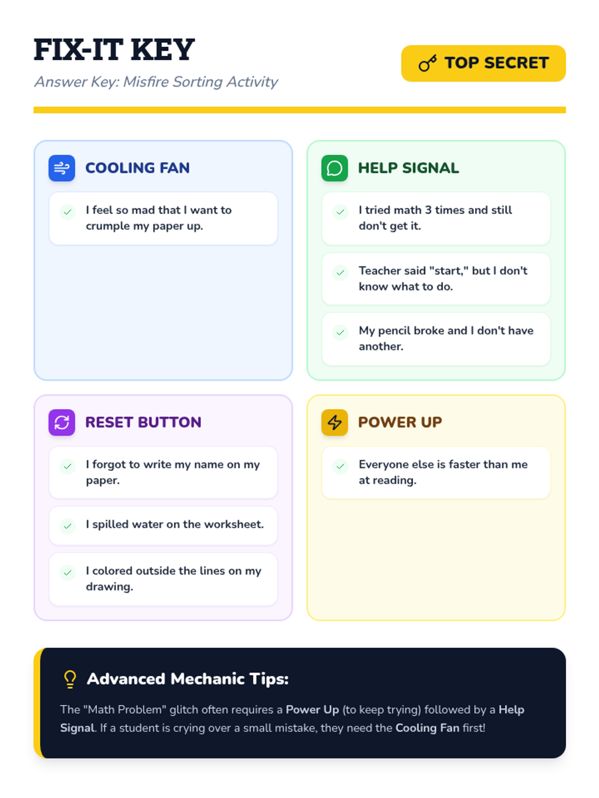 A lesson focused on identifying common classroom mistakes and matching them with healthy emotional regulation and problem-solving coping strategies.