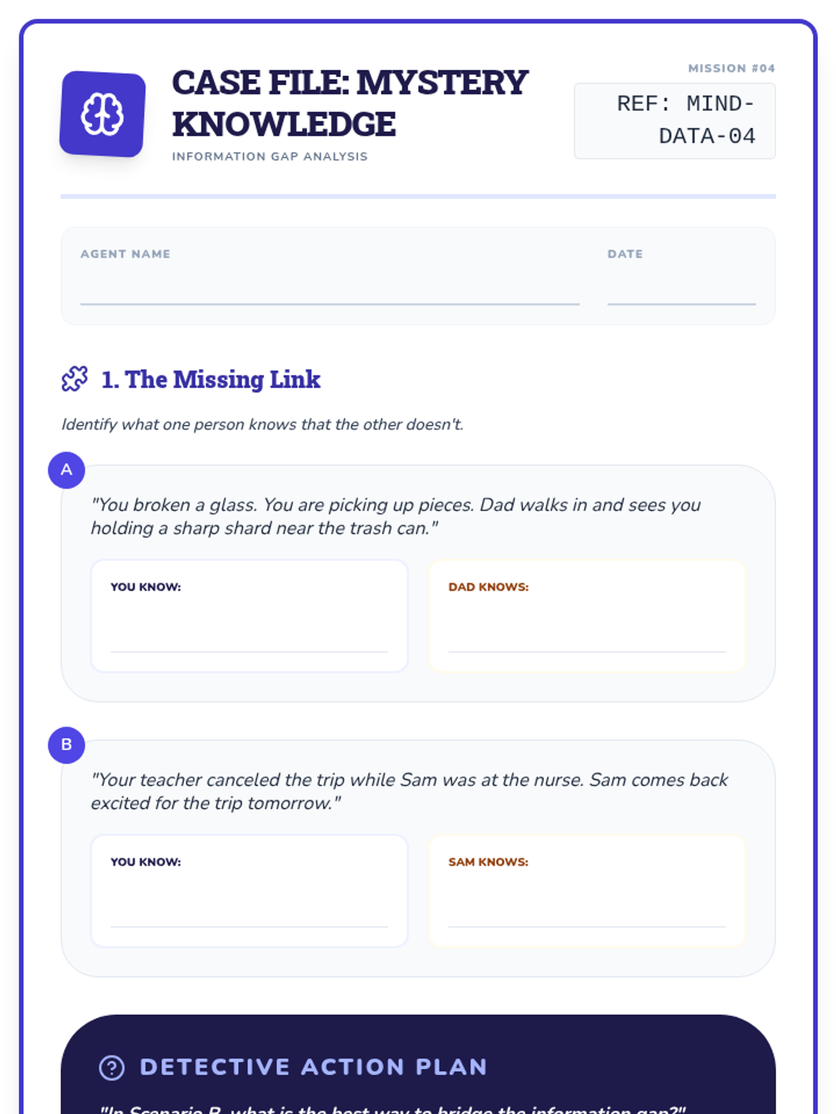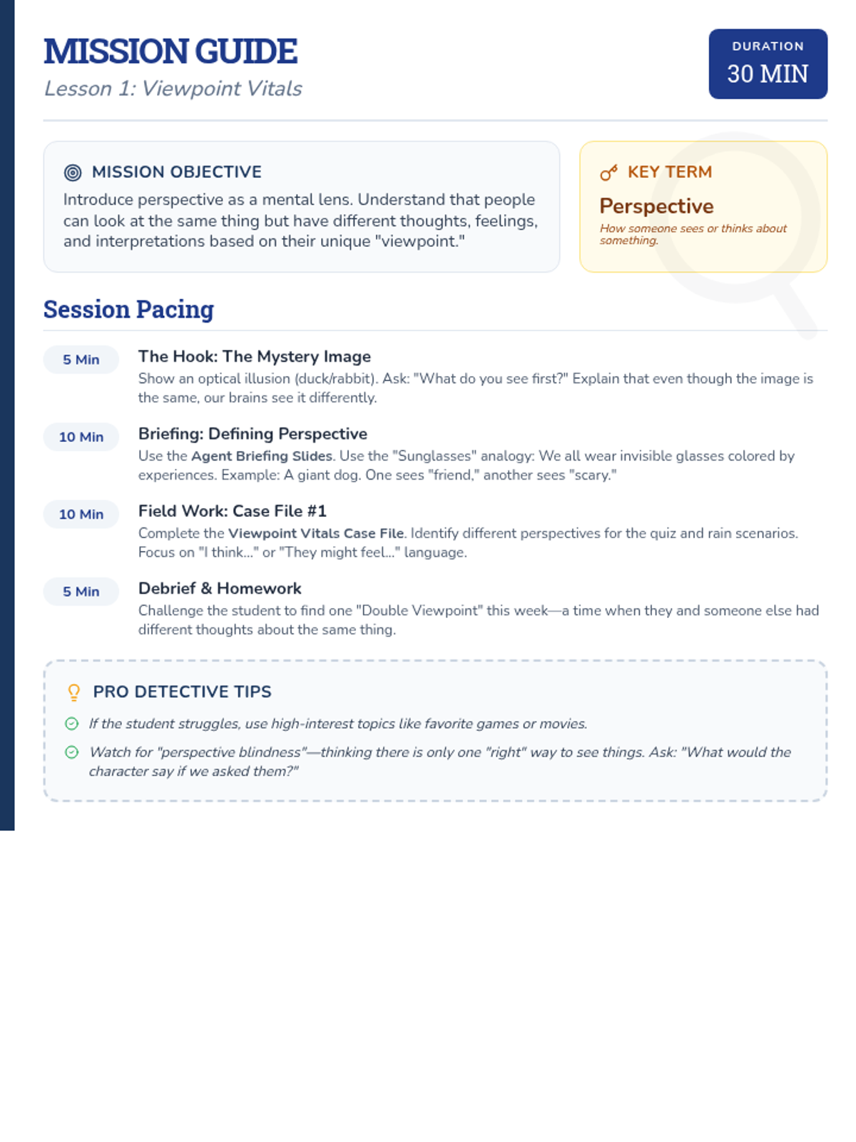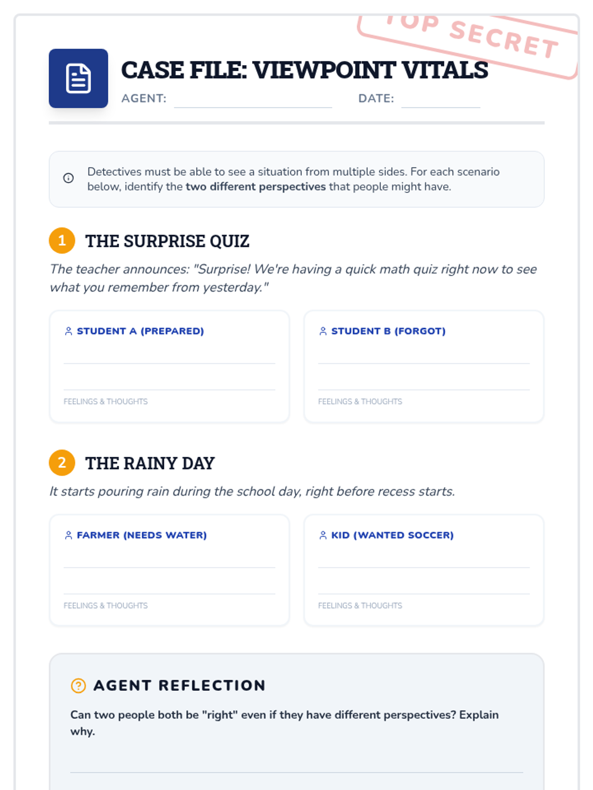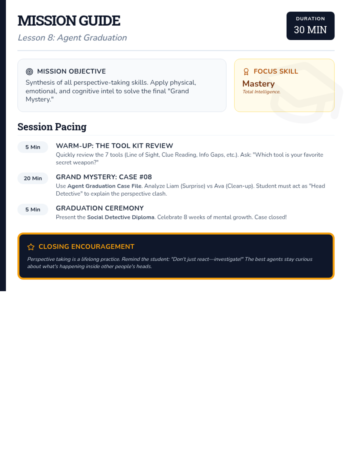A final review and synthesis of all perspective-taking skills. Students solve a complex "Social Mystery" using all the tools in their detective kit.