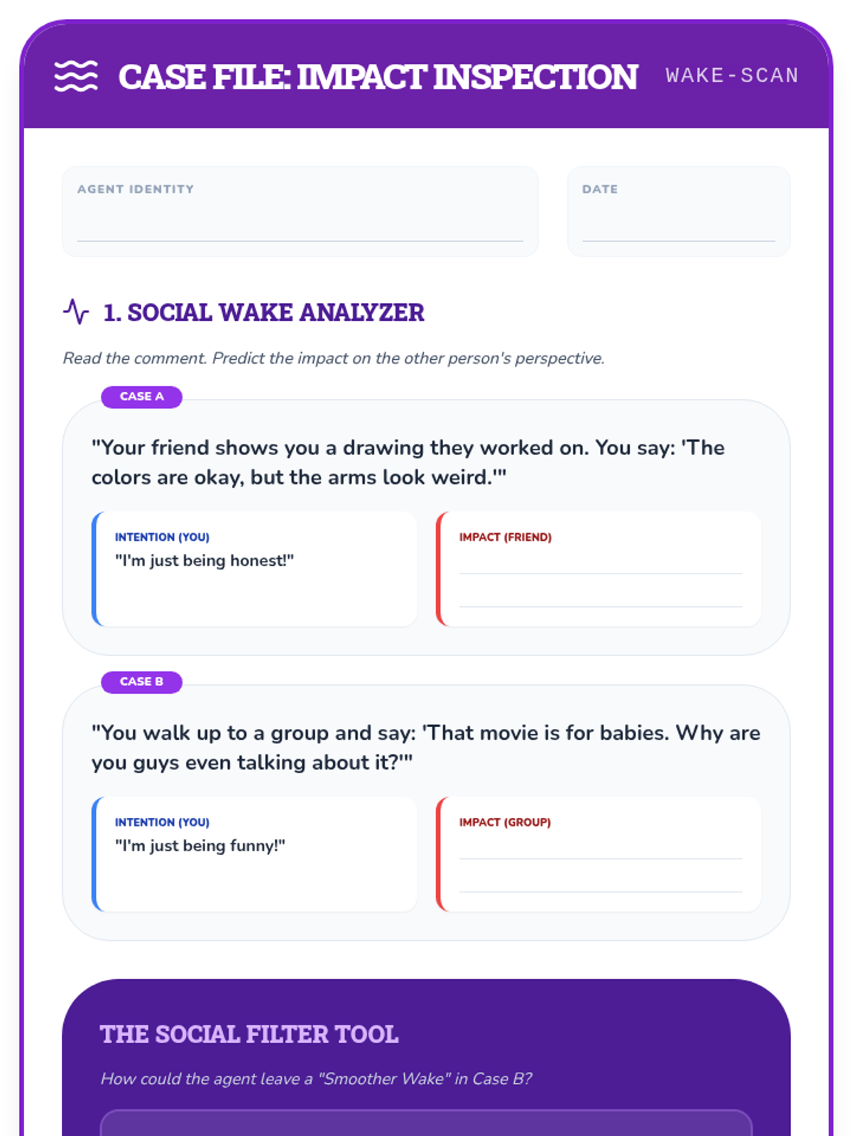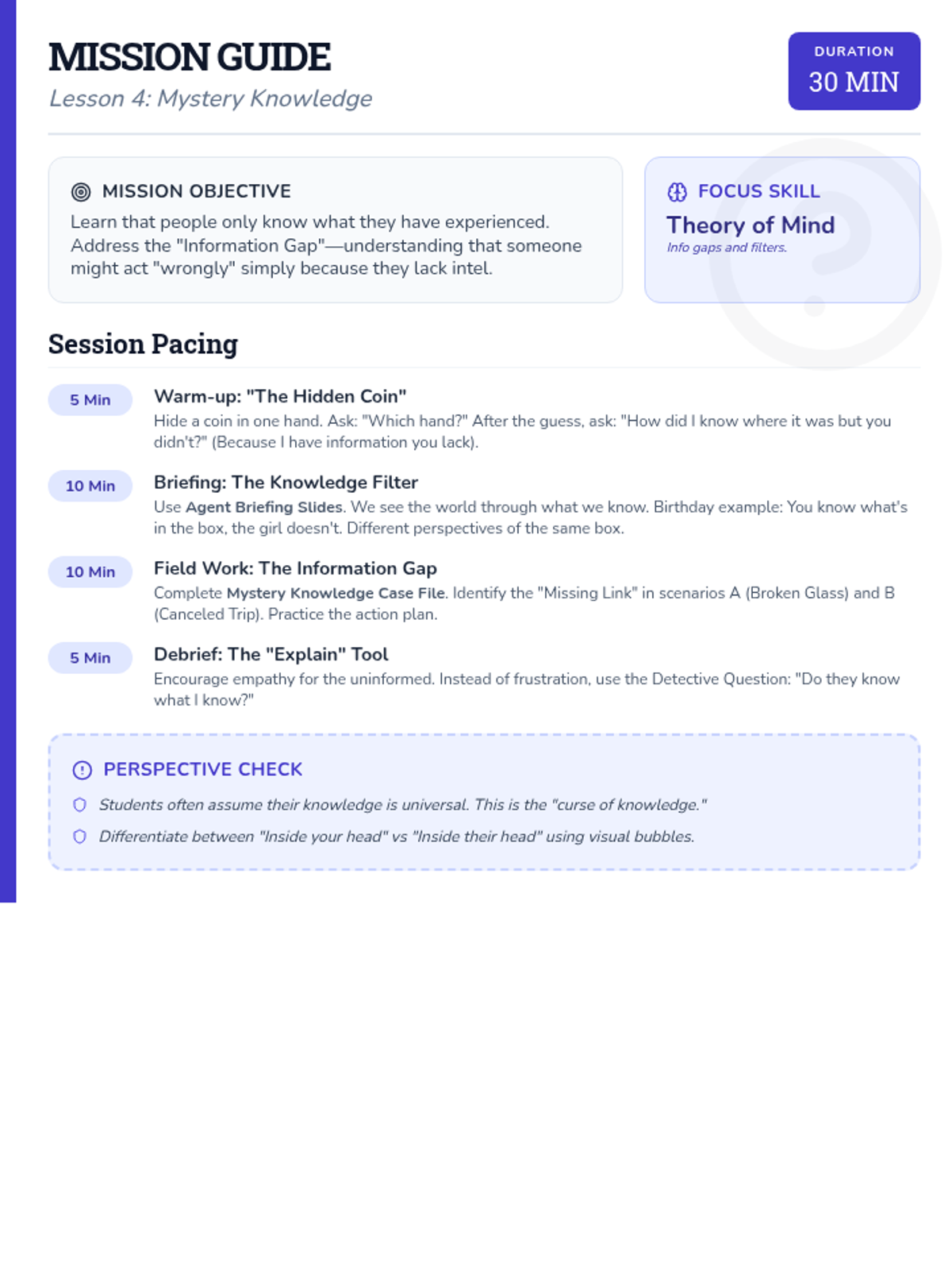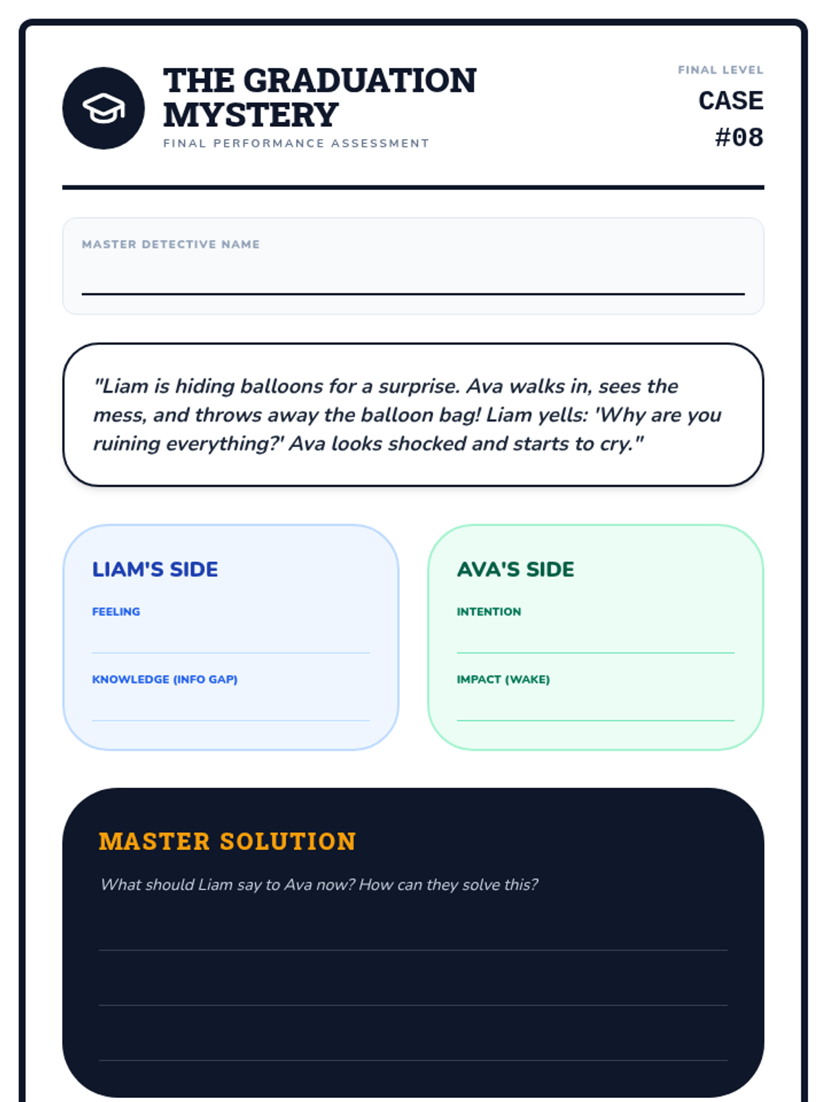 A final review and synthesis of all perspective-taking skills. Students solve a complex "Social Mystery" using all the tools in their detective kit.