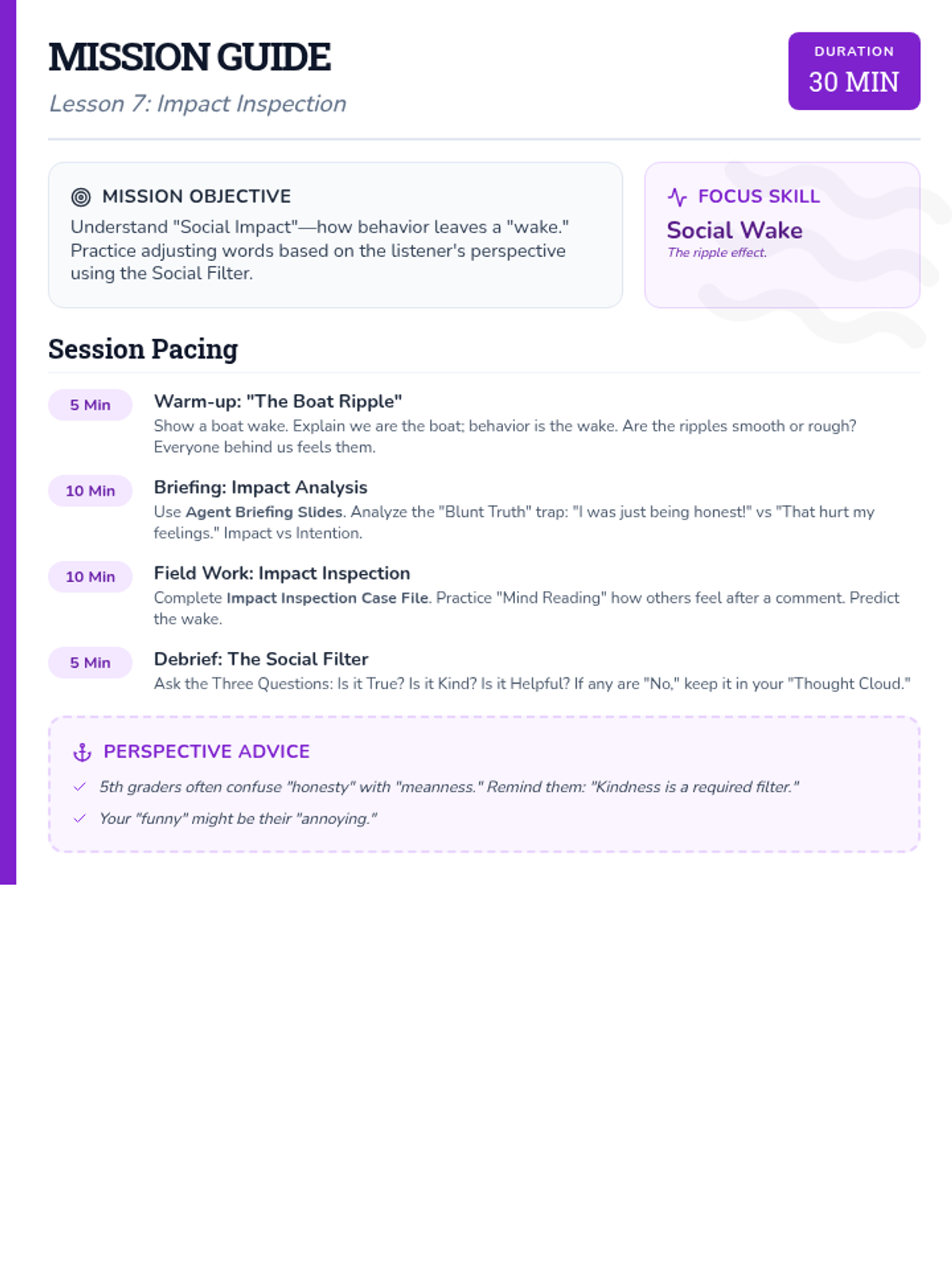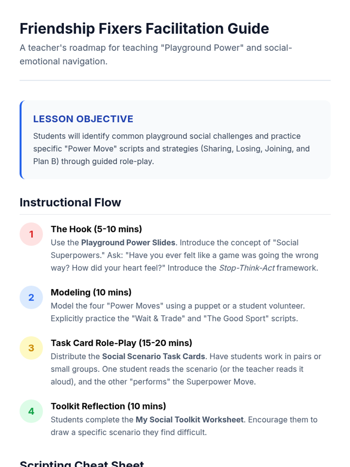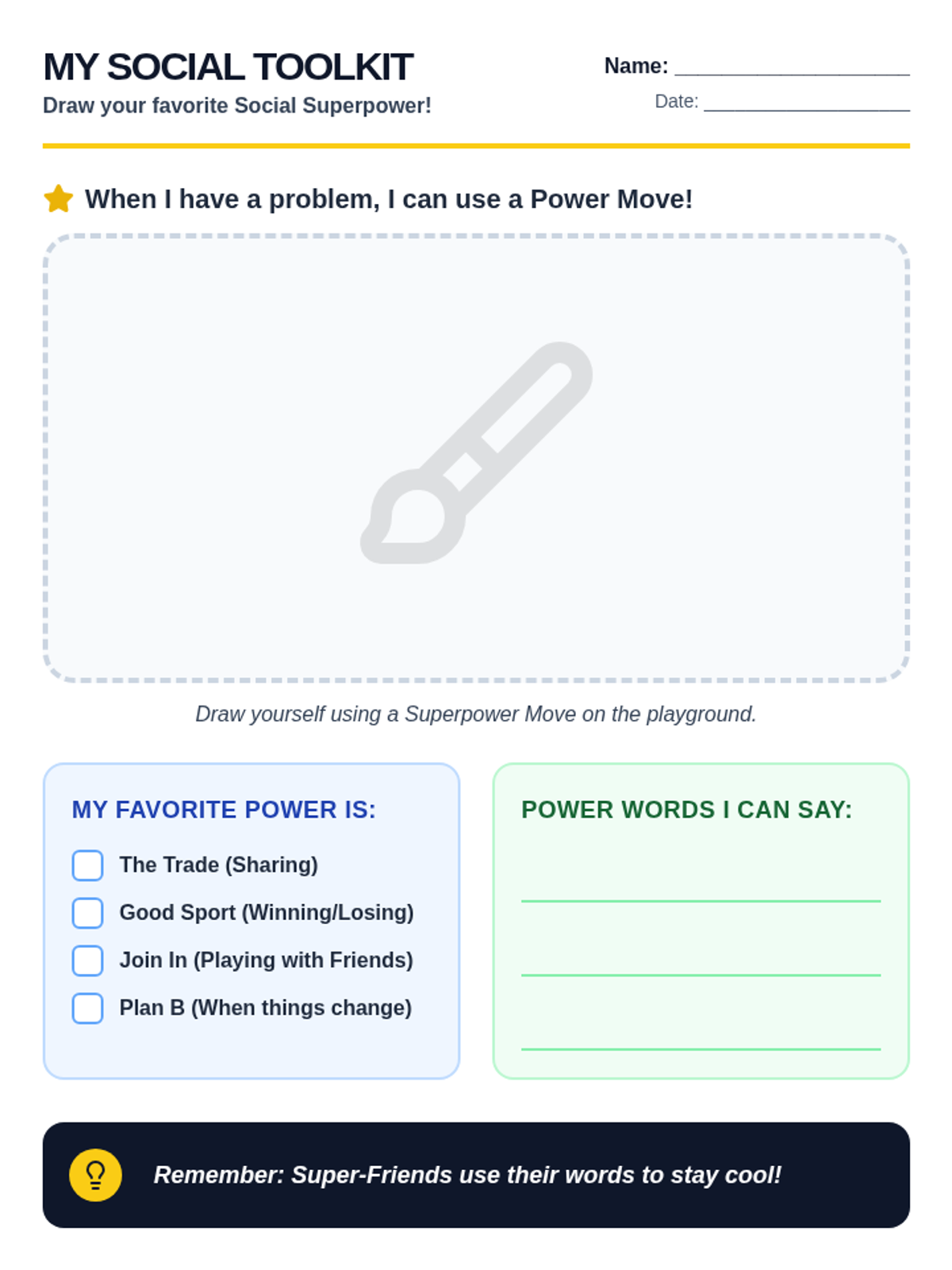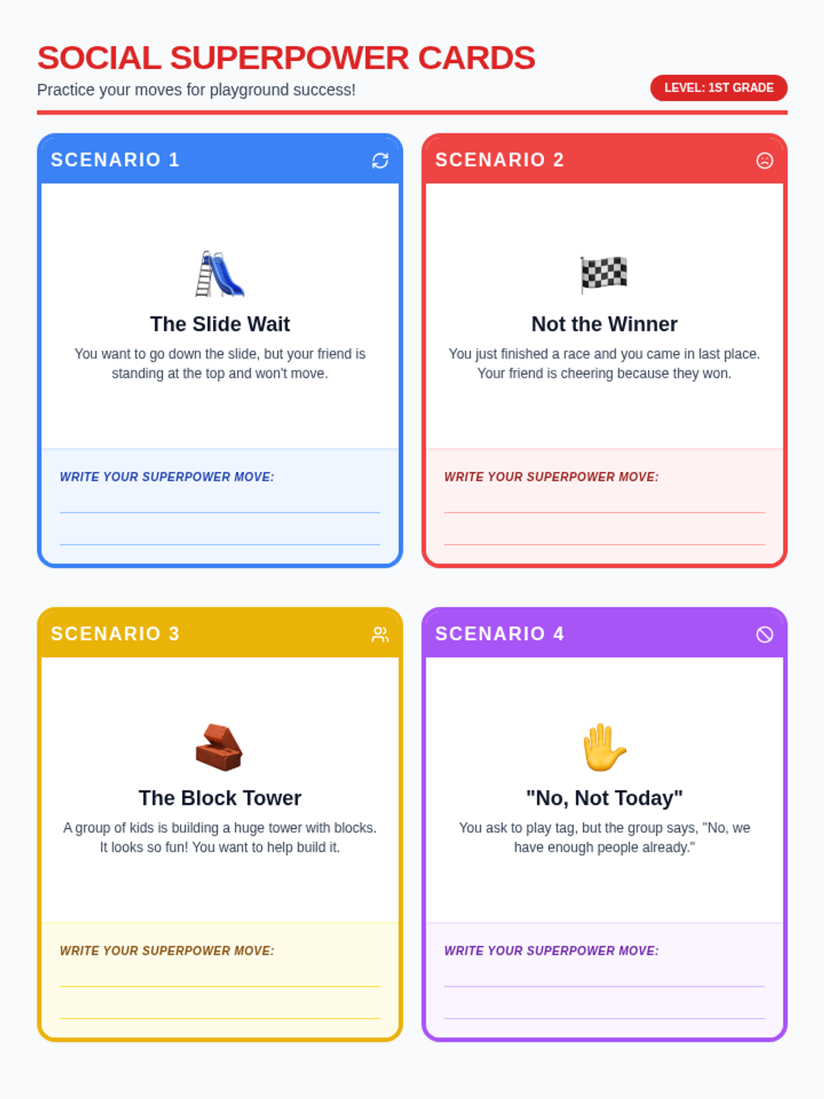 A lesson focused on equipping 1st graders with 'Social Superpowers' to navigate common peer interaction challenges like sharing, losing, and joining groups. Students will practice specific scripts and strategies through role-play and visual task cards.