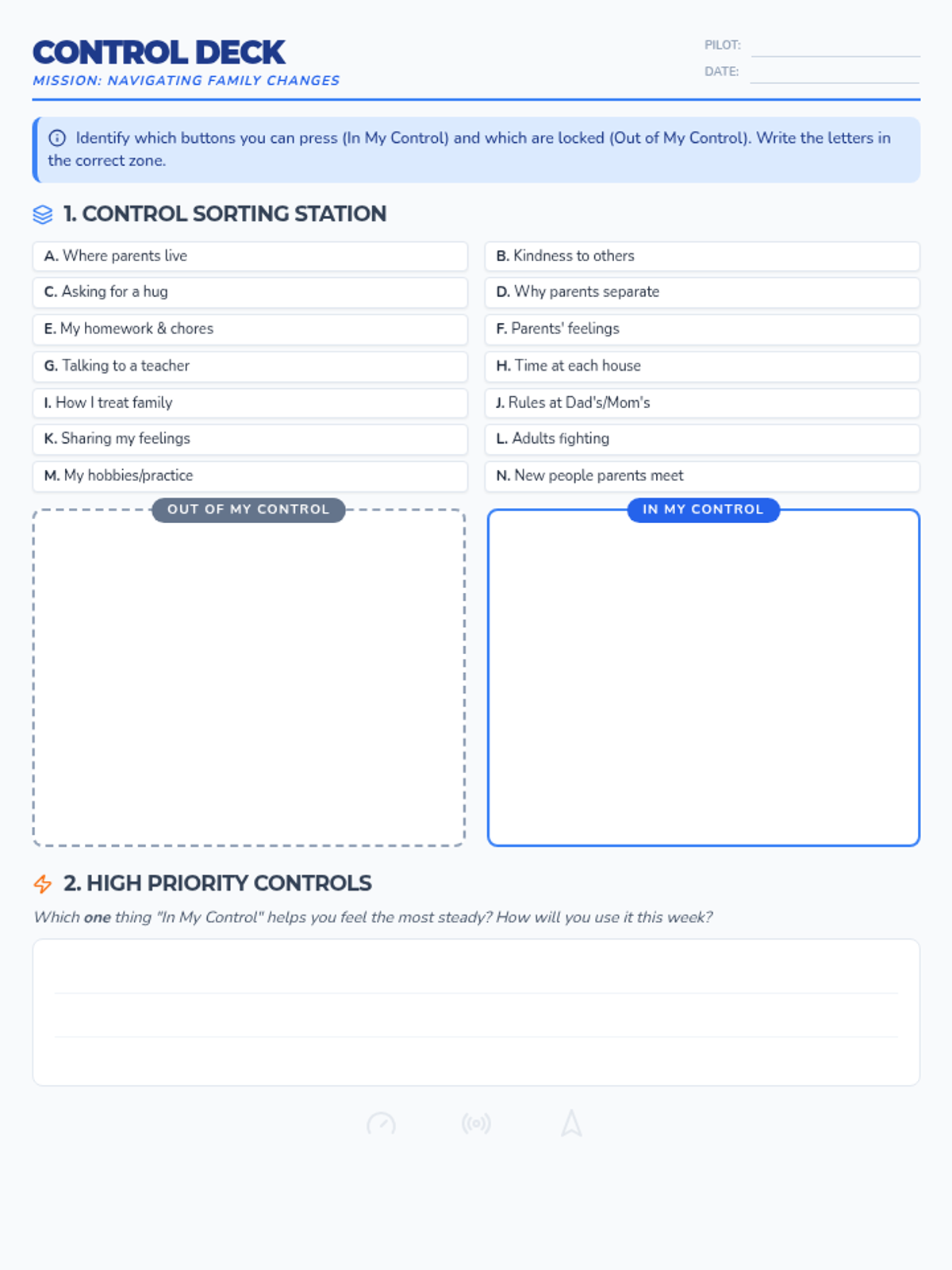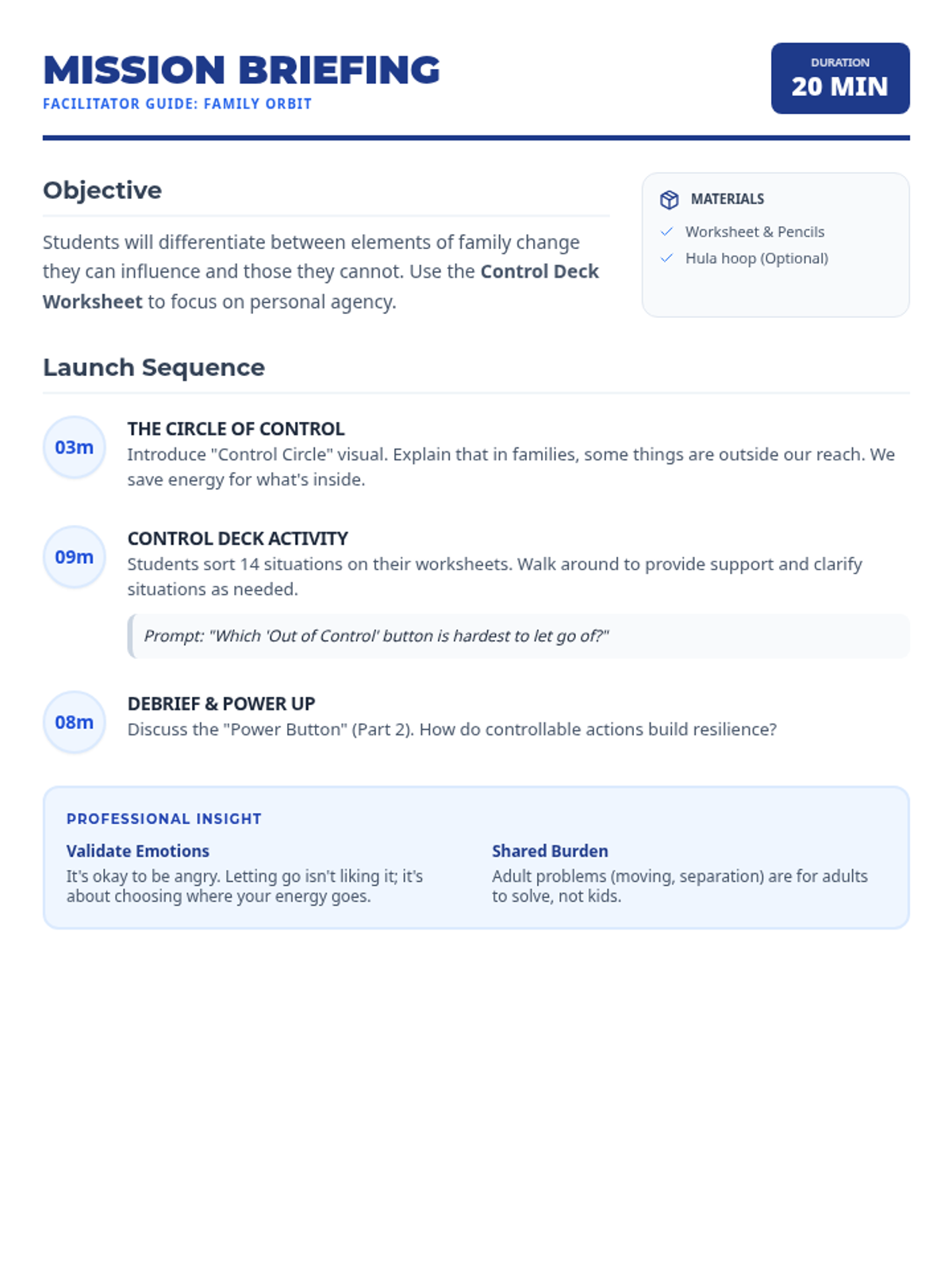 A short, high-impact 20-minute session for 4th graders to distinguish between controllable and uncontrollable factors during family changes. Students explore coping strategies by focusing their energy on what they can influence.