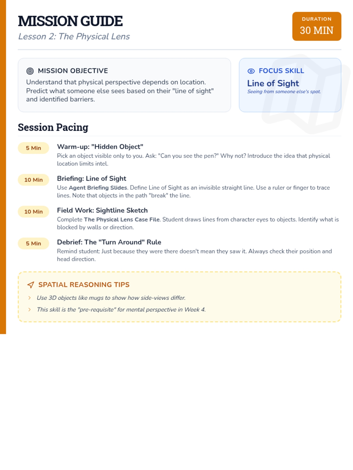 Focuses on physical perspective—understanding that what someone else sees depends on where they are standing. Includes activities on "Line of Sight."