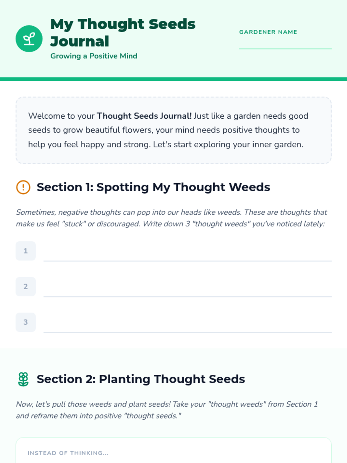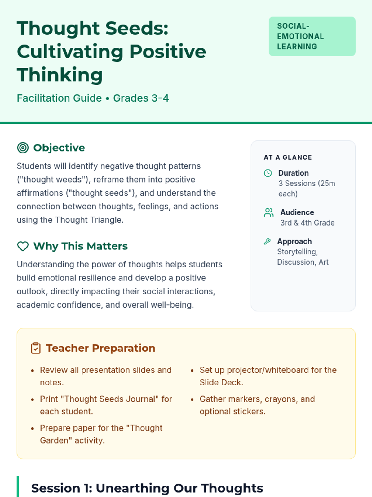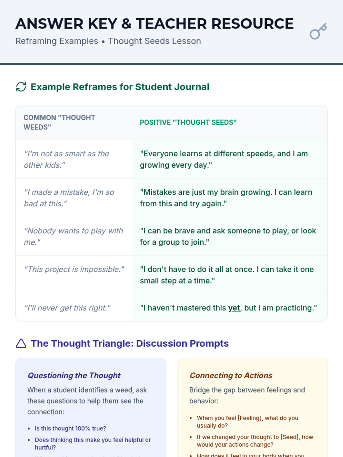 A 3-session social-emotional learning lesson for 3rd and 4th graders focused on identifying negative thought patterns (weeds) and reframing them into positive affirmations (seeds) using the Thought Triangle.