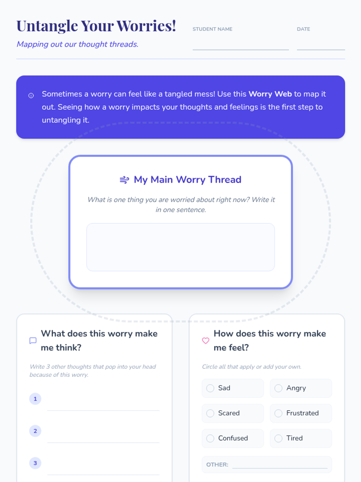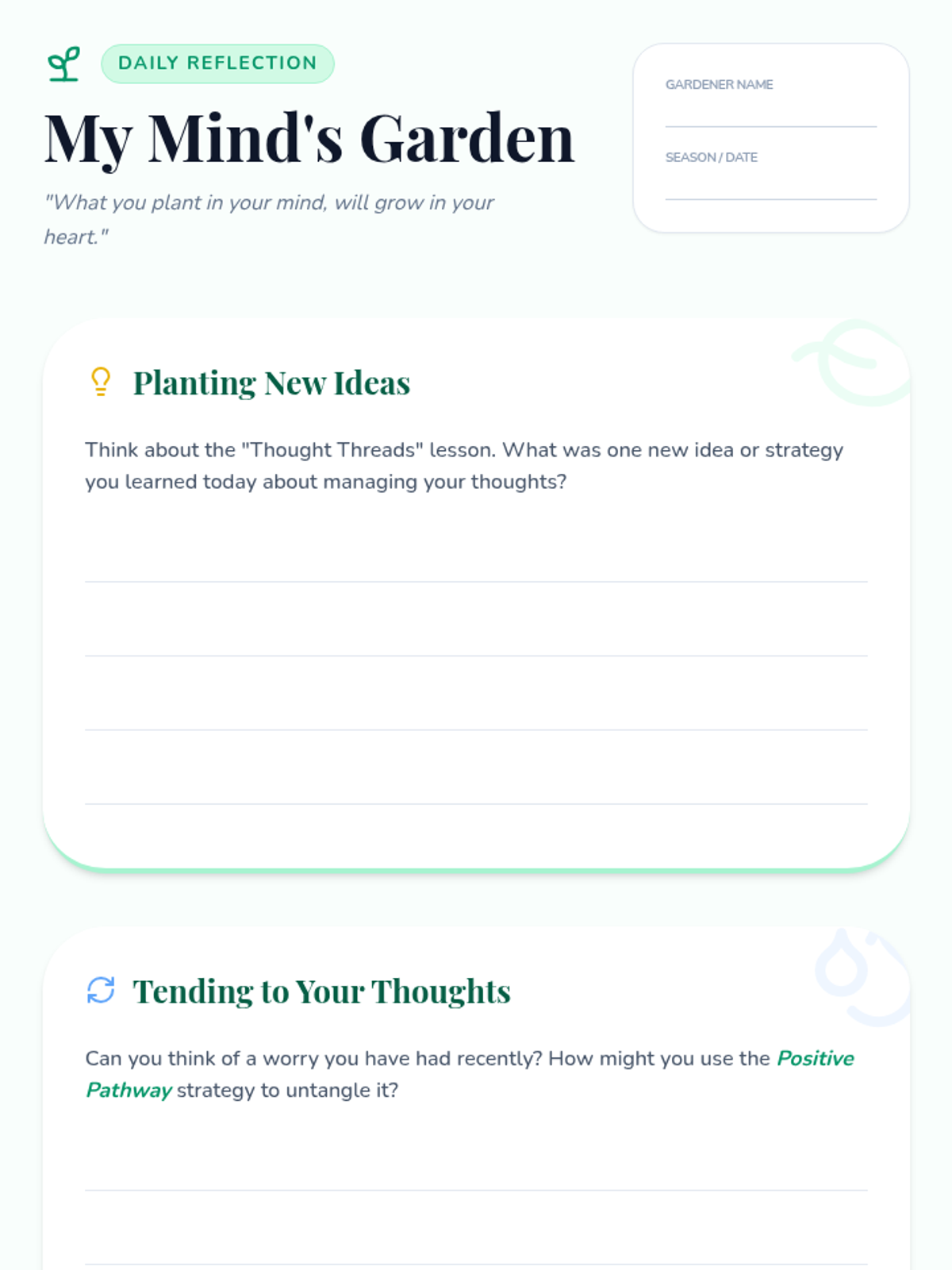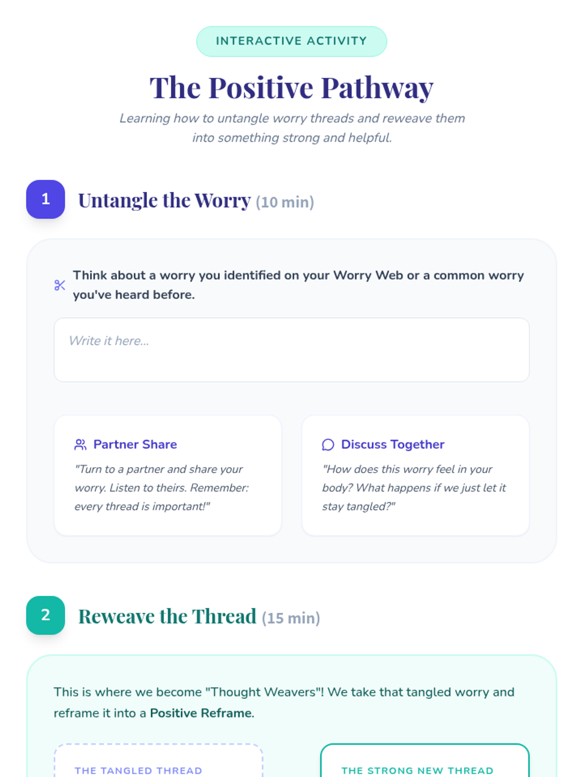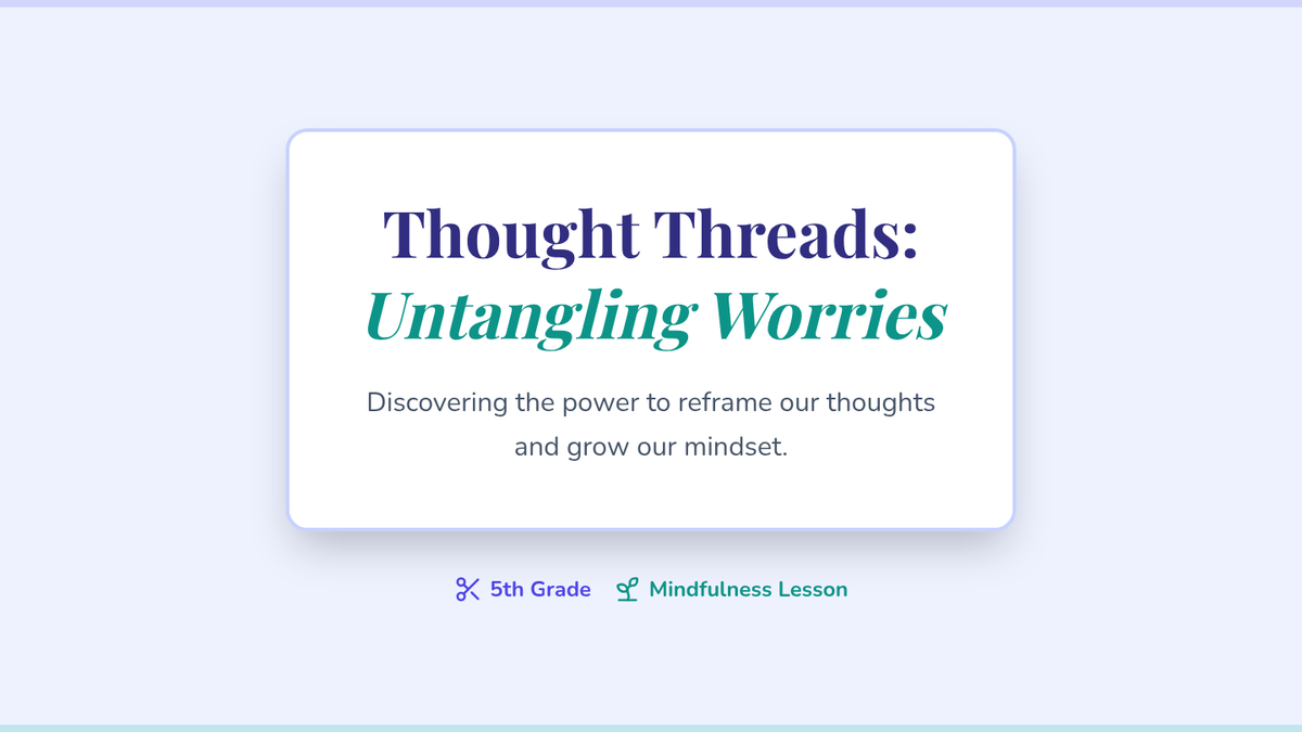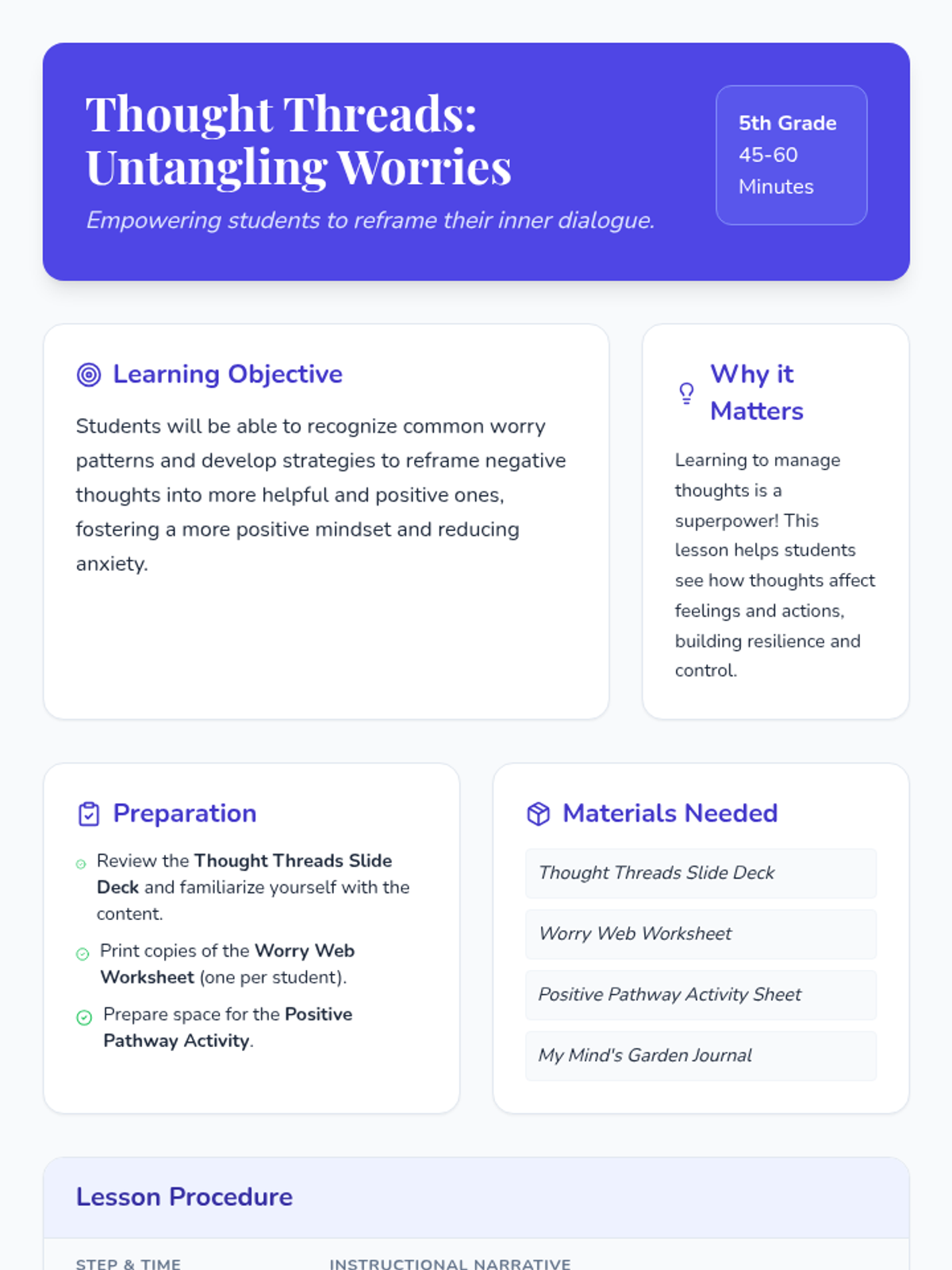 A 5th-grade lesson on recognizing worry patterns and reframing negative thoughts into positive 'threads'. Students will learn to 'untangle' challenging emotions using a 'Worry Web' and a garden-themed reflection journal.