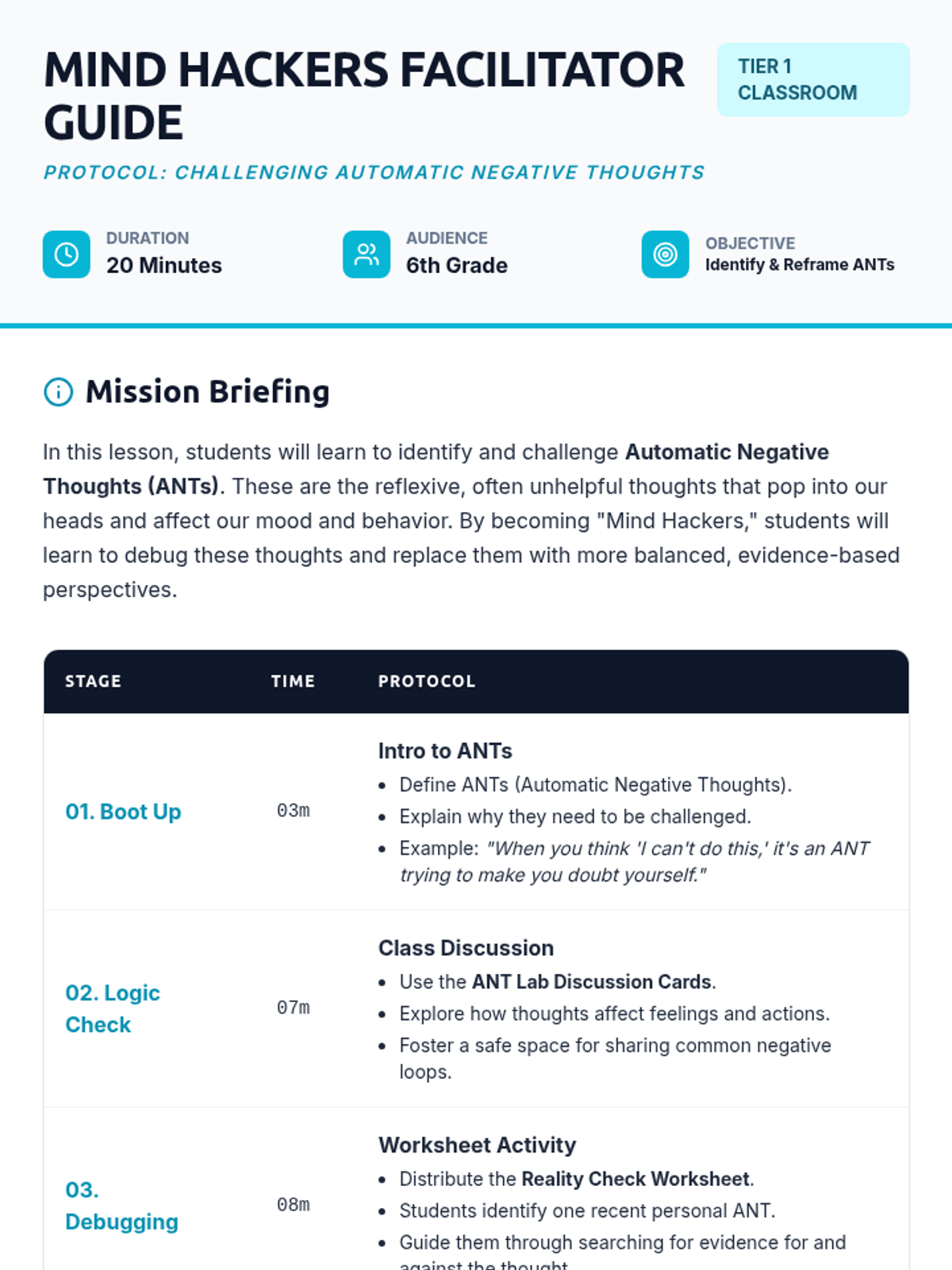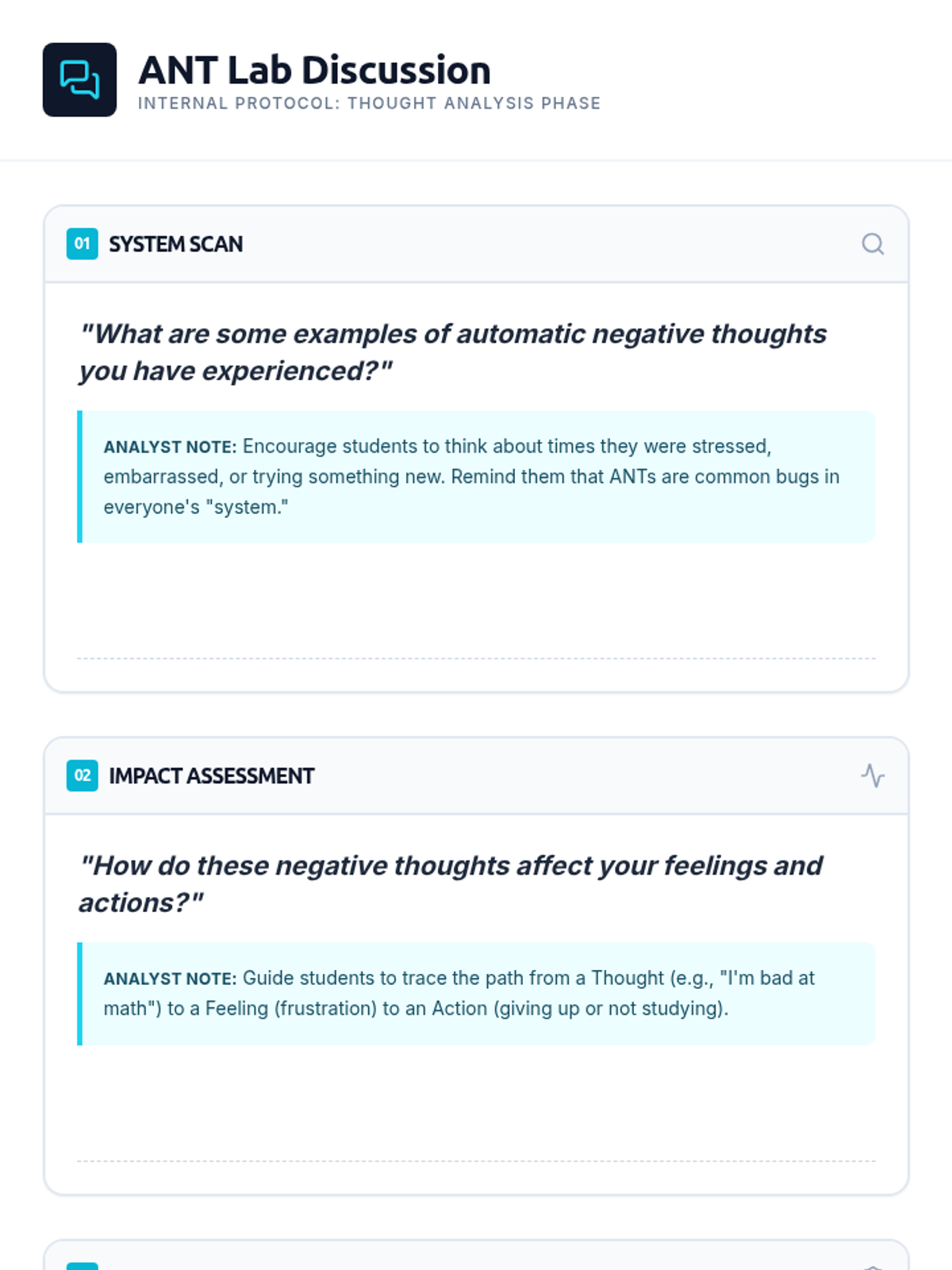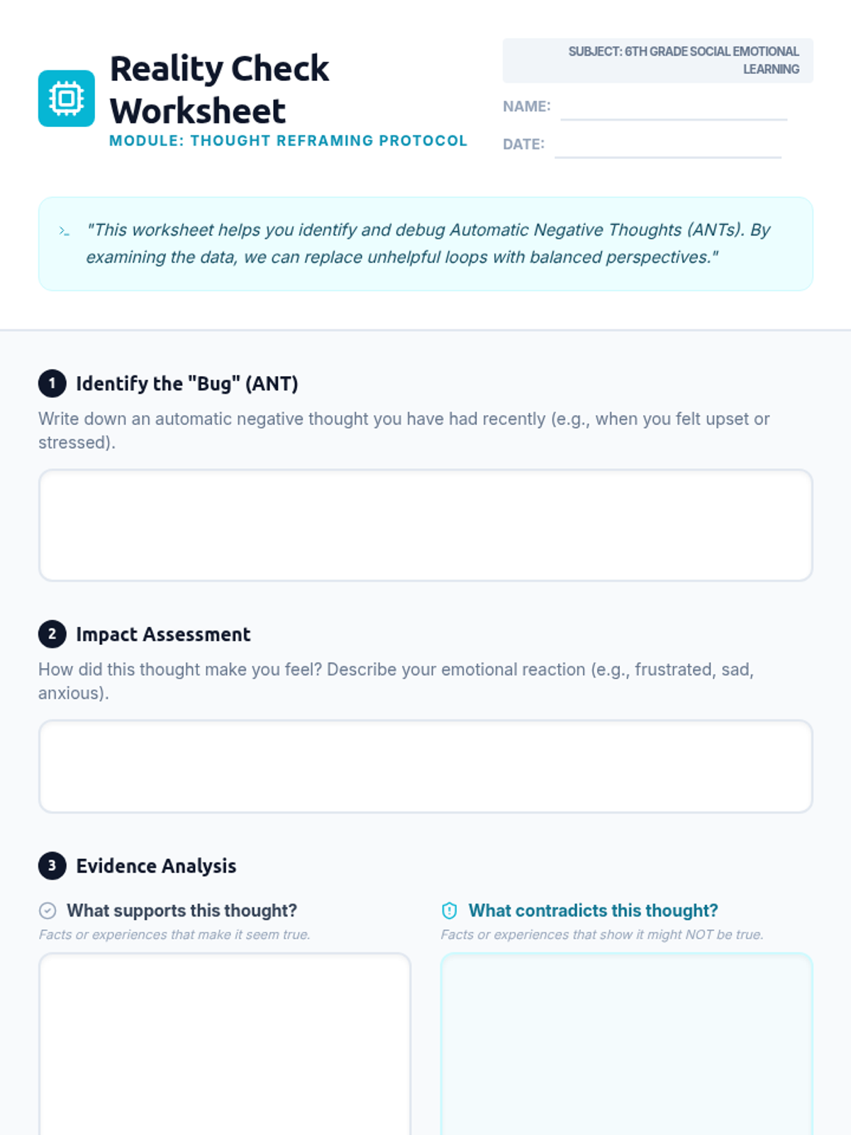 A lesson designed for 6th graders to identify 'Automatic Negative Thoughts' (ANTs) and use evidence-based reframing techniques to foster mental well-being and a positive self-image.