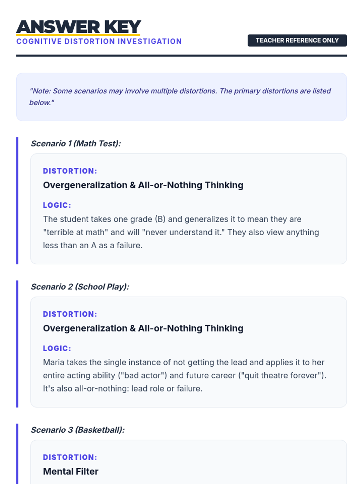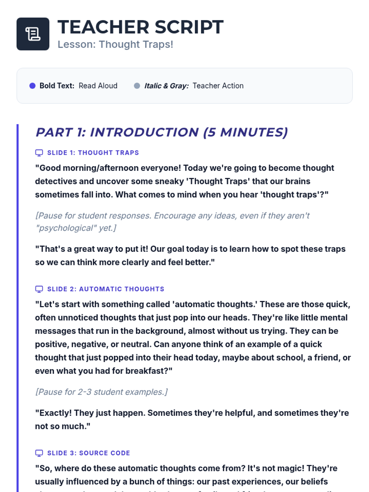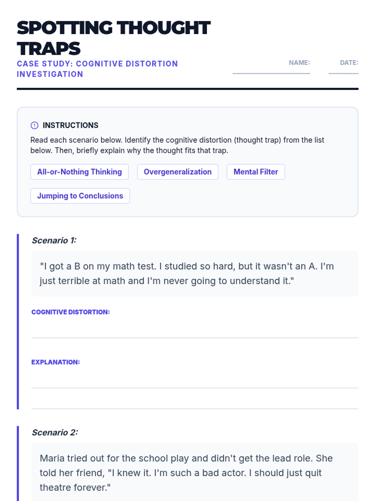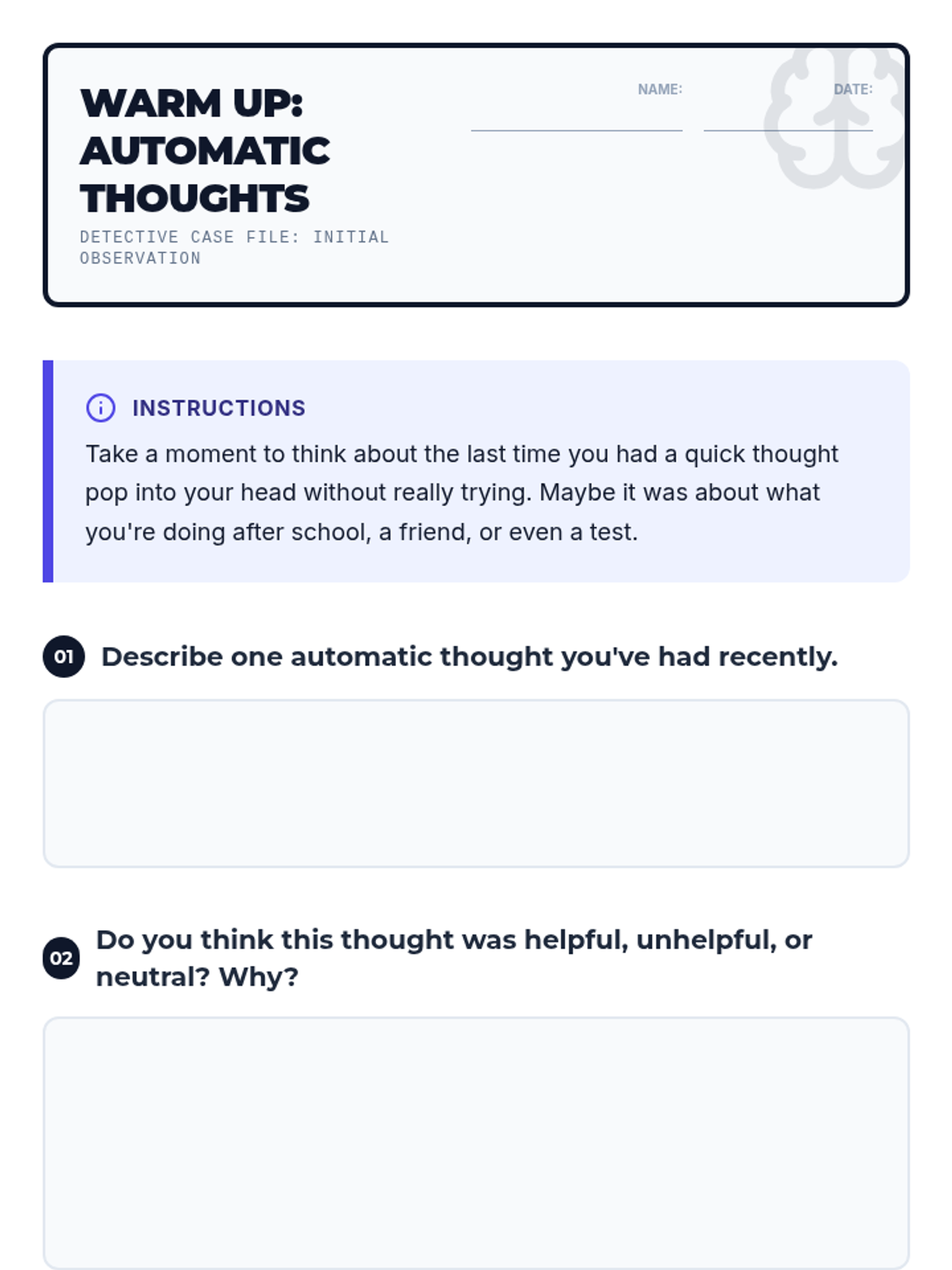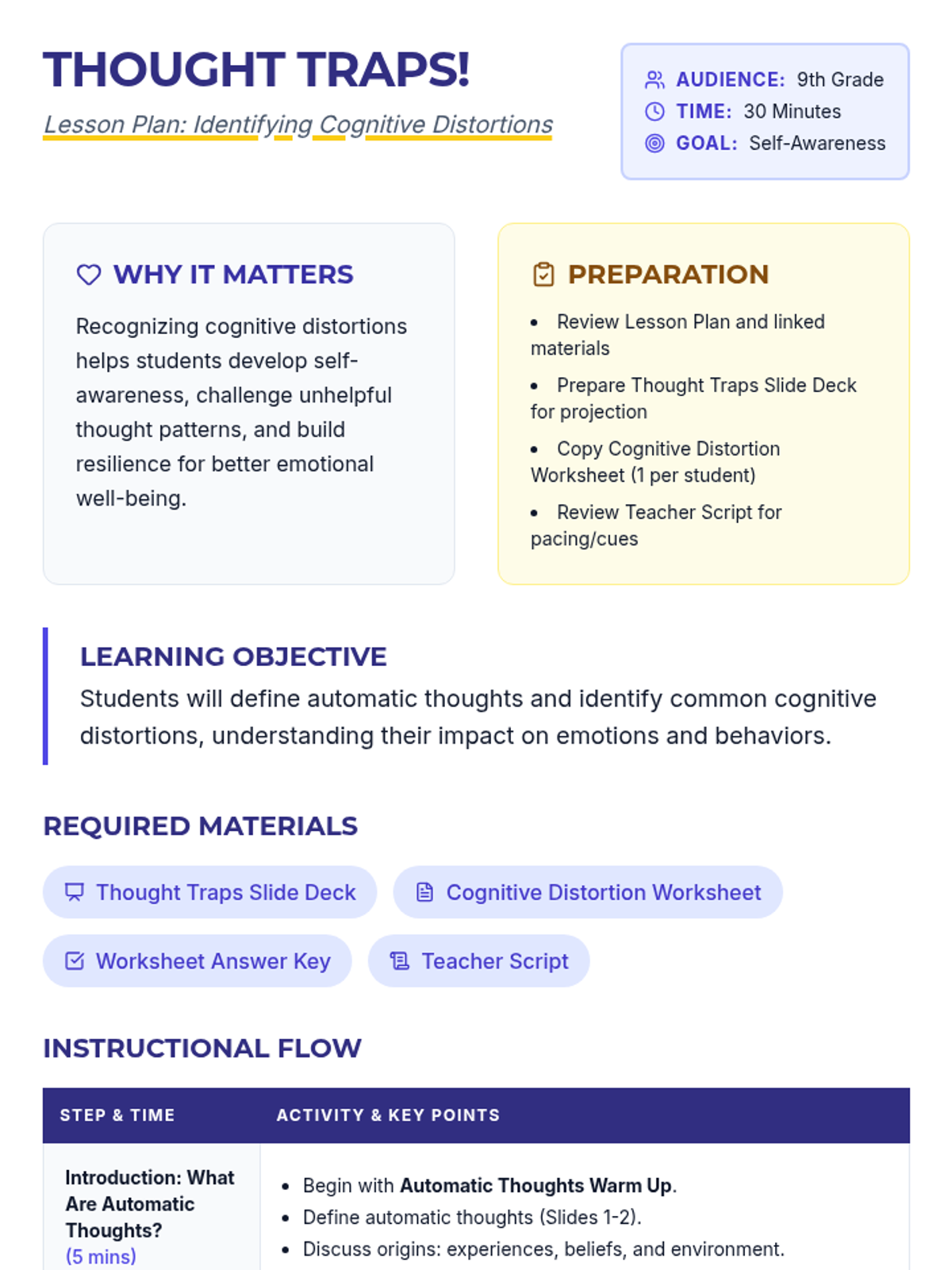 A 30-minute lesson for 9th-grade students to identify automatic thoughts and cognitive distortions, helping them develop self-awareness and healthier emotional responses.