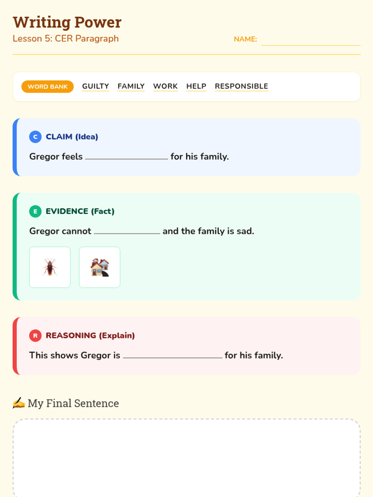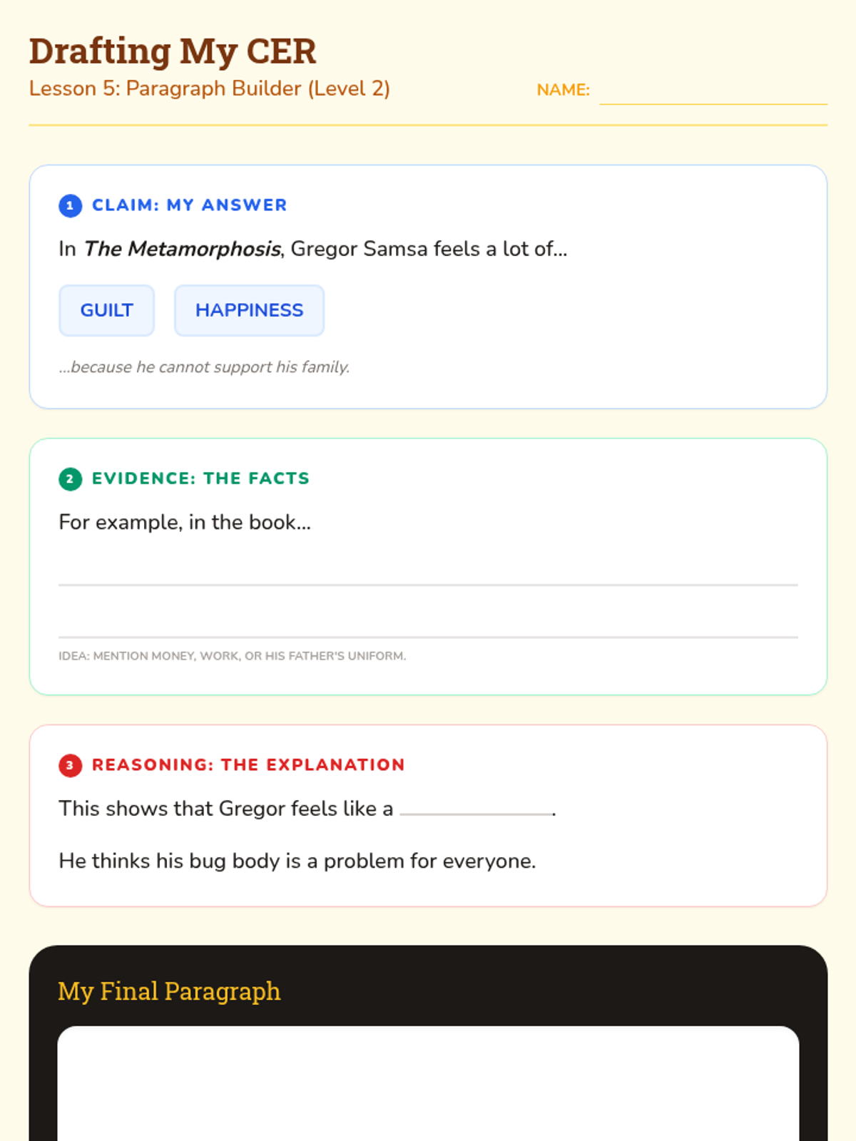 Guides the student through the construction of a Claim-Evidence-Reasoning paragraph using a highly scaffolded template and word bank.
