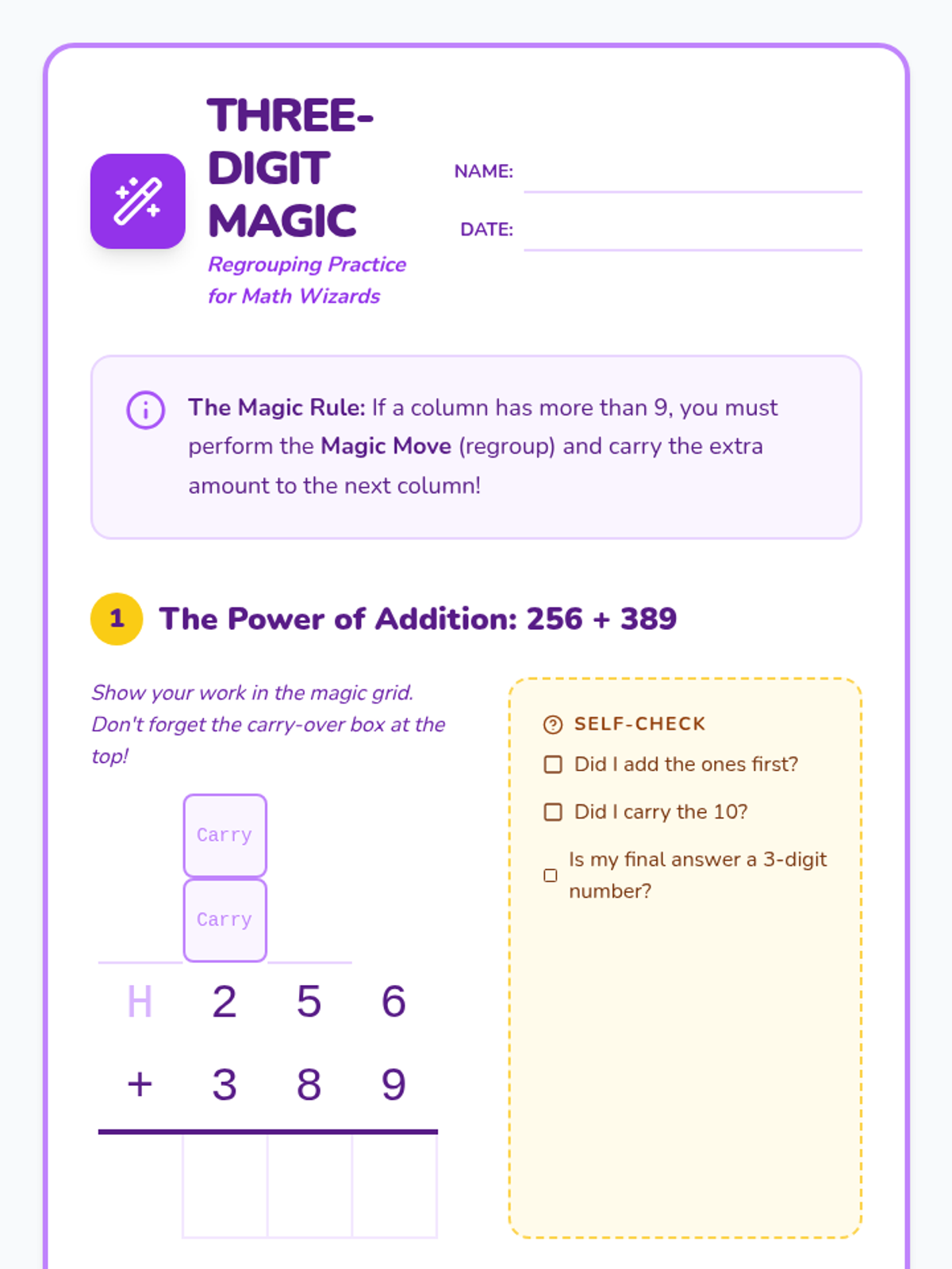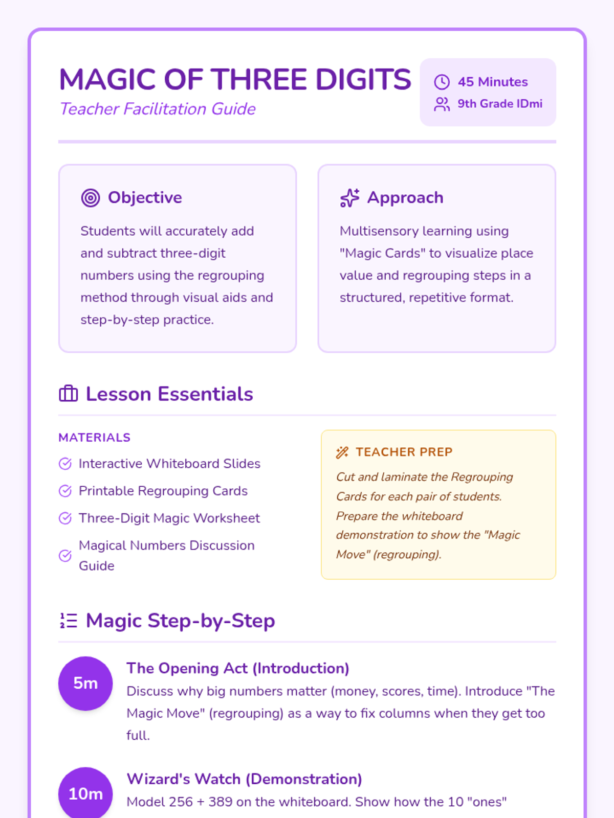 Students embark on a magical journey to master three-digit addition and subtraction with regrouping. This lesson uses visual tools and interactive activities to build confidence in handling complex math problems for 9th-grade students with IDmi.