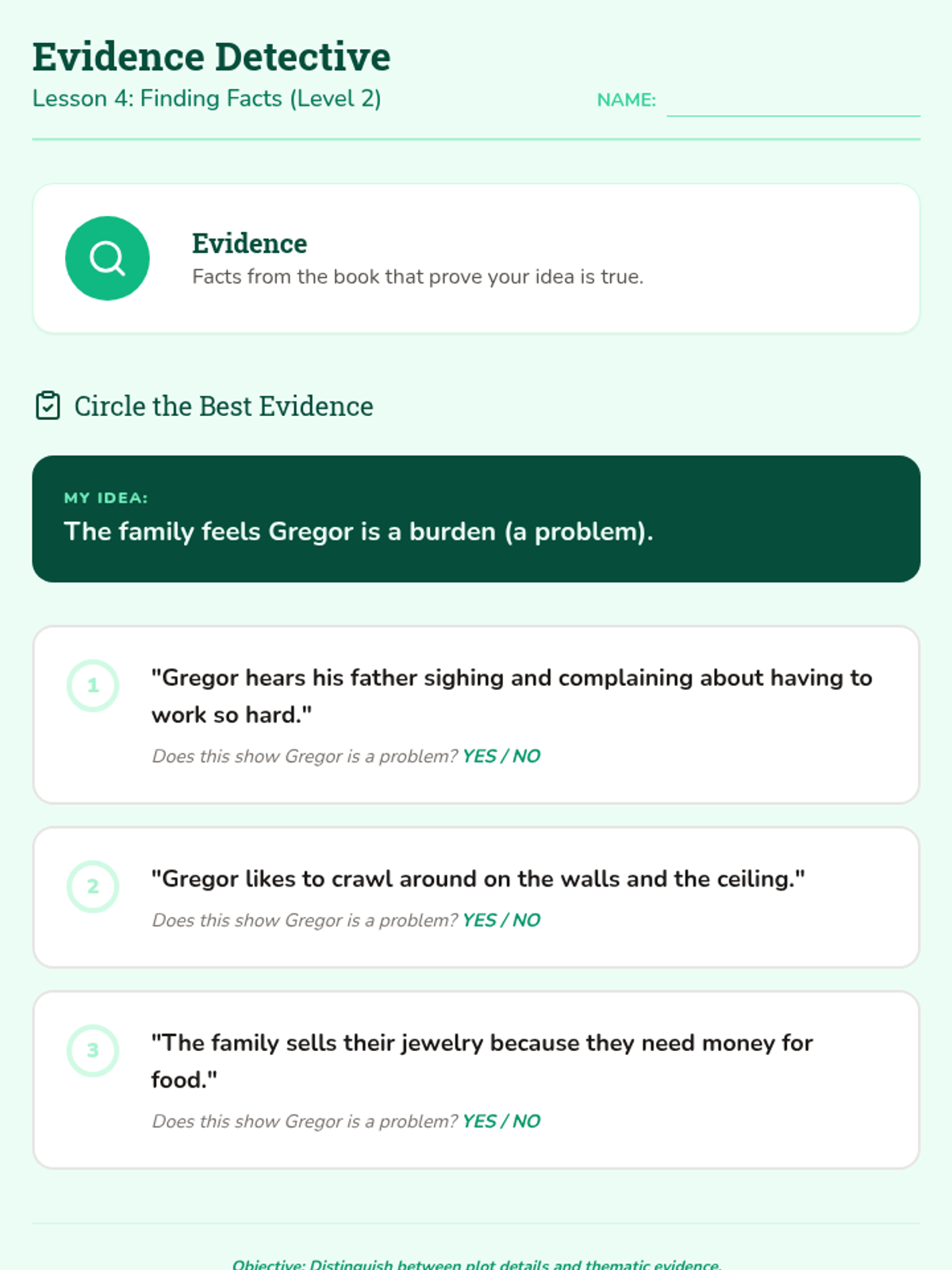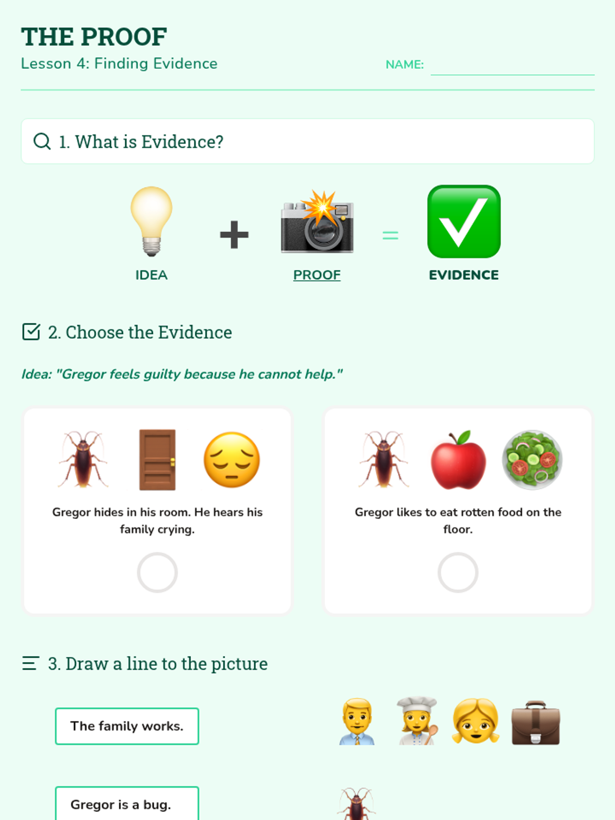 Teaches the student how to identify 'evidence' by selecting images and simple phrases that show family tension and responsibility.