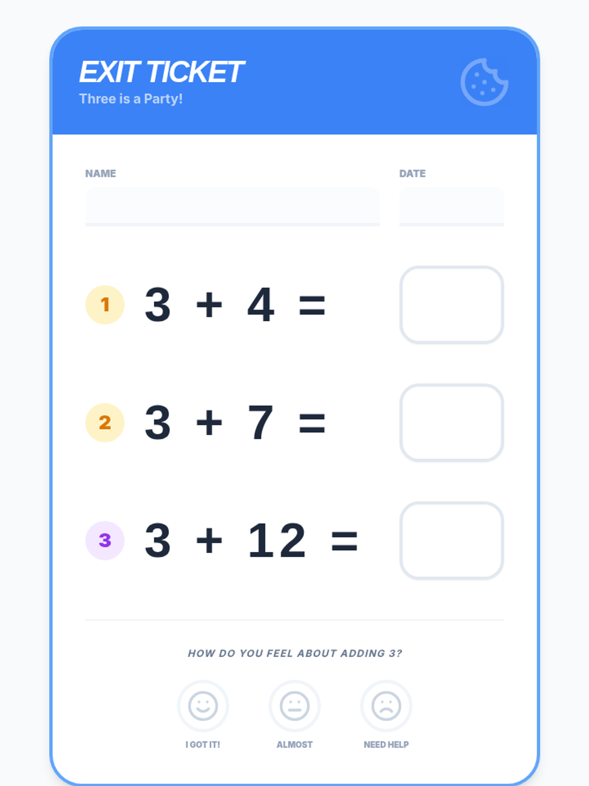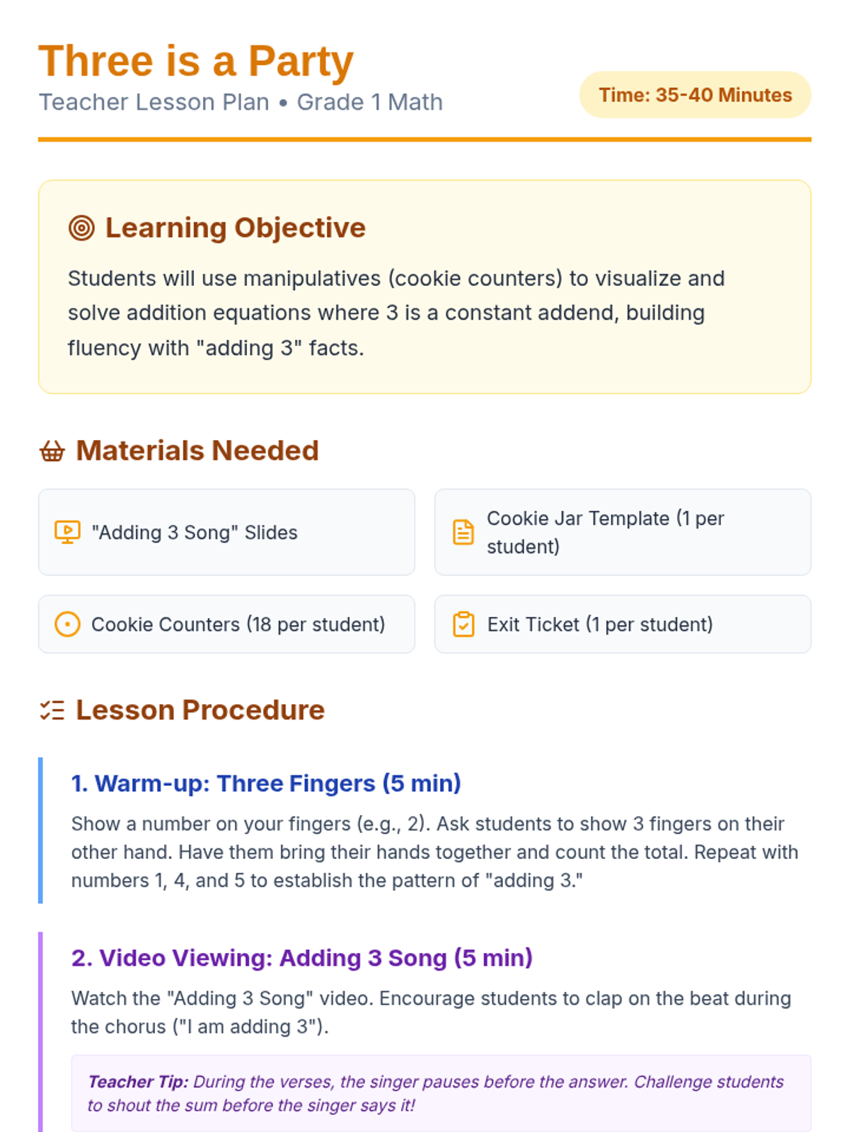 A 1st-grade math lesson focused on adding 3 to various numbers using a catchy song, a cookie jar visual model, and hands-on manipulatives to build addition fluency.