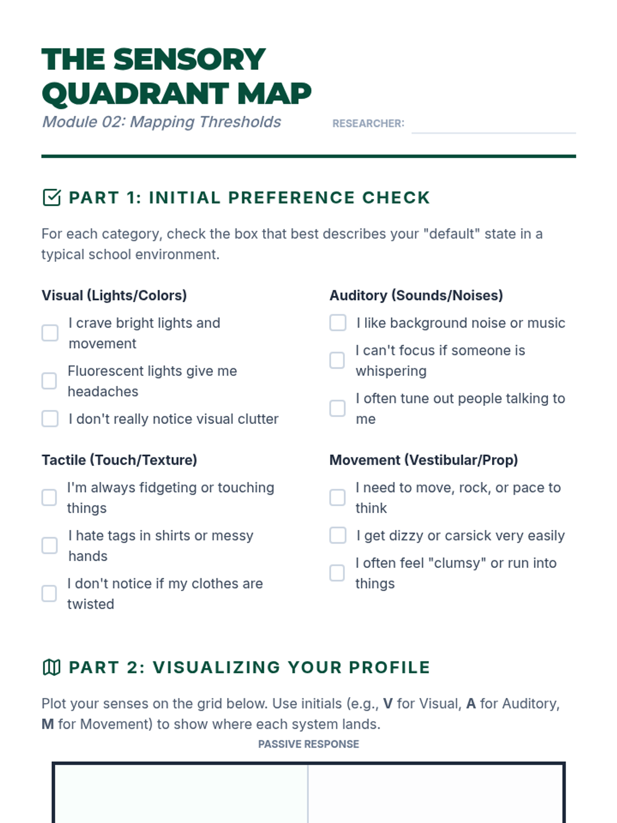 Learners analyze neurological thresholds to identify their patterns as seekers, avoiders, sensors, or bystanders across different sensory inputs.