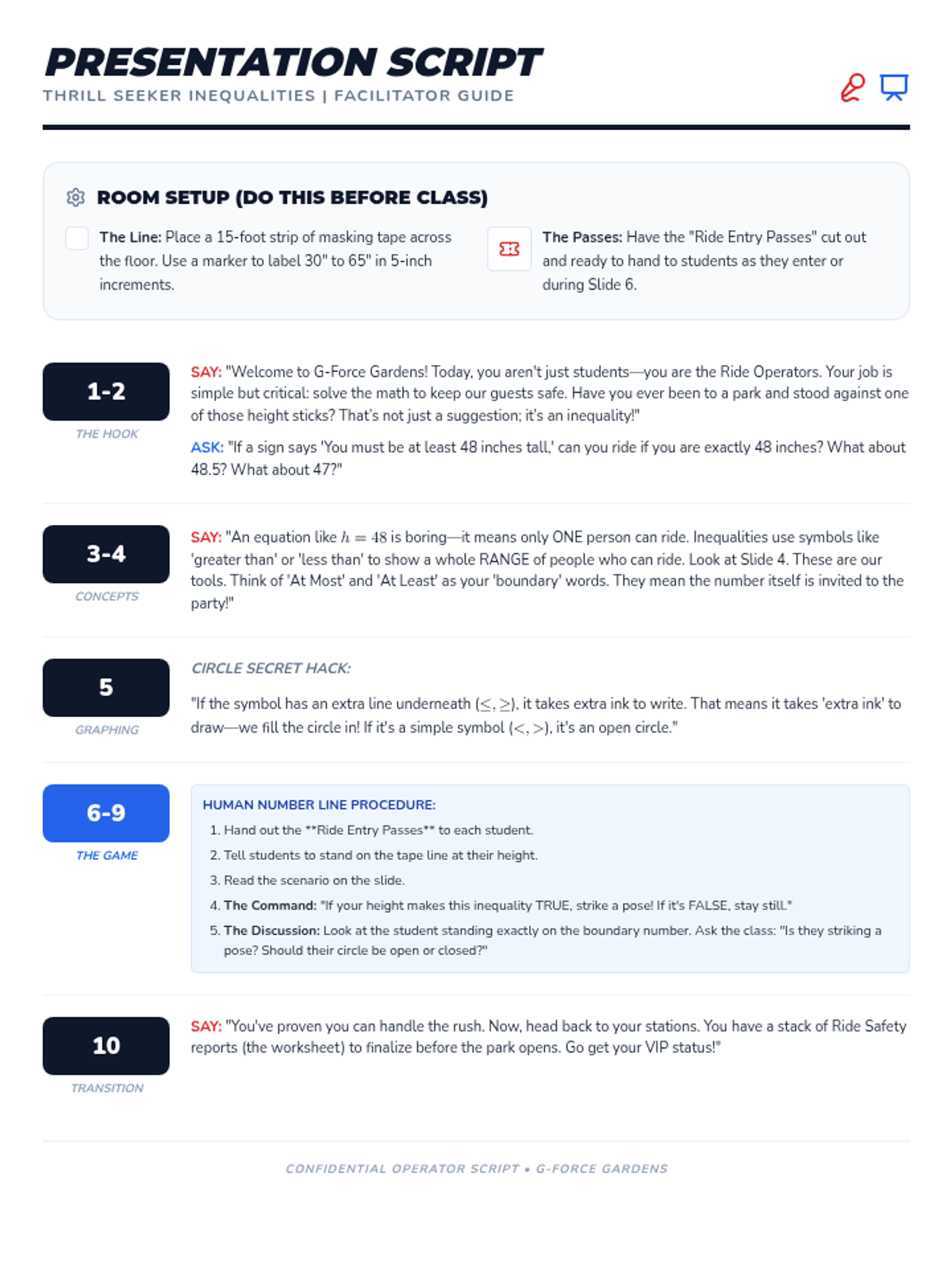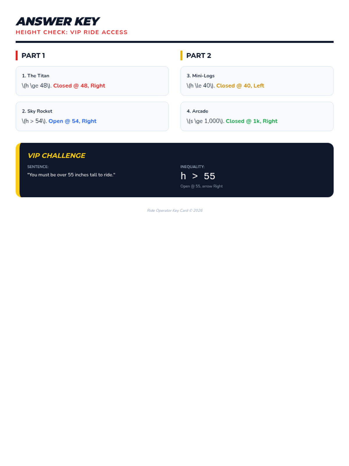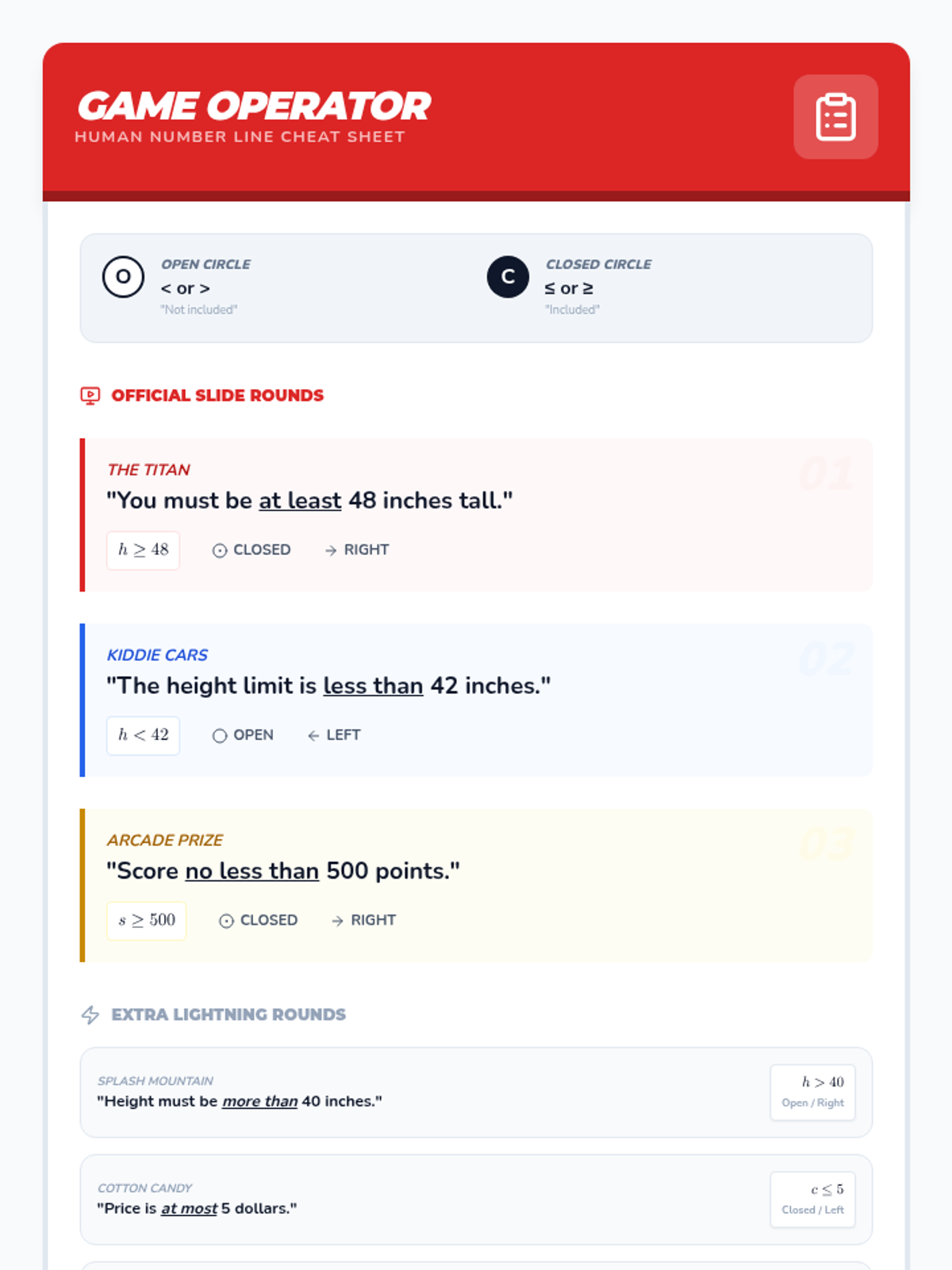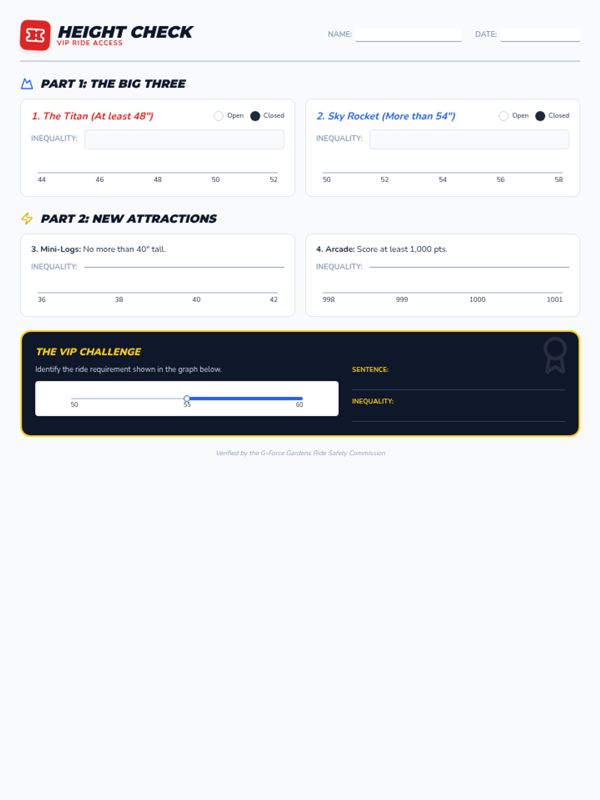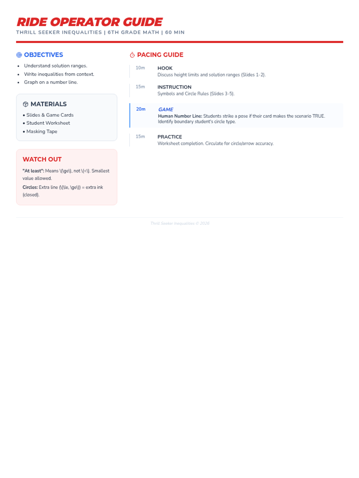 A 60-minute 6th grade math lesson using an amusement park theme to teach writing and graphing inequalities, featuring a high-energy human number line game.