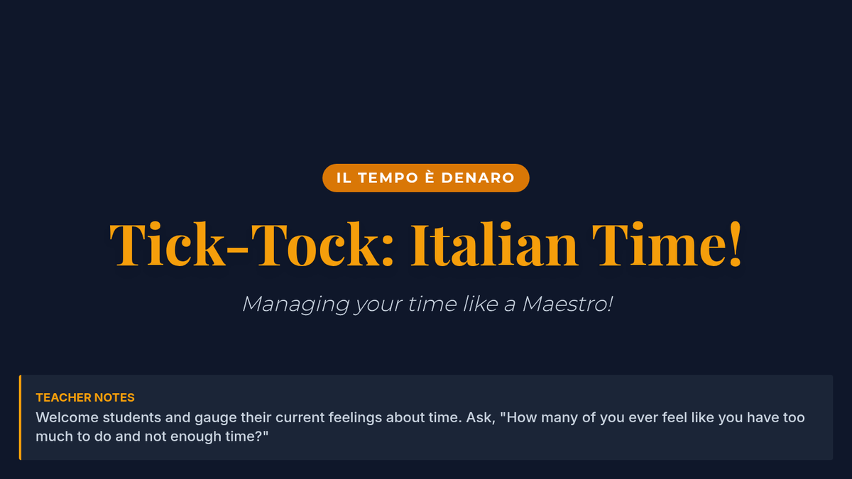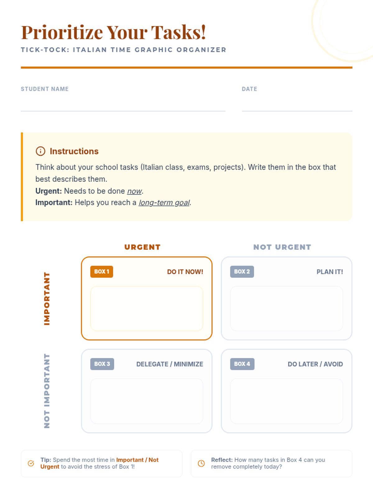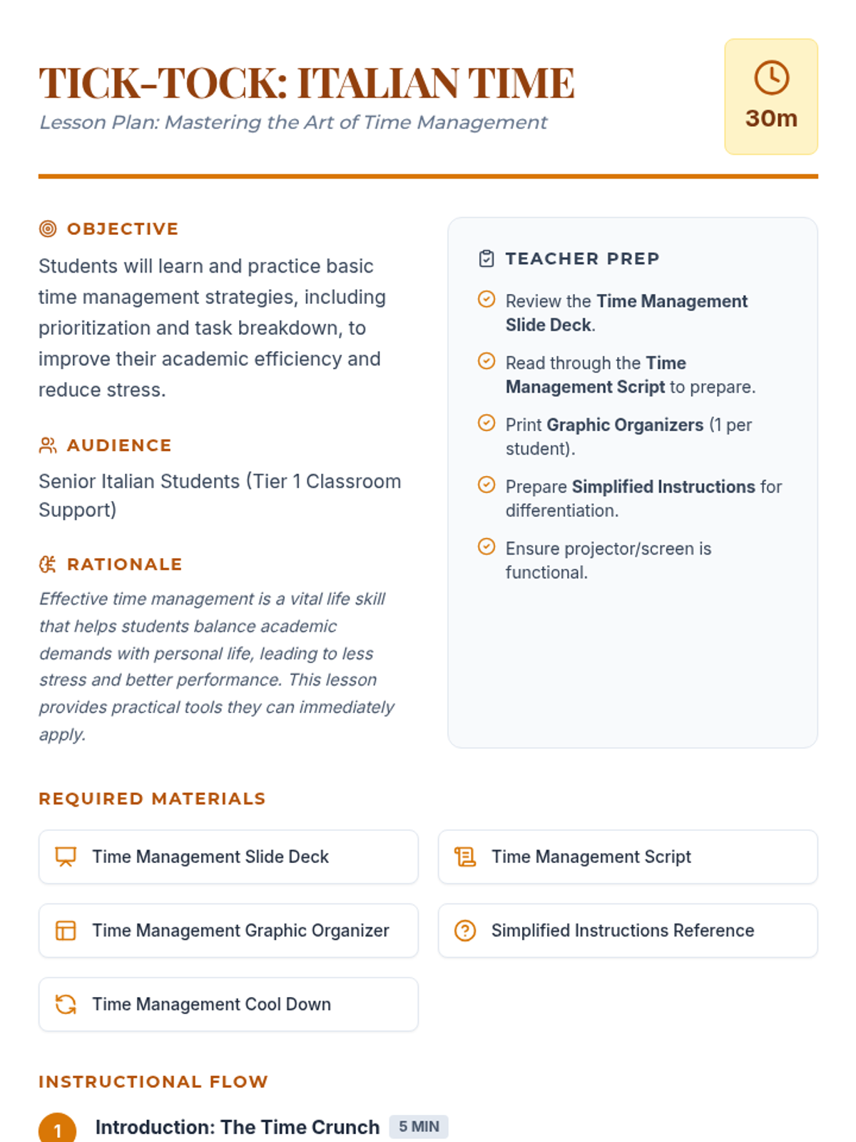 This lesson helps senior Italian students develop essential time management skills, crucial for academic success and daily life. It's a single 30-minute session for the entire classroom.