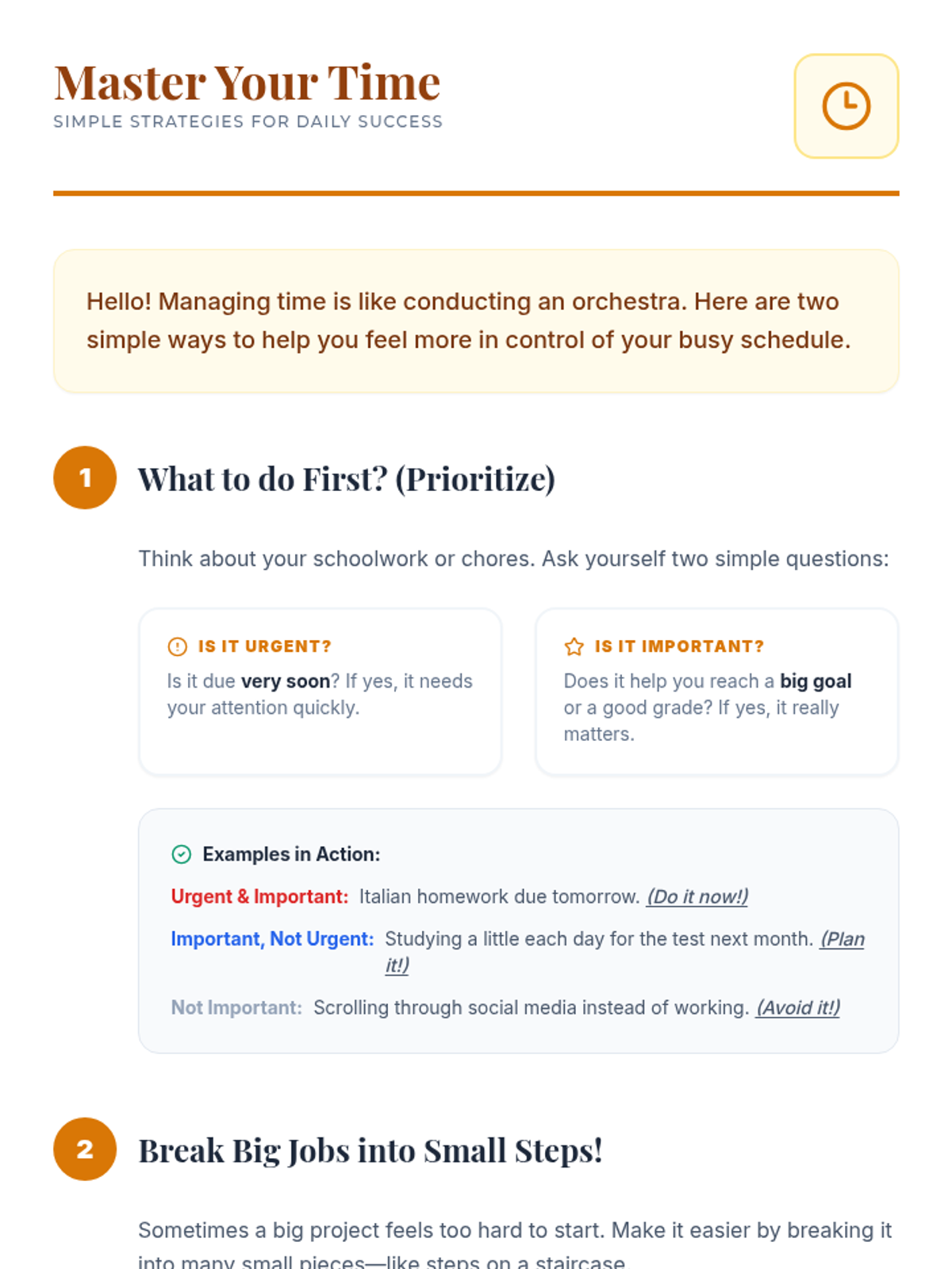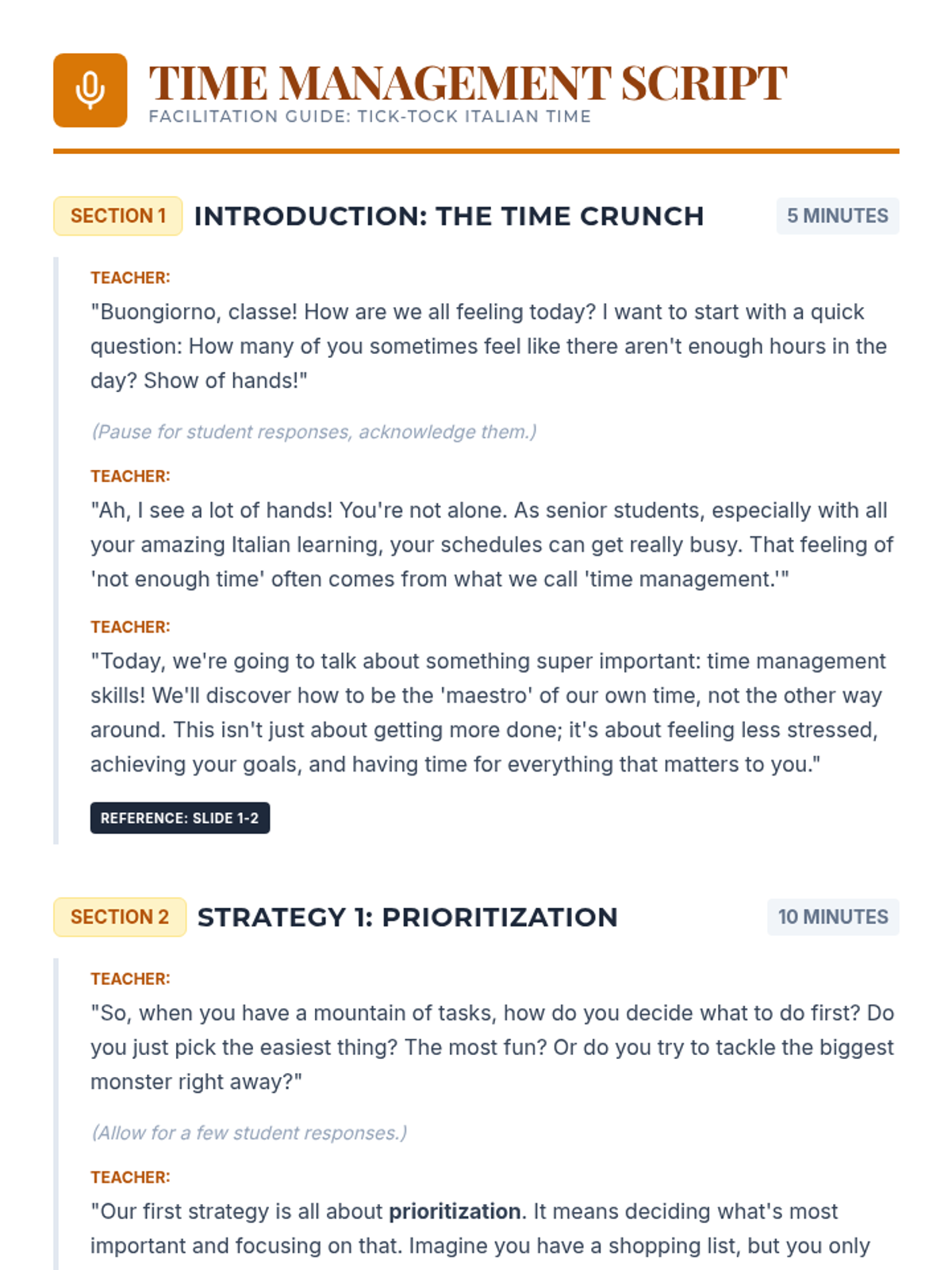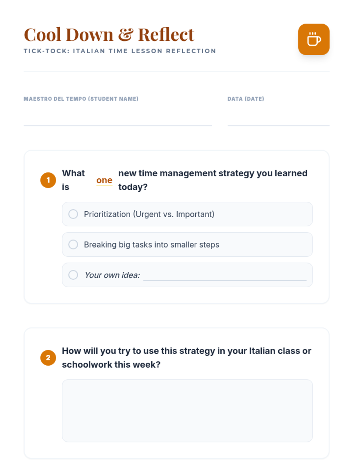 This lesson helps senior Italian students develop essential time management skills, crucial for academic success and daily life. It's a single 30-minute session for the entire classroom.