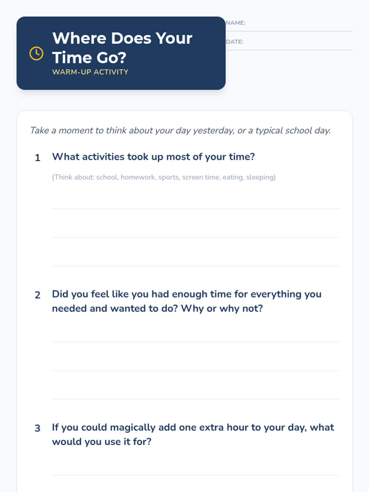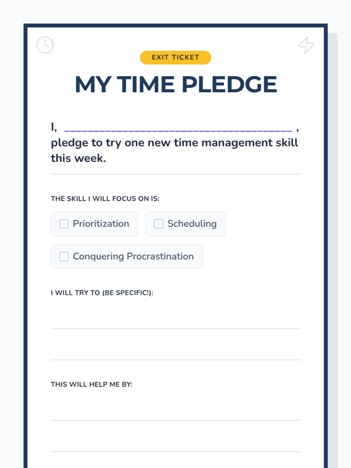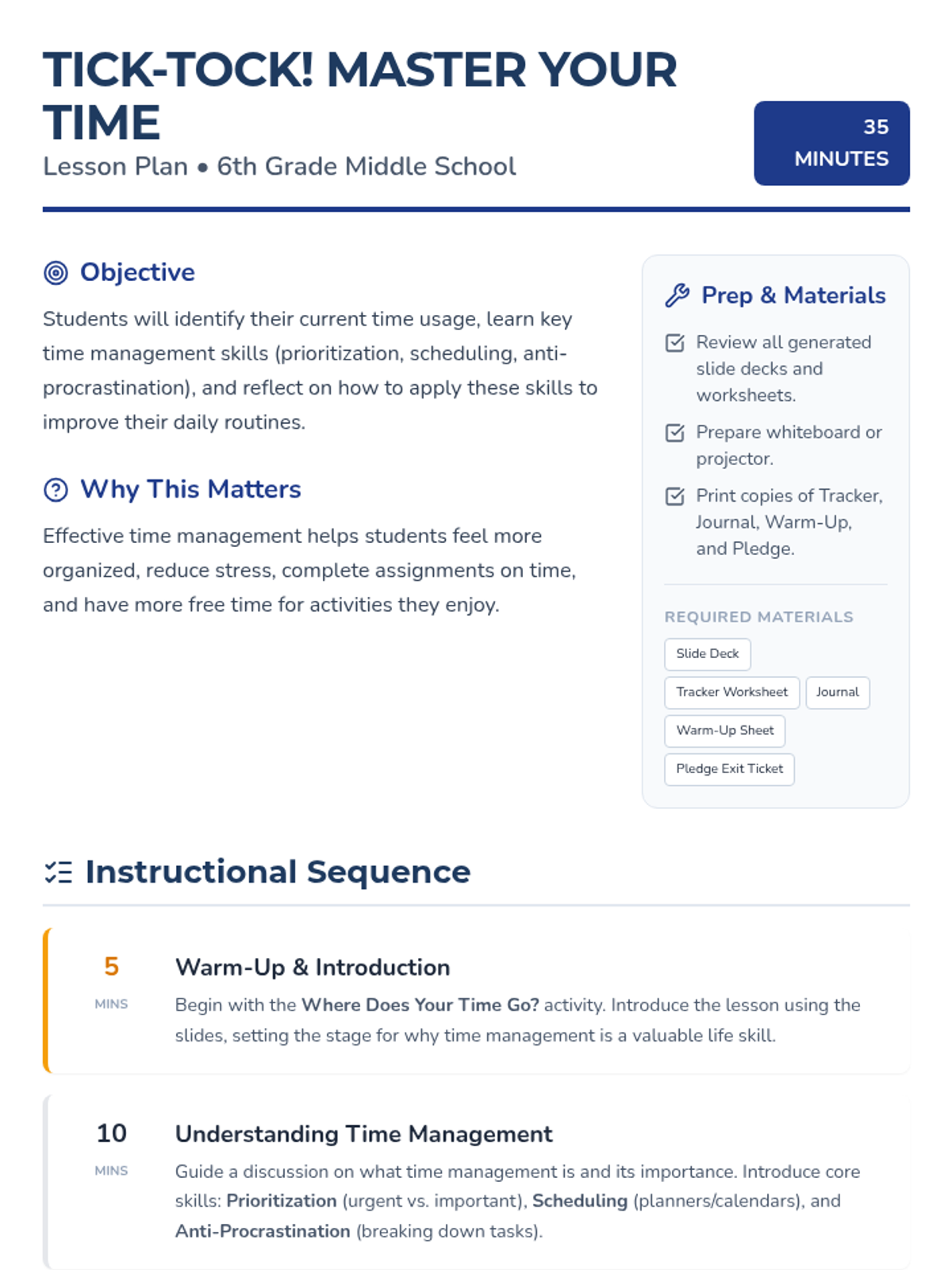 A 35-minute lesson for 6th-grade students on essential time management skills, including prioritization, scheduling, and overcoming procrastination.